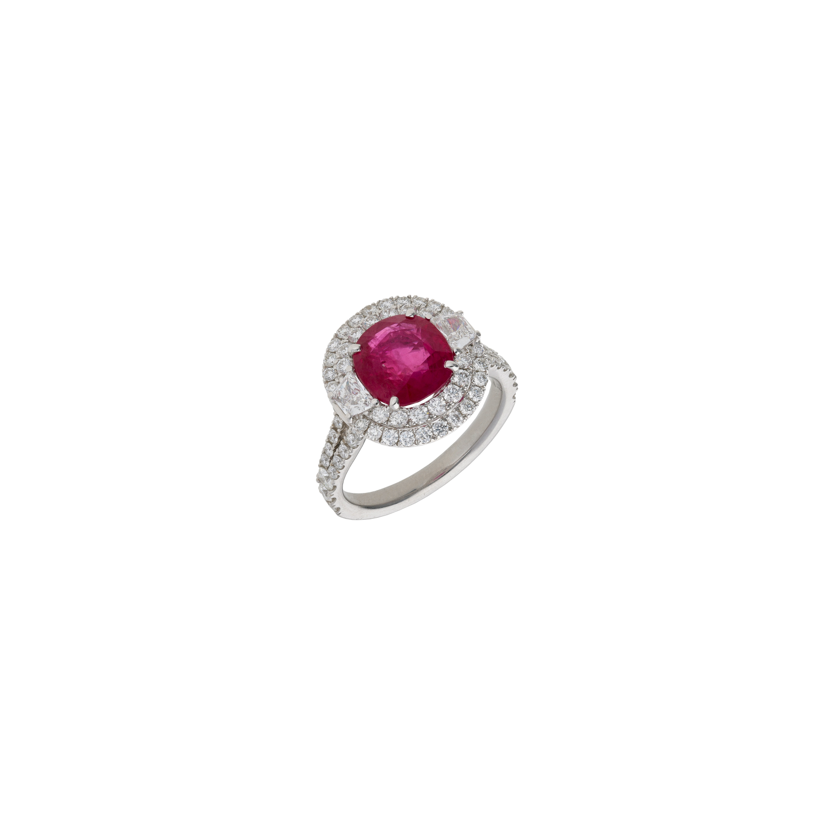 ANELLO IN ORO BIANCO 18 CARATI CON RUBINO TAGLIO CUSCINO CERTIFICATO GRS E DIAMANTI BIANCHI TAGLIO BRILLANTE CERTIFICATO GRS 2022-060588 (in originale)