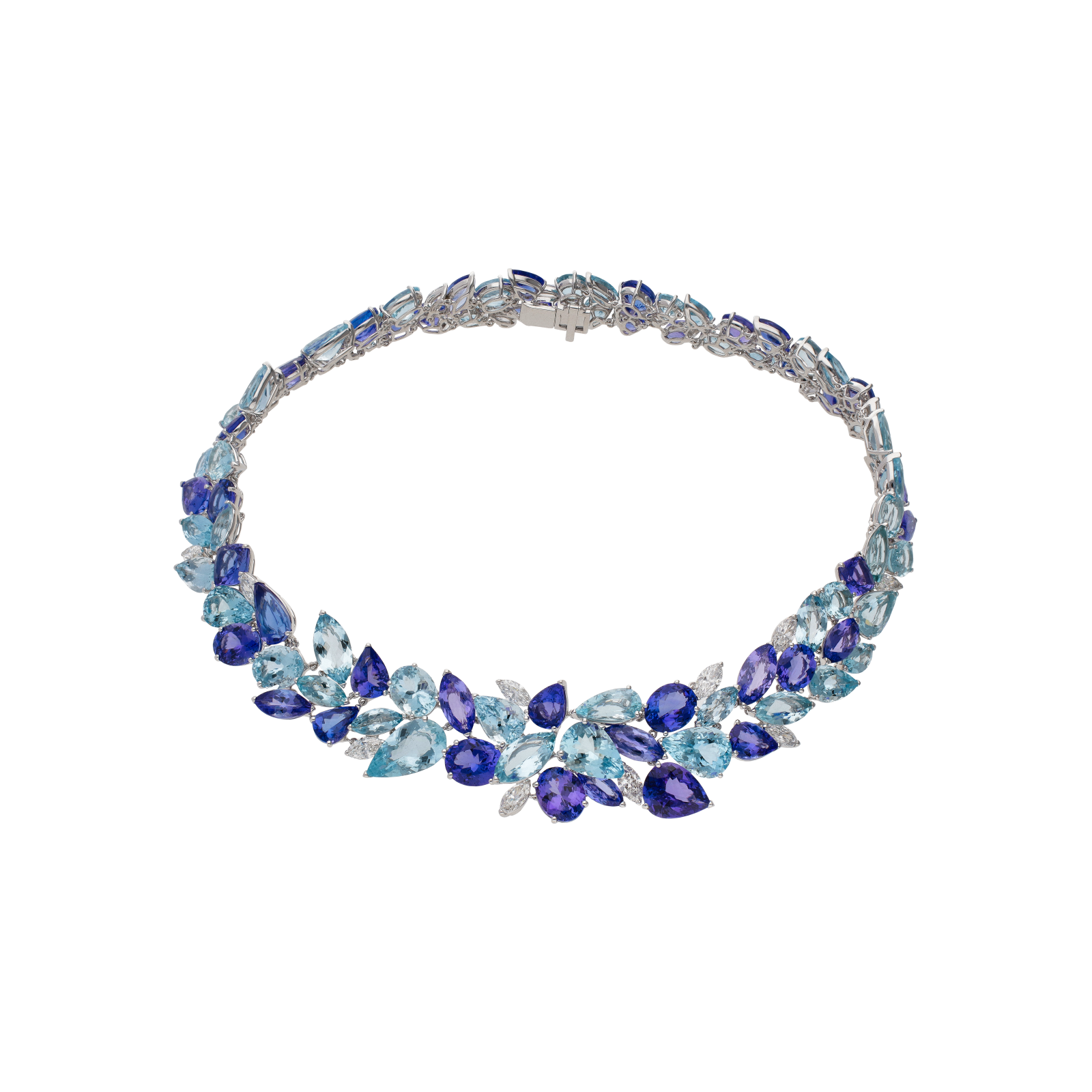 Collana In Oro Bianco 18 Carati Con Diamanti Bianchi Taglio Marquise, Acquamarina Taglio Ovale, Taglio Marquise, Taglio Goccia, Tanzanite Taglio Ovale, Taglio Marquise E Taglio Goccia