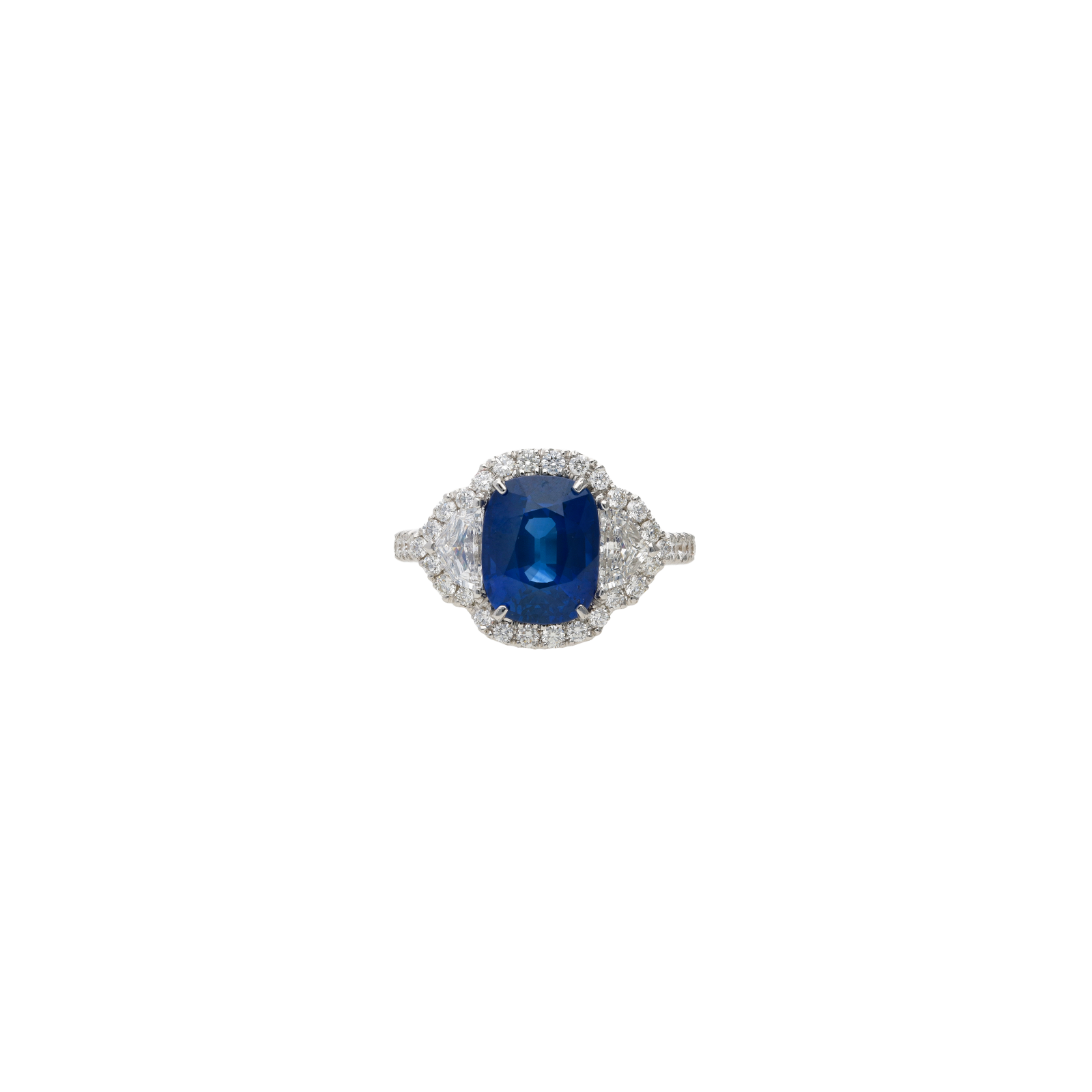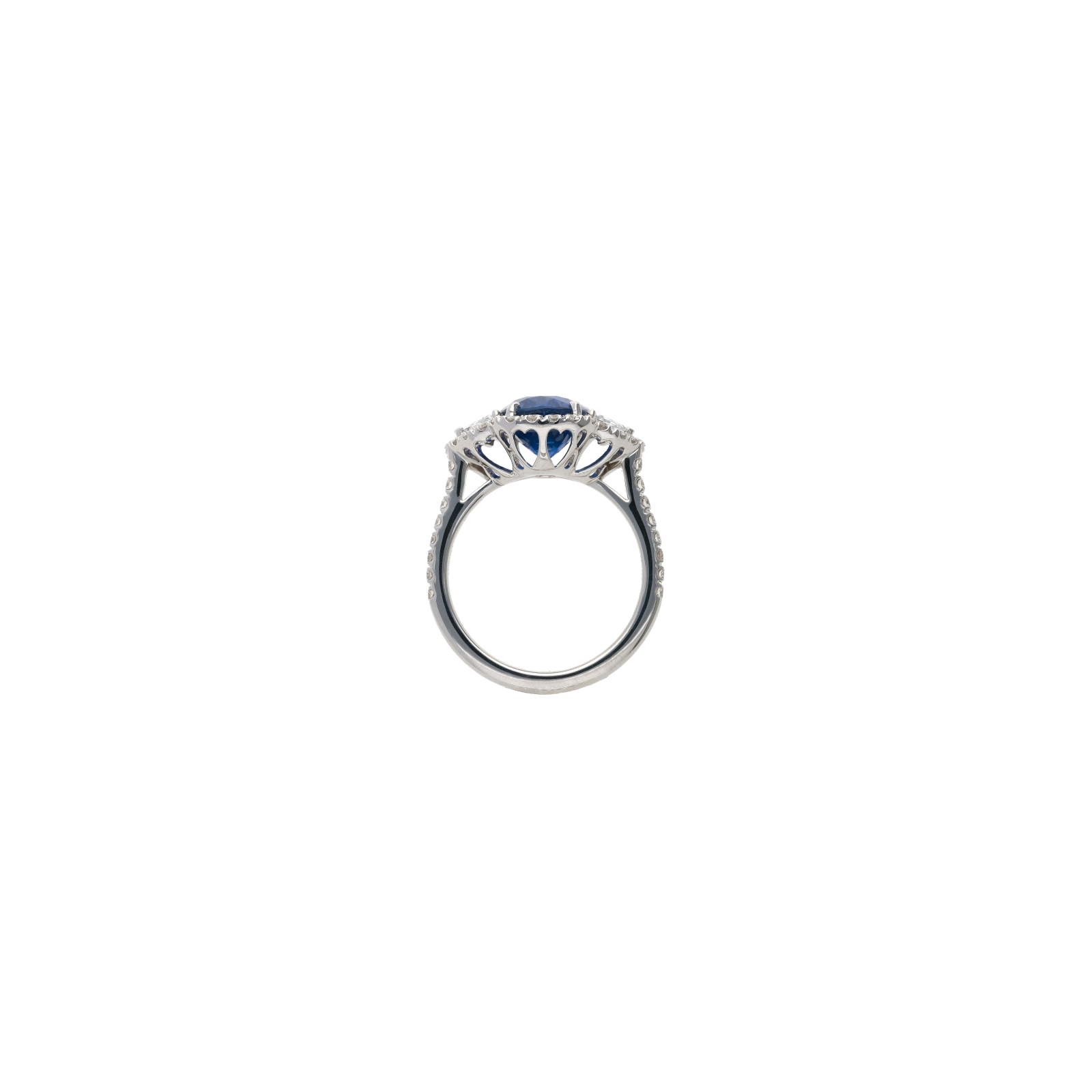 Anello in oro bianco con zaffiro blu centrale certificato, diamanti laterali e demi-pavé di diamanti - 000-4911NS