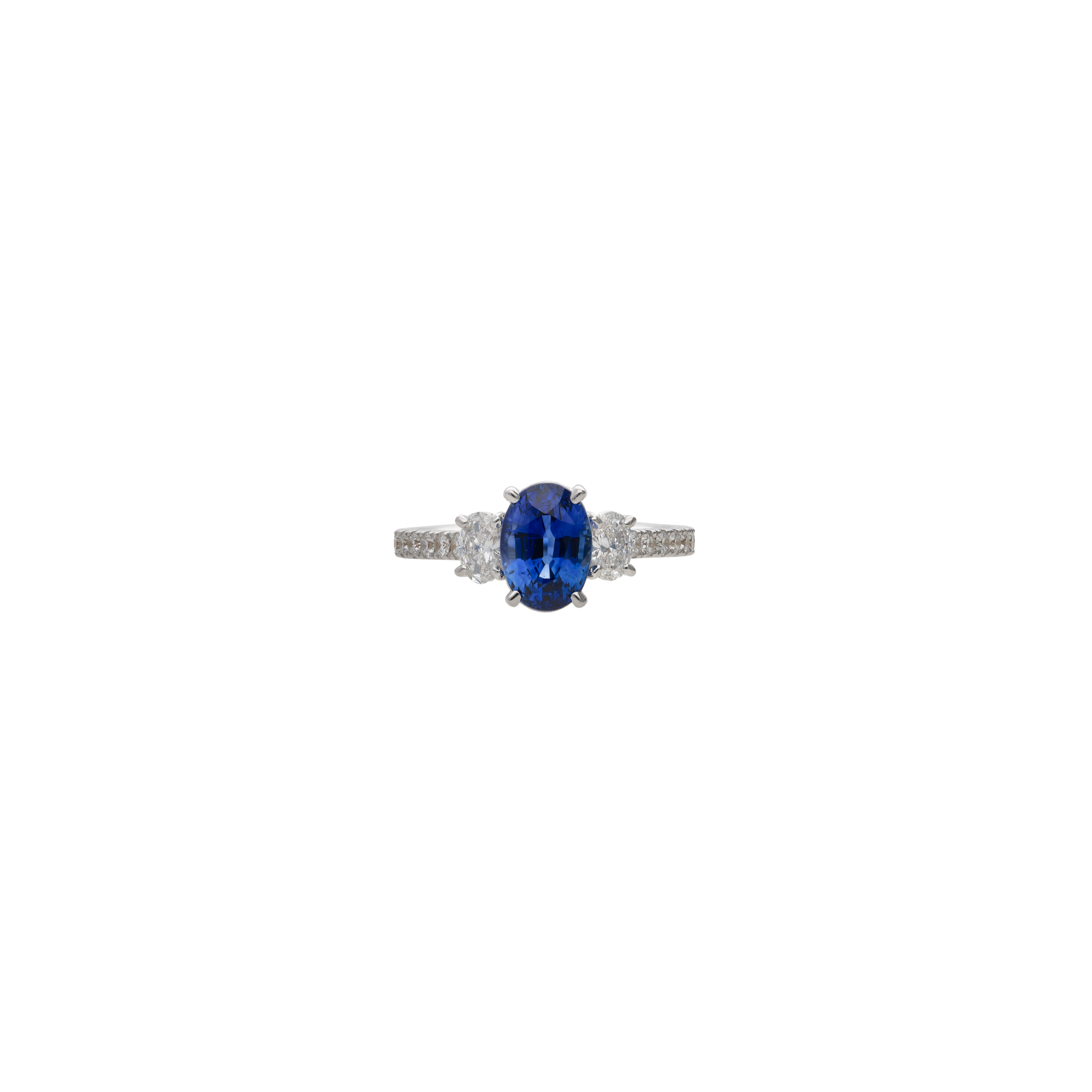 Anello in oro bianco con zaffiro centrale, diamanti laterali e sul gambo - 000-4888NS