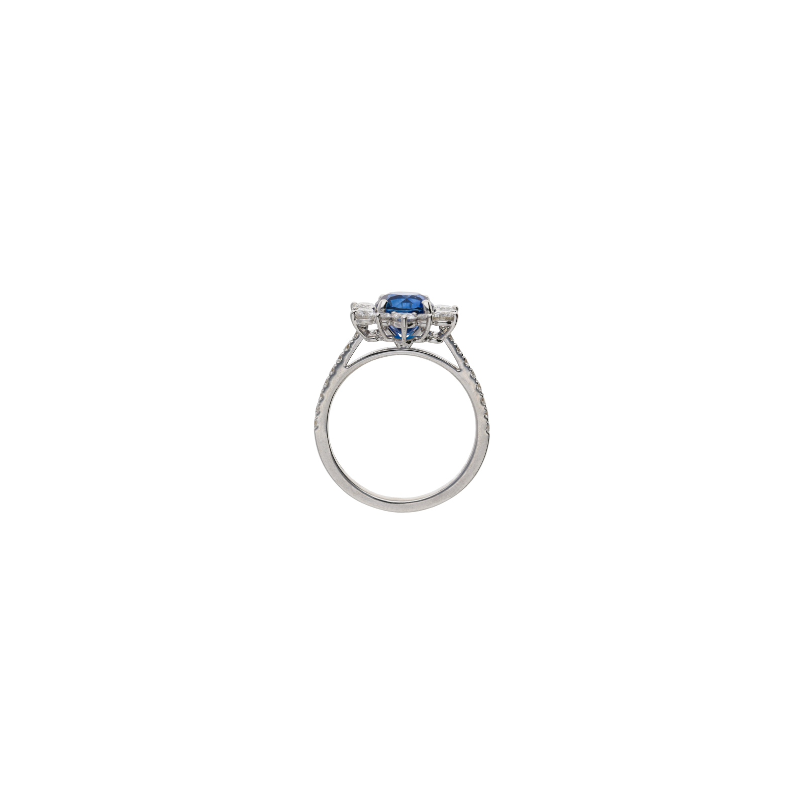 Anello rosetta in oro bianco con zaffiro blu centrale, contorno diamanti e sul gambi - 326-AN465