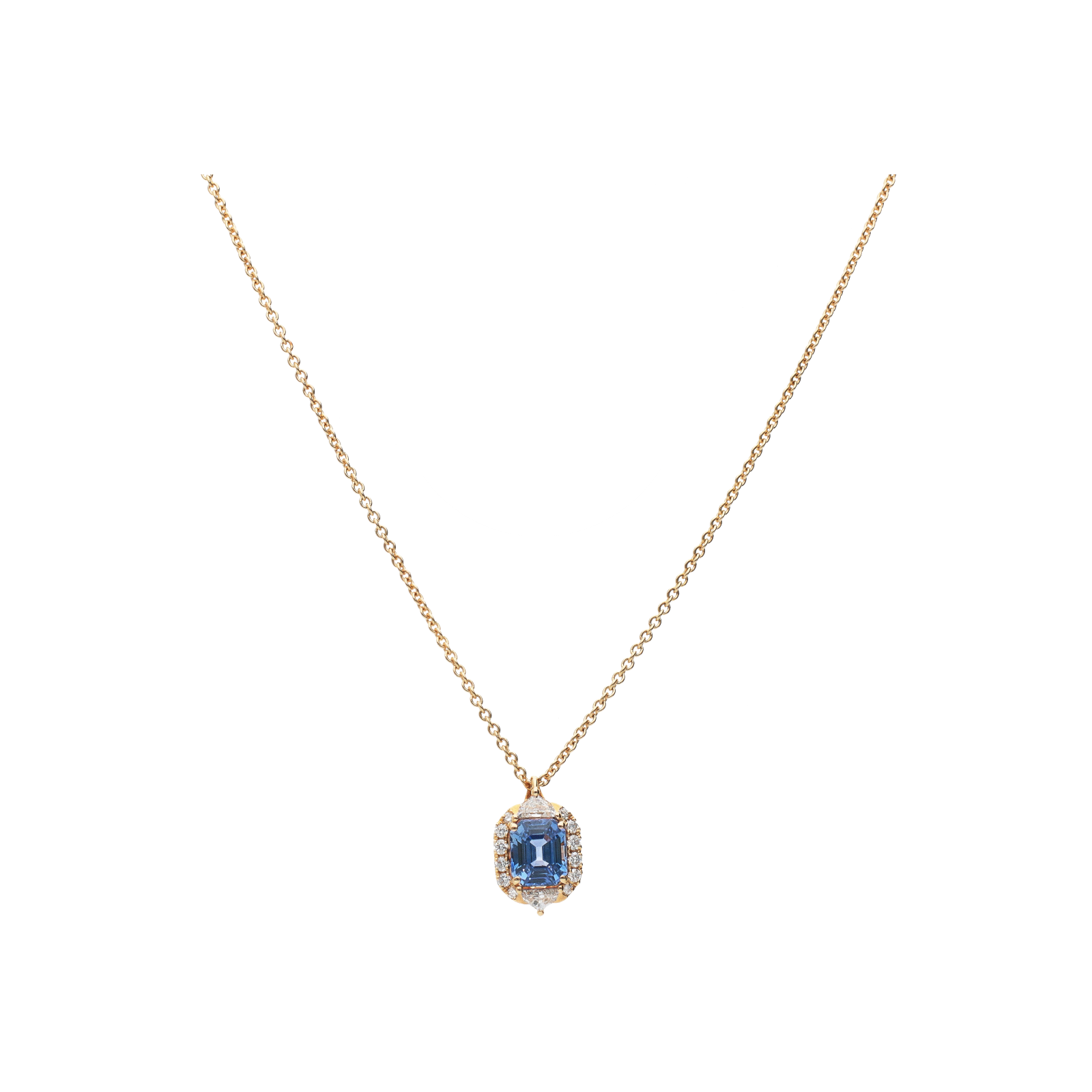 Collana collezione Forever in oro rosa 18 carati con zaffiro blu taglio ottagonale e diamanti bianchi taglio brillante e taglio Cadillac