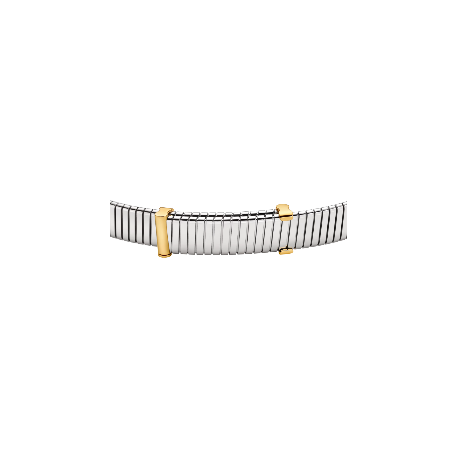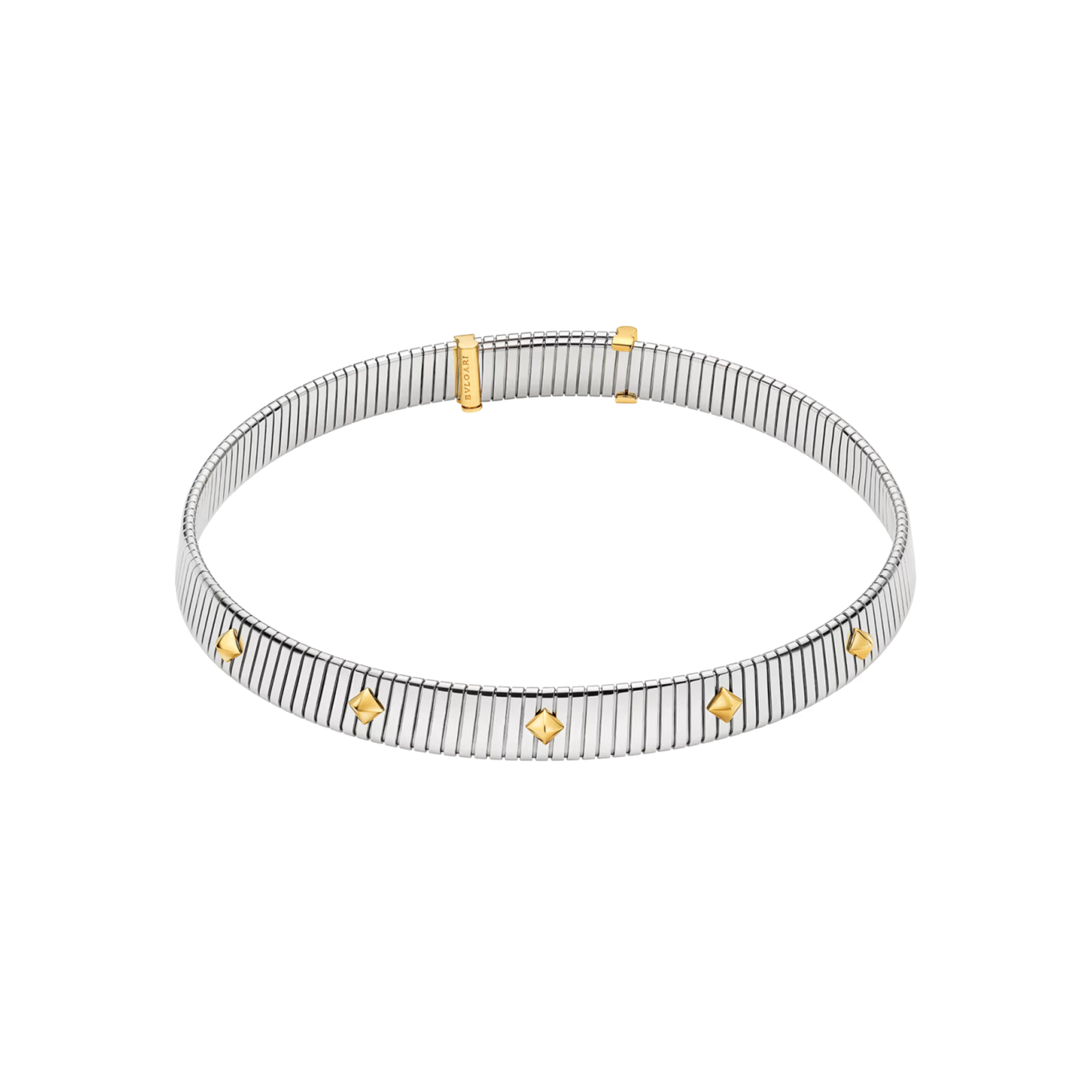 Trasformando una tecnica orafa adottata dalla Maison negli anni Quaranta in un’iconica collezione di gioielleria, Bvlgari Tubogas è un emblema della passione di Bvlgari per la sperimentazione creativa e della sua capacità di modellare i materiali più preziosi come fossero materia viva. Attingendo ai pionieristici codici estetici della Maison e alle sue inedite combinazioni di materiali, la collana Bvlgari Tubogas Gold & Steel unisce al nobile splendore dell'oro il fascinodell'acciaio. Un'audace espressione di libertà creativa, che prende forma attraverso una maestria d'eccezione. Collana Bvlgari Tubogas in acciaio inossidabile con borchie in oro giallo 18 kt. L'acciaio utilizzato per i gioielli Bvlgari è una lega ipoallergenica, con un rilascio di nichel pienamente conforme ai limiti di legge. Se ne sconsiglia l'uso a chi è affetto da gravi allergie al nichel o a chi desidera un gioiello privo di nichel al.