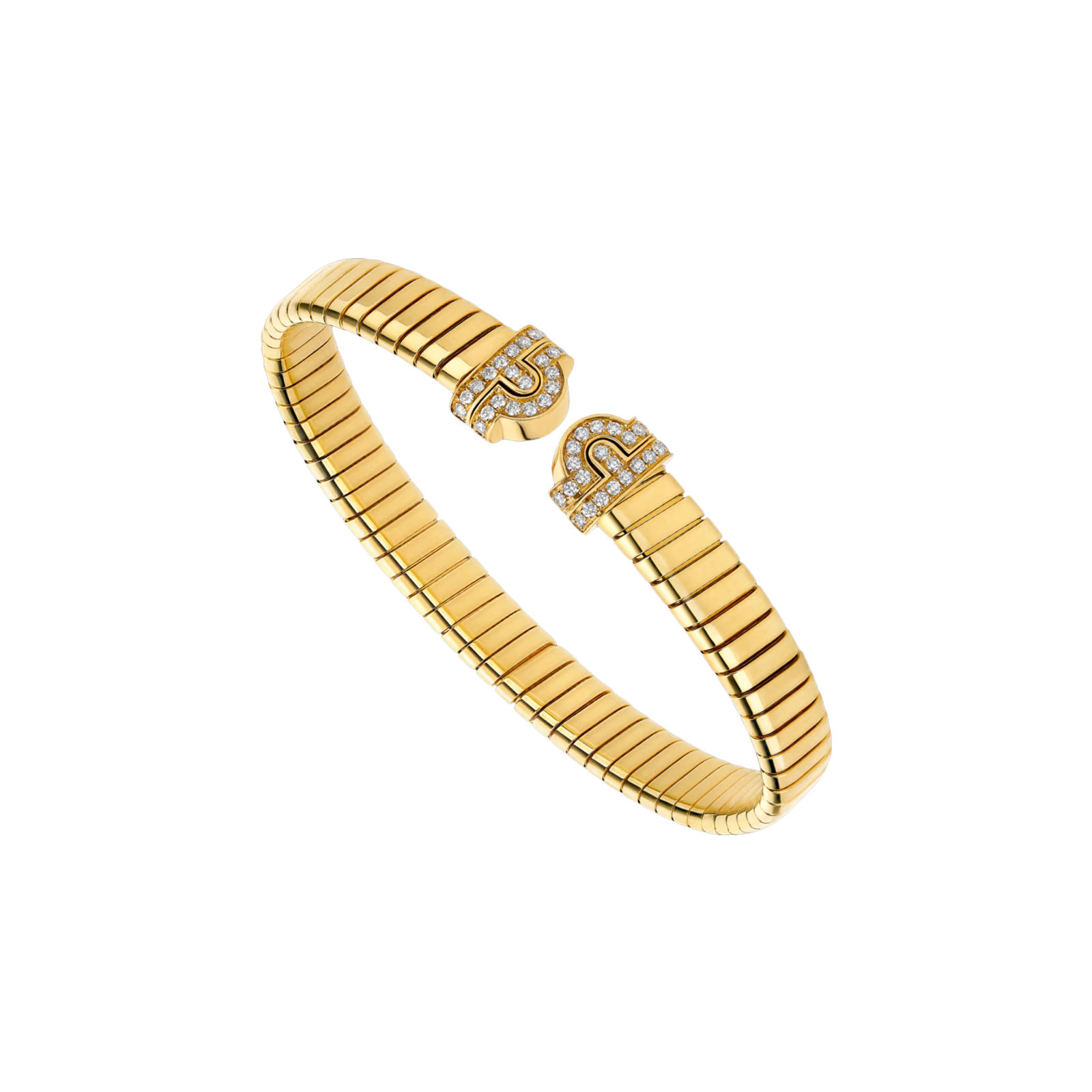 Tramutando una tecnica orafa adottata dalla maison sin dagli anni quaranta in un’iconica collezione di gioielleria, BVLGARI TUBOGAS intreccia passato e futuro in una sublime attestazione della passione di BVLGARI per la sperimentazione creativa e della sua capacità di modellare i materiali più preziosi come fossero materia viva. Frutto di un innovativo connubio tra design industriale e suprema maestria artigianale, ispirazione romana e stile contemporaneo, il bracciale BVLGARI TUBOGAS in oro giallo 18 kt è adornato da una serie di motivi parentesi con diamanti. Un design dal fascino distintivo, ispirato alla città eterna. Bracciale BVLGARI TUBOGAS in oro giallo 18 kt con pavé di diamanti.