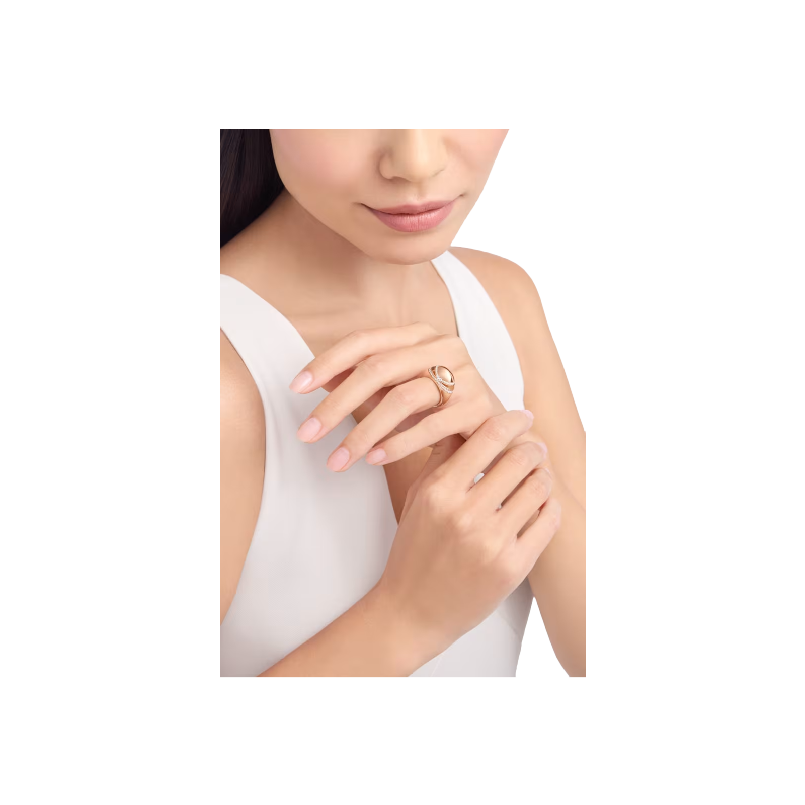 Nato dalla composizione simmetrica di due cabochon, che si uniscono in una perfetta armonia di forme e volumi, l'anello BVLGARI CABOCHON in oro rosa 18 kt è un talismano d’amore e di buona fortuna. Un simbolo prezioso che porta con sé una promessa d’amore eterno o un semplice augurio di felicità. Ispirandosi alle superfici levigate del taglio cabochon – un taglio che esalta il fascino naturale delle gemme, emblema dello stile BVLGARI sin dagli cinquanta – il gioiello sublima lo splendore dell’oro e ne rivela l'assoluta purezza. A dare un tocco di preziosa eleganza alla creazione, un raffinato pavé di diamanti. Anello BVLGARI CABOCHON in oro rosa 18 kt con semi-pavé di diamanti.