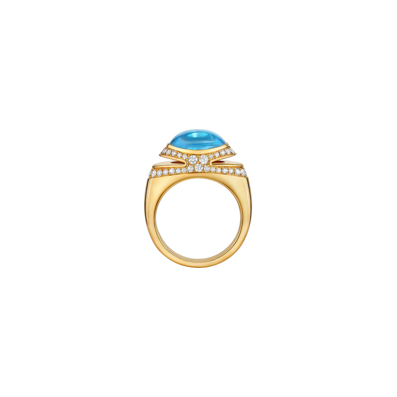 Anello Bvlgari Cabochon in oro giallo 18 kt con topazio azzurro taglio cabochon e semi-pavé di diamanti.