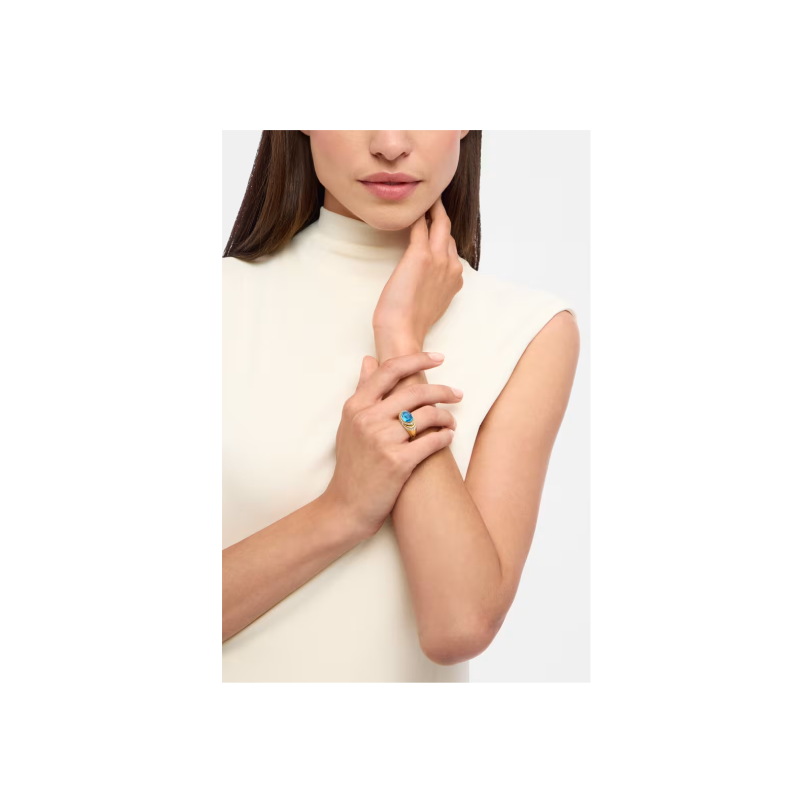 Come una goccia d’oro incastonata in una perfetta armonia di forme e volumi, l'anello Bvlgari Cabochon in oro giallo 18 kt è un talismano d’amore e di buona fortuna. Un simbolo prezioso che porta con sé una promessa d’amore eterno o un semplice augurio di felicità. Al cuore della creazione risplende un topazio azzurro taglio cabochon, un taglio che esalta l'intrinseca bellezza di ogni gemma, emblema dello stile Bvlgari sin dagli Cinquanta. Con il suo design dal fascino distintivo, il gioiello sublima lo splendore dell'oro e ne rivela l'assoluta purezza. A dare un tocco di preziosa luminosità alla creazione, un raffinato pavé di diamanti.