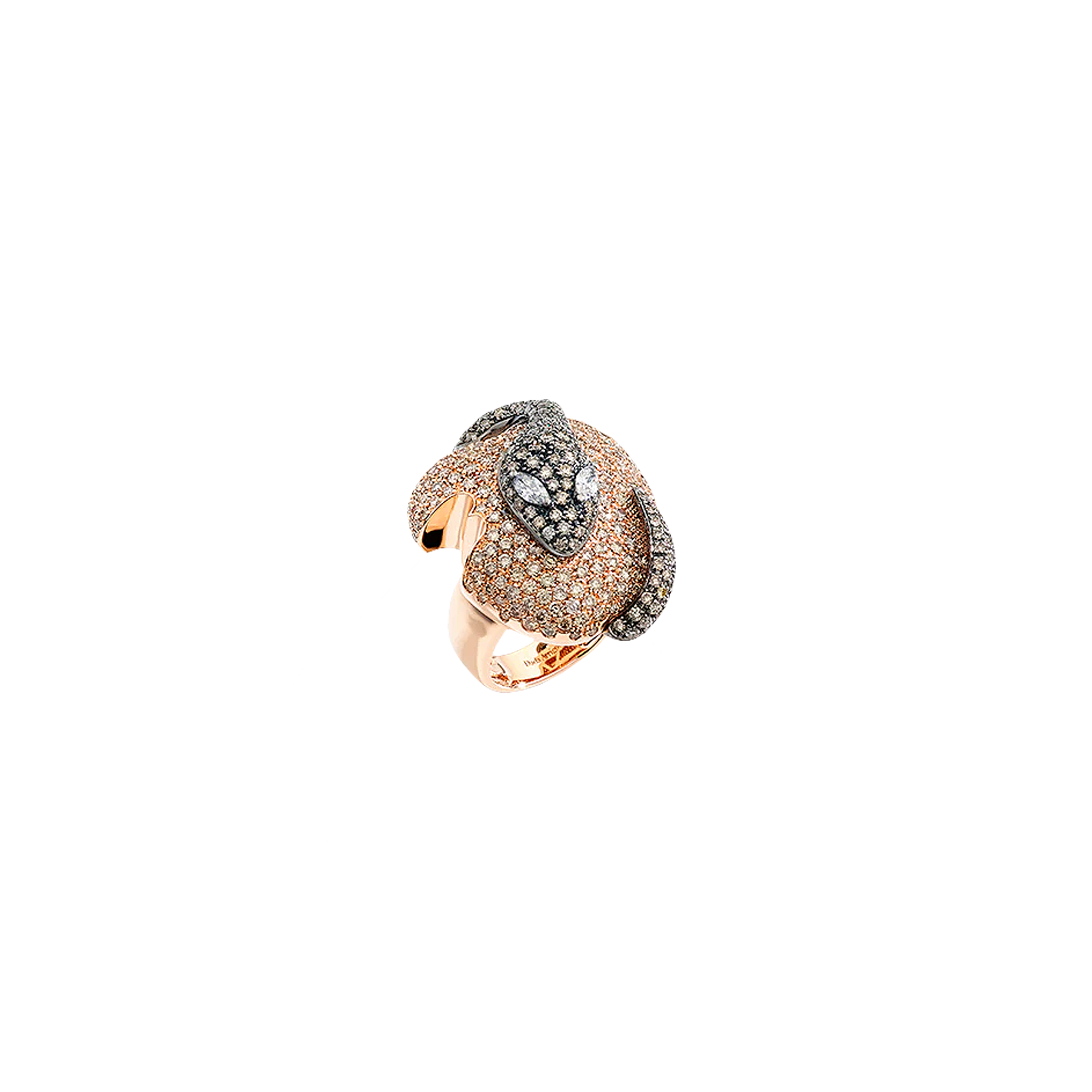 L’anello grande full pavé della collezione Malafemmina in oro rosa 18K è caratterizzato da un serpente in diamanti brown con occhi in diamanti, taglio navette, appoggiato su una mela morsa in diamanti brown. La dimensione della mela è di 3 cm. Internamente è inserita una molla che consente la riduzione fino a due taglie. Ne risulta un gioiello di grande impatto, frutto di una sapiente lavorazione dei nostri maestri artigiani.