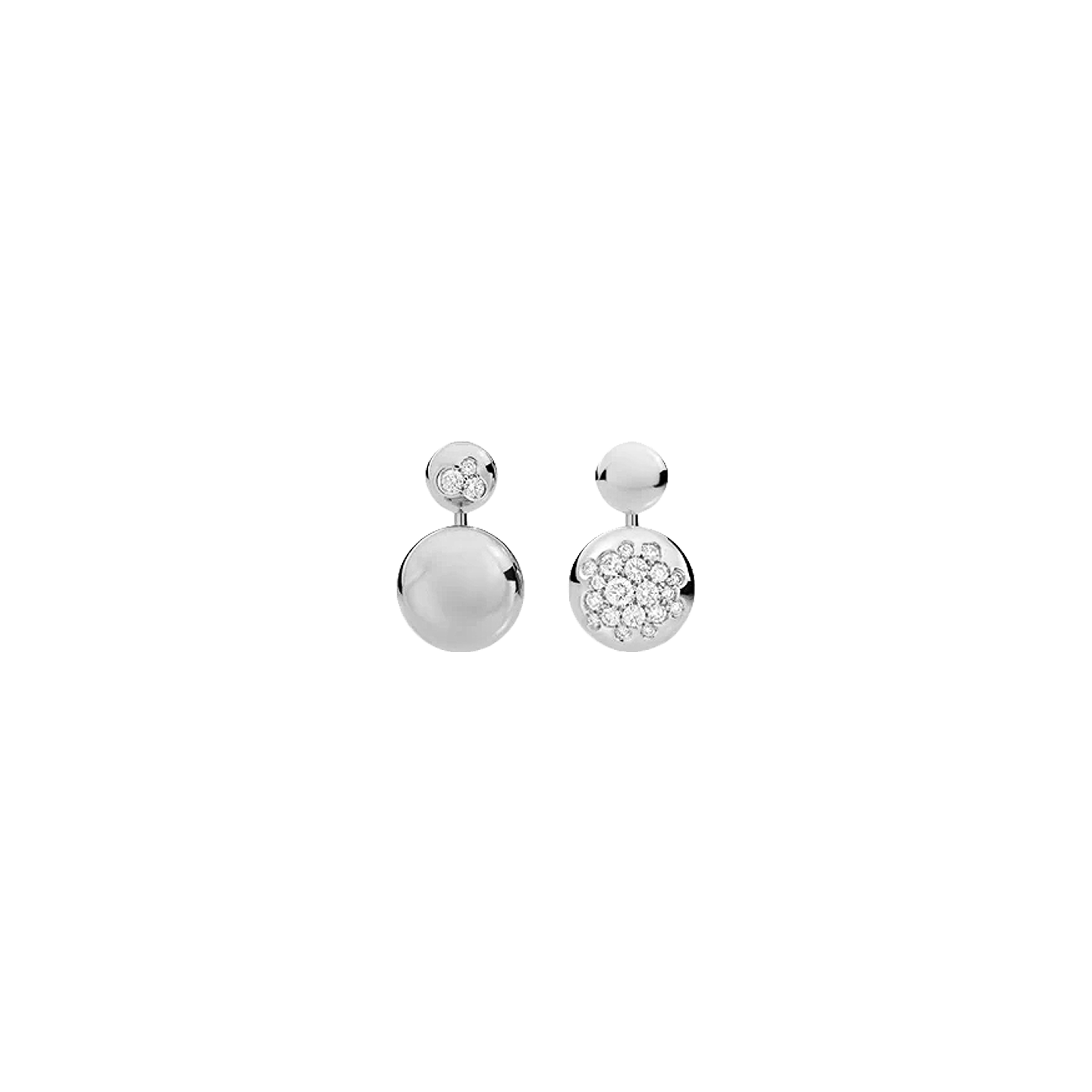 Gli orecchini mix & match della collezione glamour sono in oro bianco 18K e diamanti. La lunghezza totale è di 1,6 cm. La boule a lobo misura cm 0,7 e può essere indossata singolarmente, la boule pendente misura cm 1,3, la chiusura è con il perno un ornamento originale e mai scontato per il proprio look: le boules rispecchiano l’animo cool di ciascuna donna, mentre i diamanti quel tocco raffinato di luce che non può mai mancare.