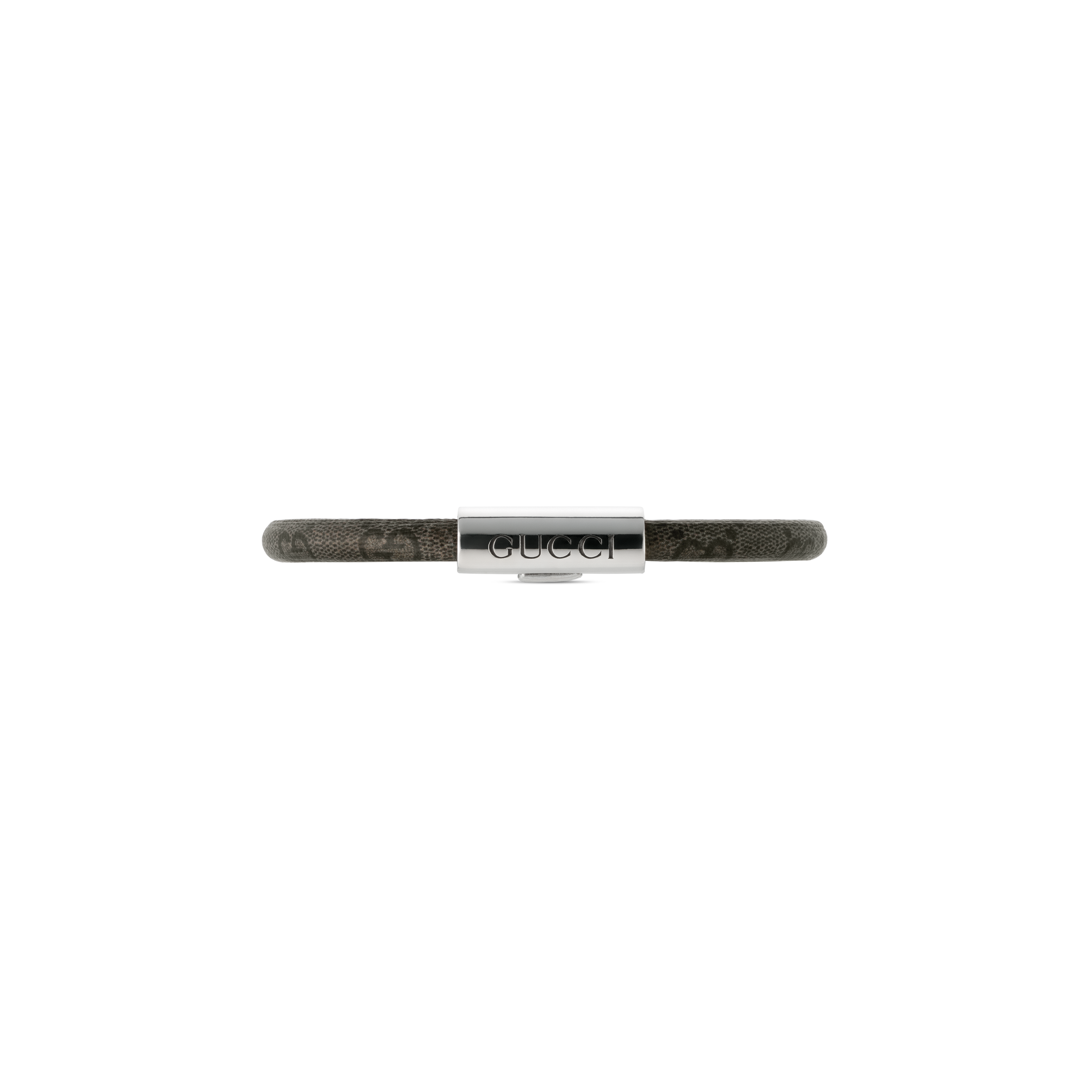 Gucci fa rivivere il suo loto trademark su targhette in argento, richiamando lo spirito moderno degli anni '90. I bracciali proposti in tessuto GG Supreme grigio scuro e nero offrono un'alternativa alla linea di gioielli da indossare tutti i giorni.