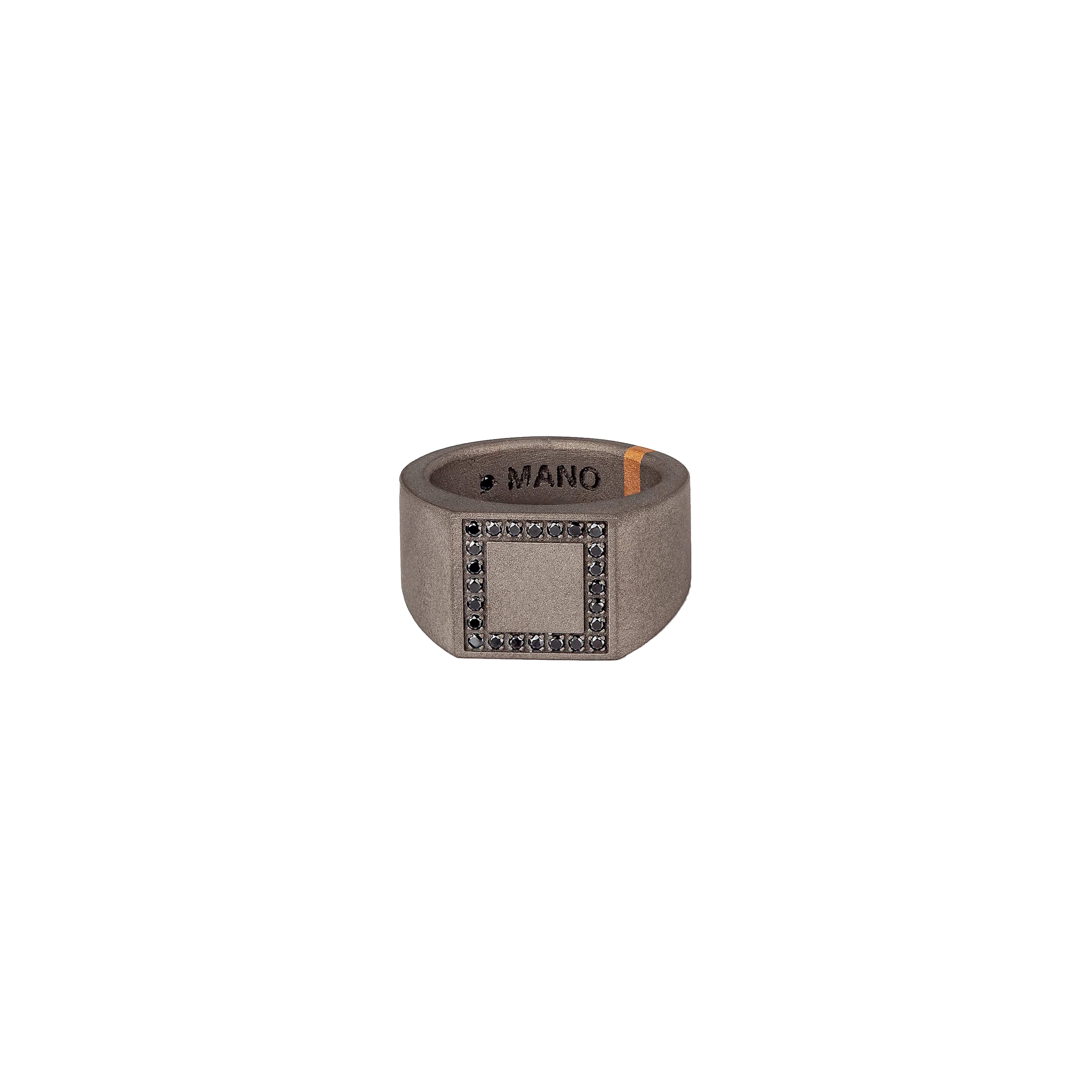 Anello uomo in titanio, diamanti black e oro rosso 18K. Alla tradizionale forma dell'anello da uomo si aggiungono particolari preziosi ed innovativi che contraddistinguono il marchio MANO|J.. La parte superiore dell'anello è costituita da un contorno di diamanti black da 1 punto. Ad impreziosire il gioiello, un riportino in oro rosso. La leggerezza del titanio dona massima indossabilità e comfort.