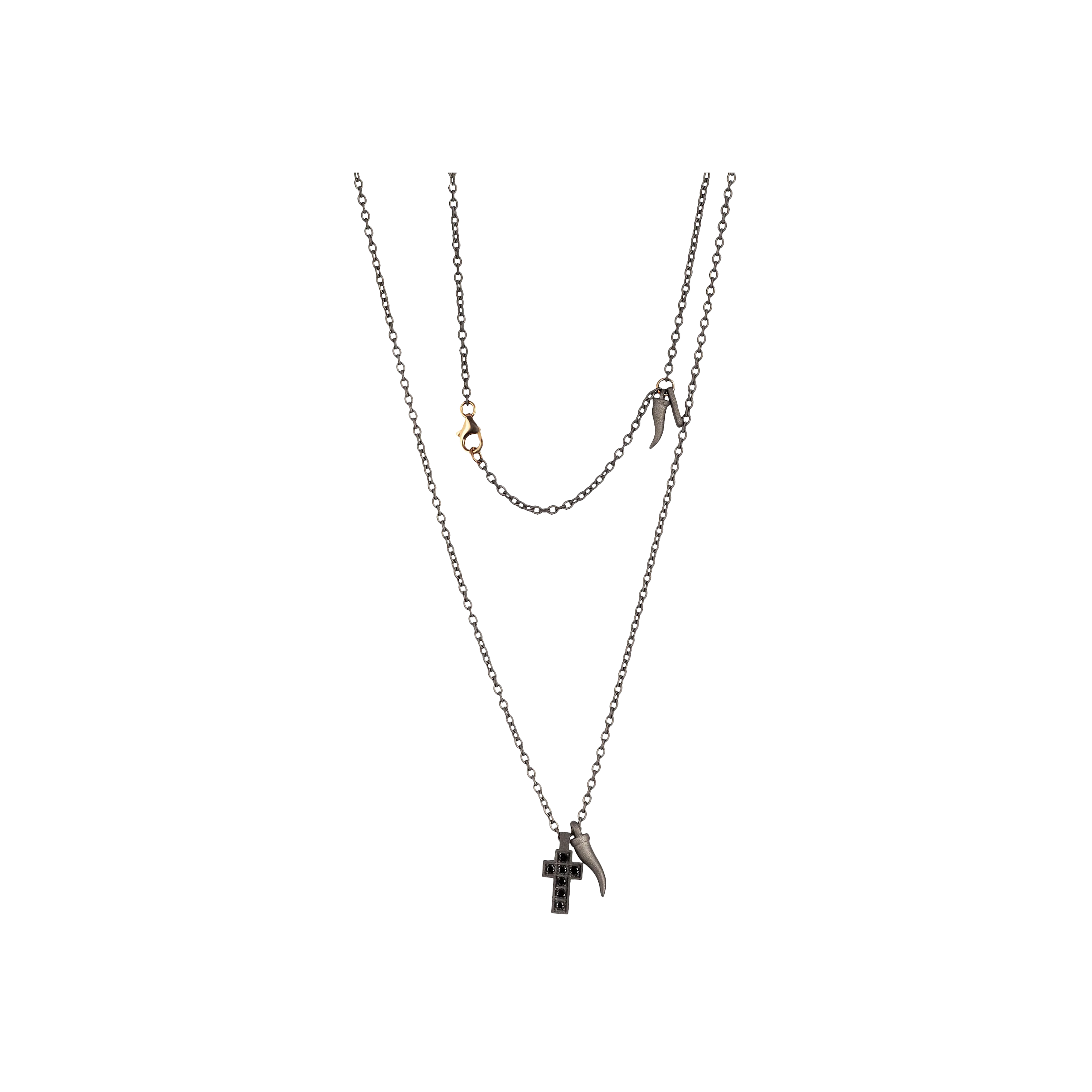 Collana da uomo minimal in titanio, cornetto pendente e una croce incassata con diamanti black - CATSMGIRTBCROLH