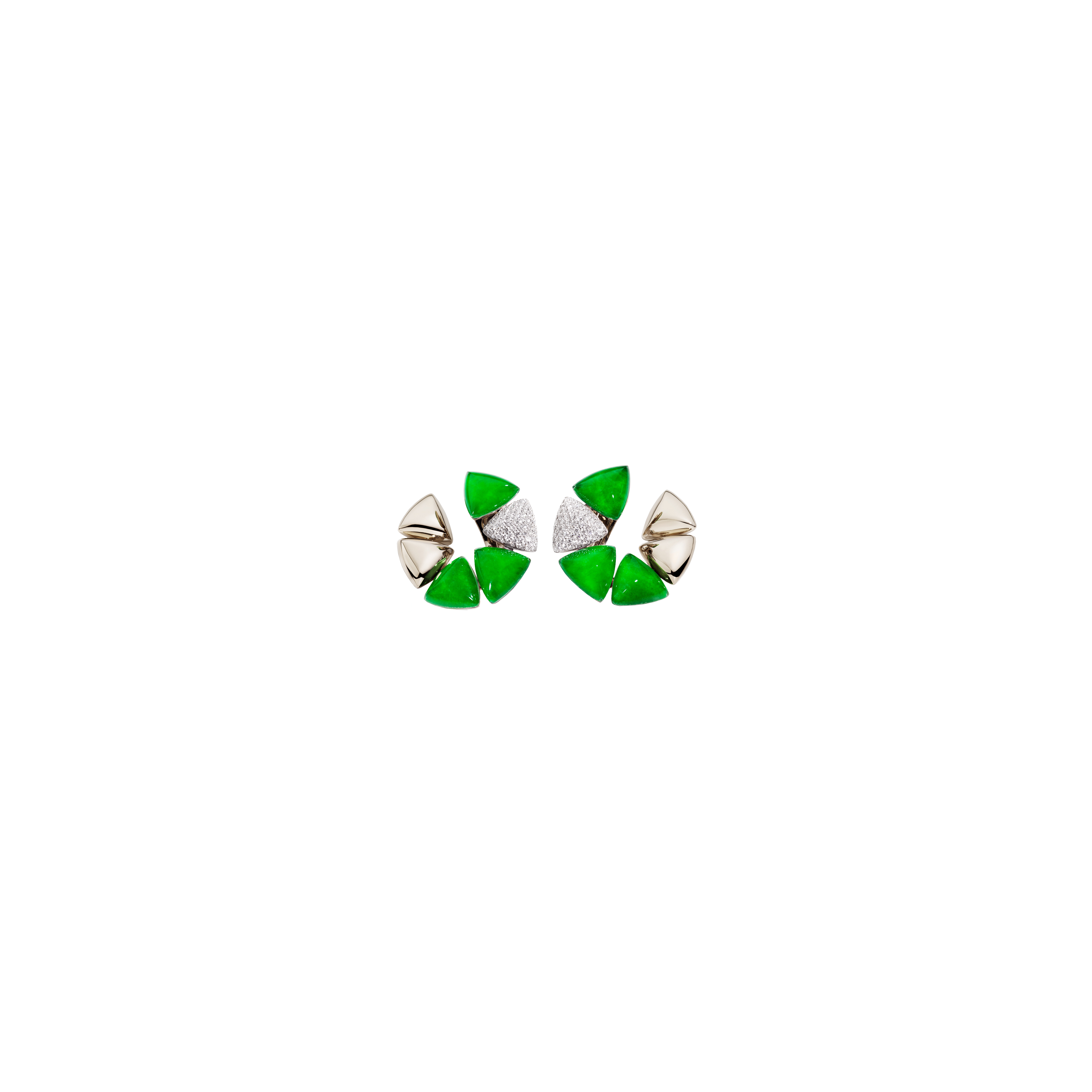 I Freccia di Vhernier sono orecchini a clip dal volume morbido e compatto; gli elementi triangolari, disposti a cerchio, creano una danza dinamica e vivace, dove l'oro bianco si alterna al magnifico verde della giada, resa più brillante dal cristallo di rocca, e a uno straordinario pavé di diamanti.
