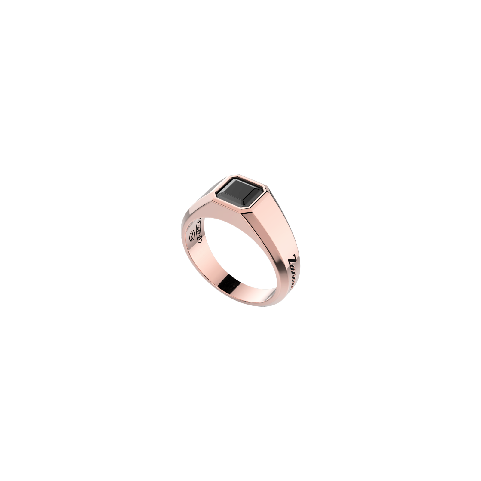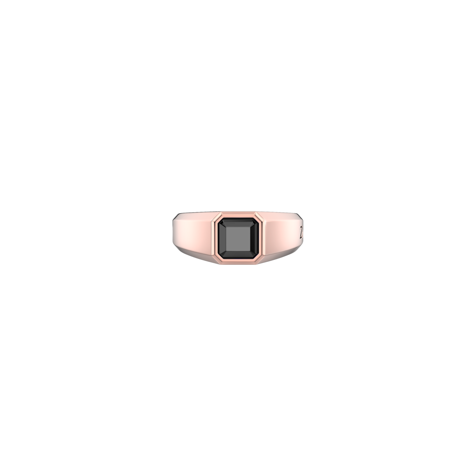 Anello Chevalier Zancan in oro 18kt con diamante nero. L'anello dallo stile minimal e classico è composto da uno chassis in oro rosé e un diamante nero incastonato sulla parte superiore. L'anello è interamente realizzato a mano in Italia con 9,80gr di oro 18kt e un diamante nero da 1,50ct. Un gioiello di alta gioielleria per rendere prezioso ogni momento di chi lo indossa.