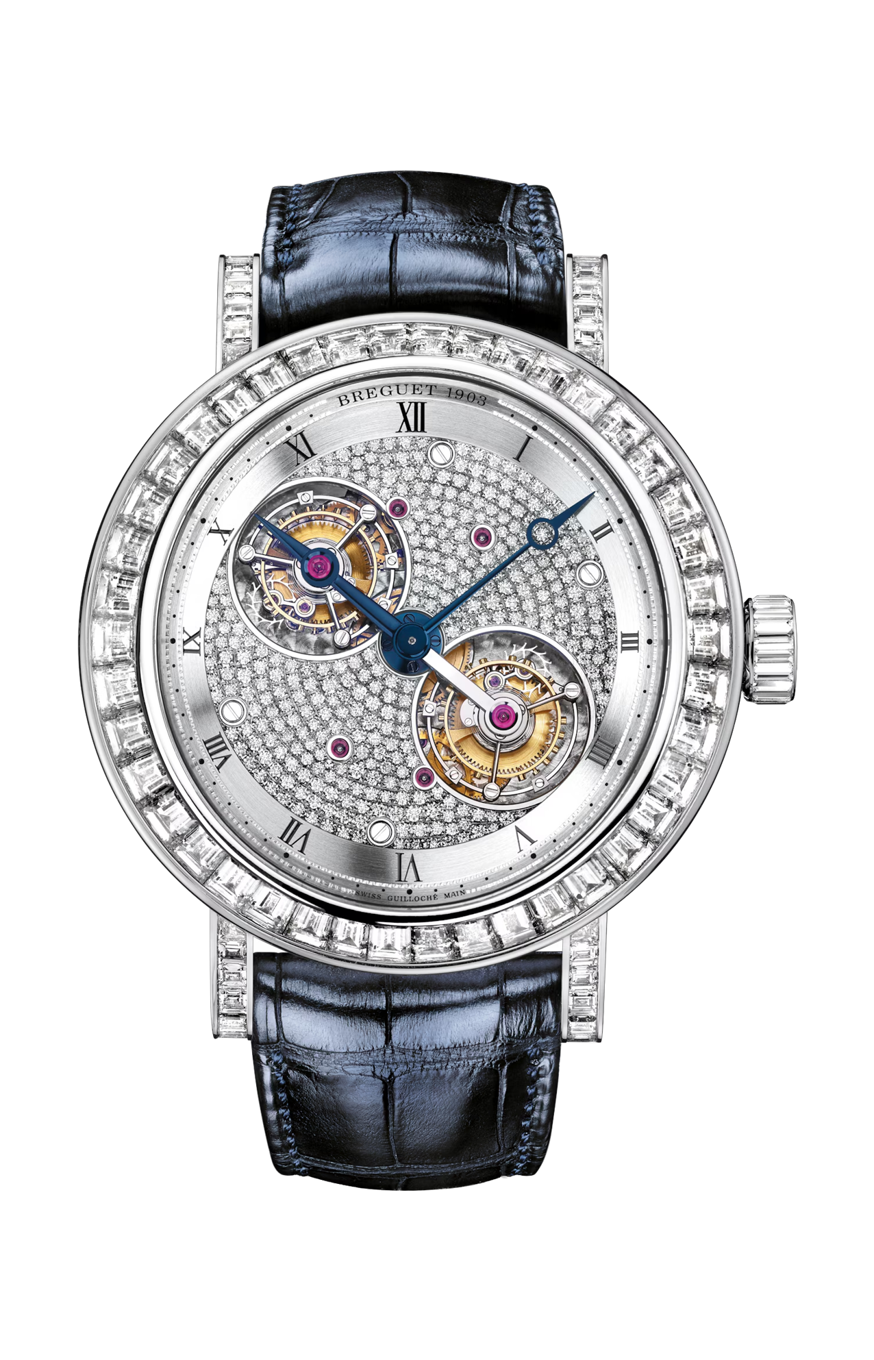 I due tourbillon presenti in questo modello in platino sommano la propria lucentezza al delicato lavoro di incastonatura.