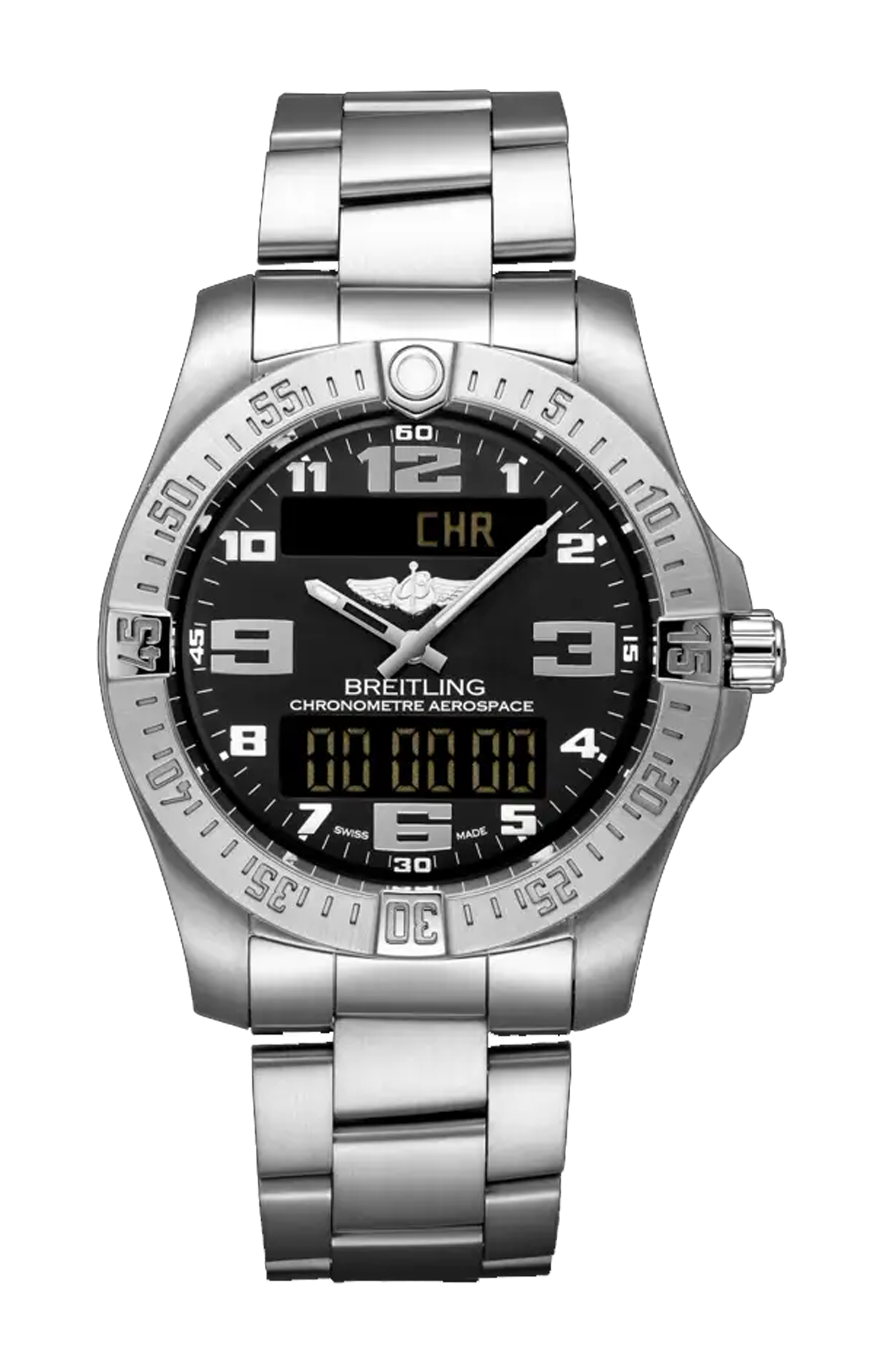 Nel 1985 Breitling ha lanciato l'Aerospace, un cronografo multifunzione innovativo munito della tecnologia svizzera all'avanguardia dell'epoca. Erede di questo modello leggendario, l'Aerospace Evo conserva lo stesso stile potente, dinamico e tecnico combinato con gli ultimi sviluppi elettronici. Equipaggiato con un movimento SuperQuartz™ ufficialmente certificato come cronometro, si distingue per un sistema di controllo intuitivo con funzioni attivate dalla corona che includono il cronografo a 1/100 di secondo, il timer per il conto alla rovescia, il secondo fuso orario, la sveglia, il segnale orario udibile (ripetizione minuti) e il calendario.