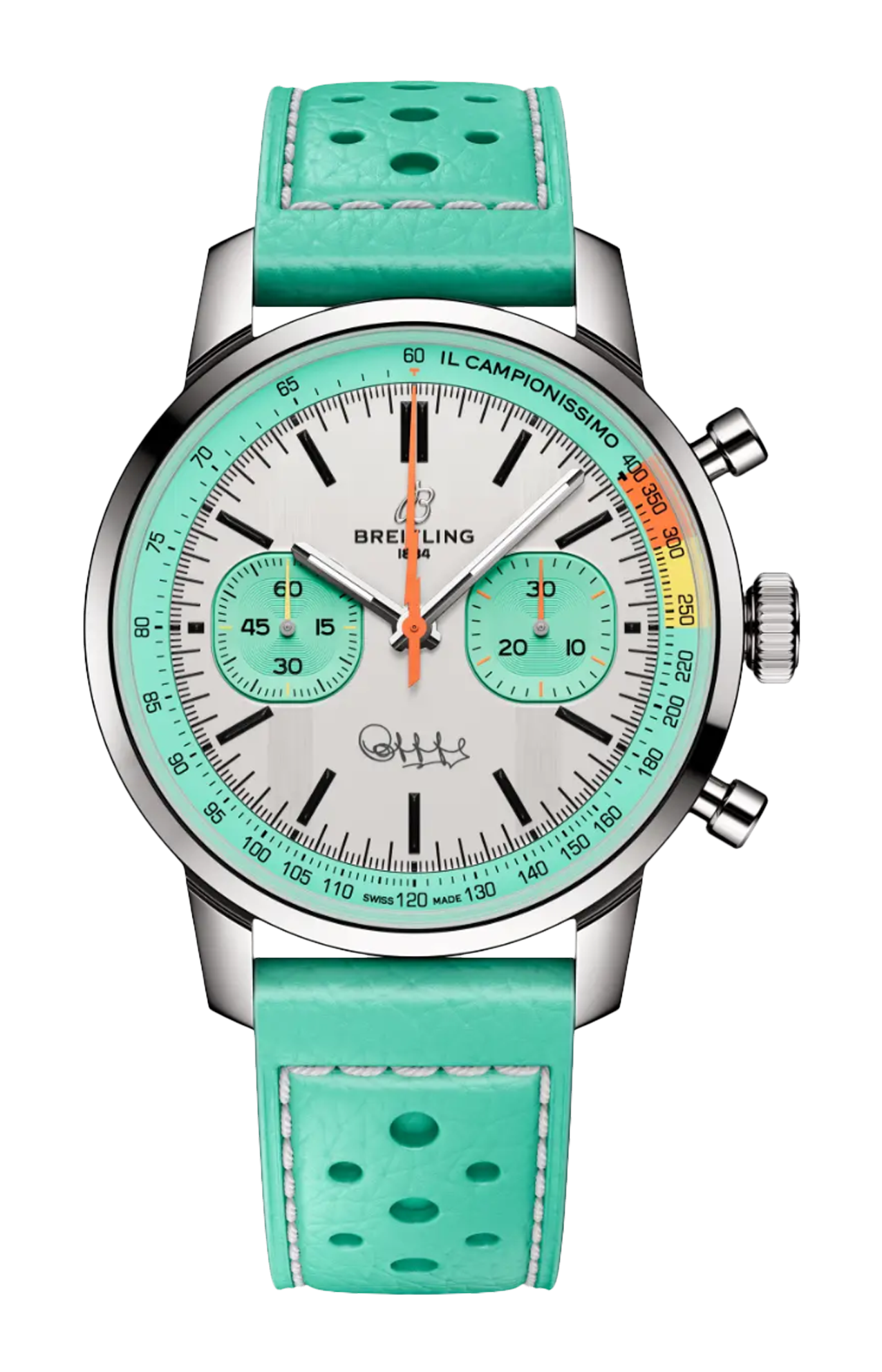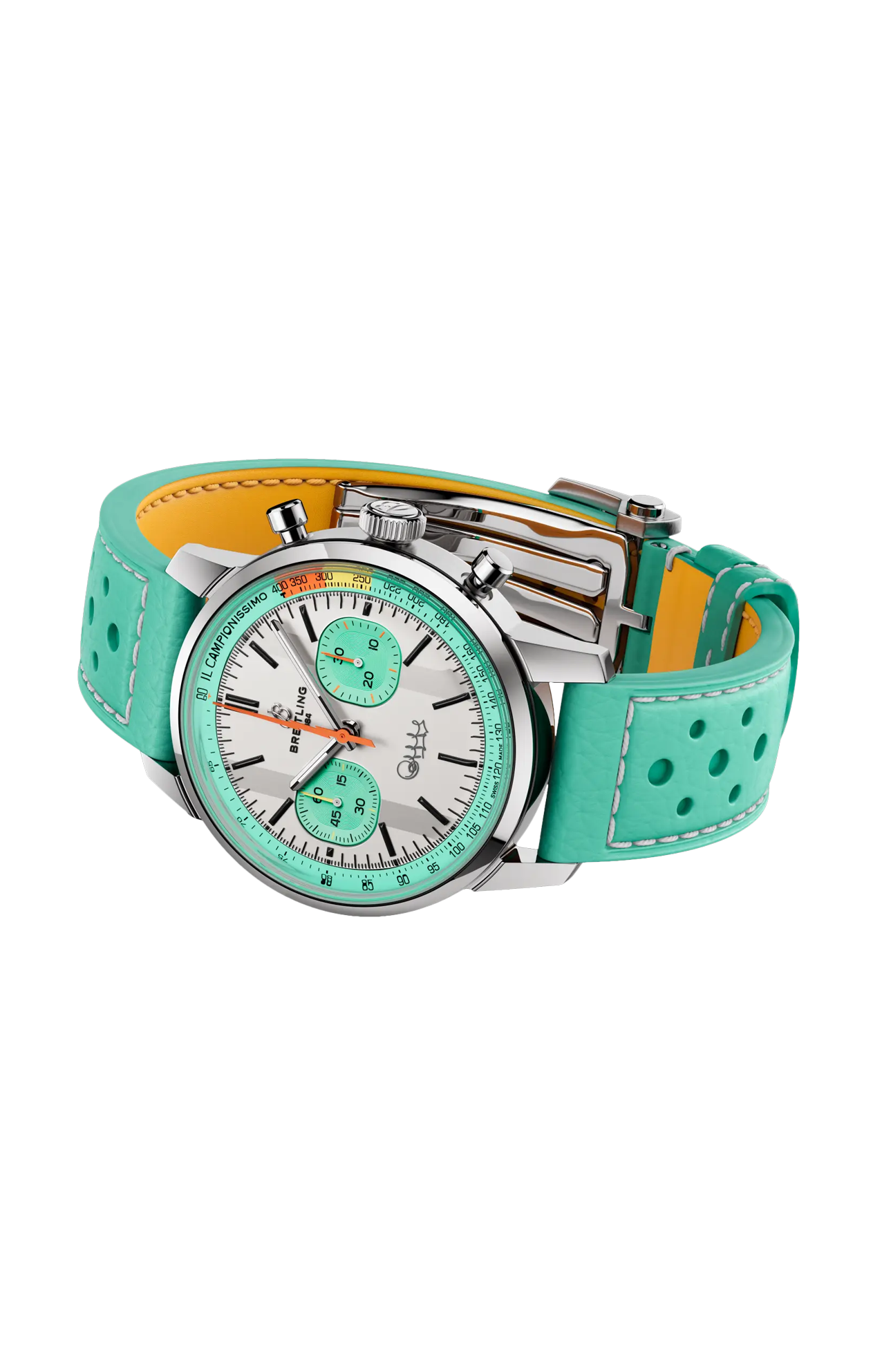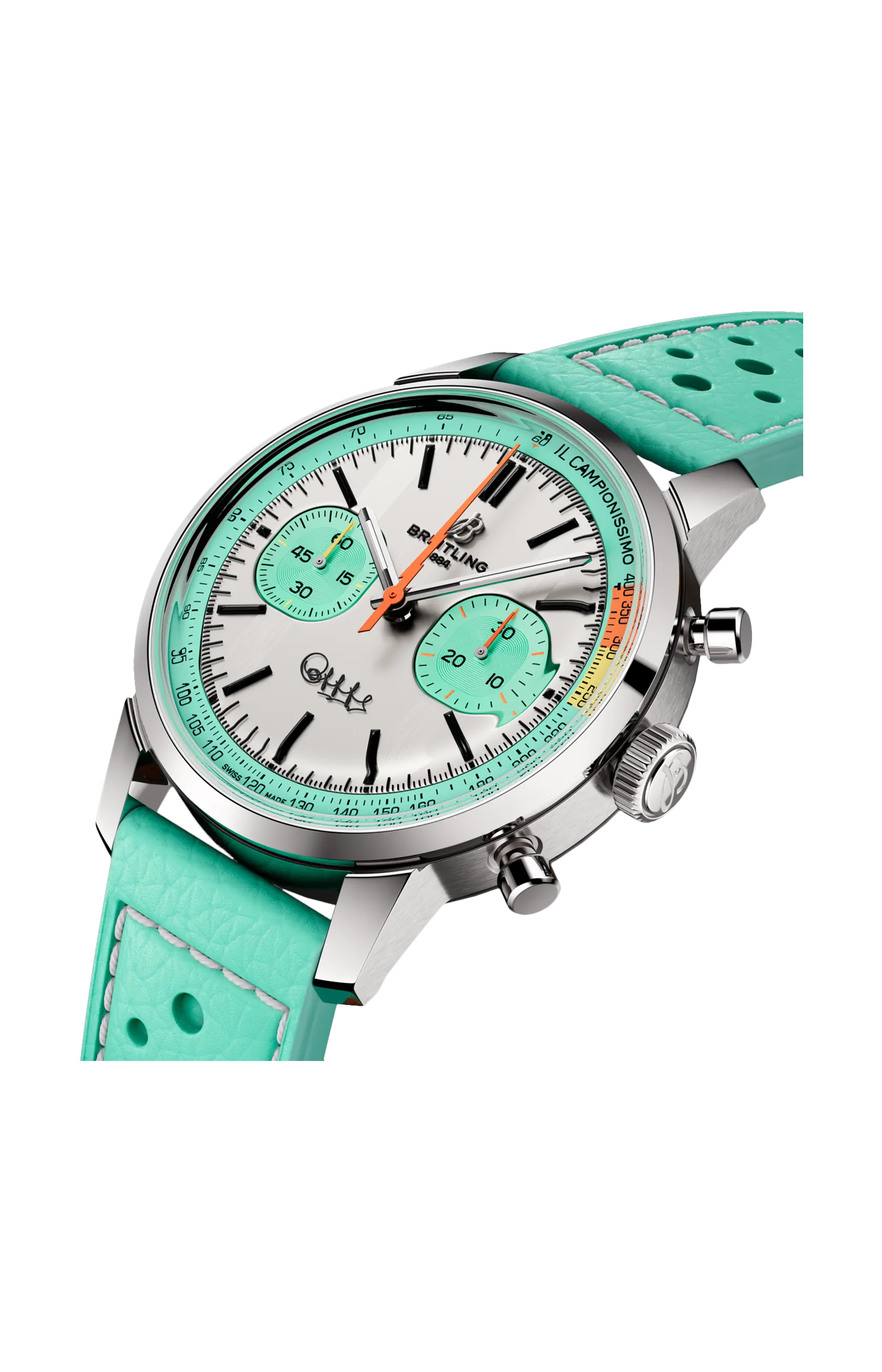 Gli anni ’60 sono stati un decennio di sperimentazione, divertimento, libertà ed energia. La parola d’ordine per quei giorni era vivere la vita alla massima velocità: in sella a una moto per lunghi viaggi, o a bordo di un’auto sportiva. Willy Breitling percepì questo cambio di passo e decise di progettare un cronografo non convenzionale che avrebbe catturato la verve del periodo. E lo chiamò Top Time. Quella tradizione ricca di spirito continua ancora oggi con la collaborazione tra Breitling e alcuni dei marchi più iconici del mondo dei motori per creare i design Top Time. Frutto della collaborazione con la storica casa manifatturiera motociclistica britannica Triumph, questo orologio sfoggia un caratteristico quadrante blu ghiaccio. Il colore peculiare riprende esattamente il blu di una Triumph Thunderbird 6T del 1951 e di un raro Breitling Top Time, Ref. 815 degli anni ’70 dal quadrante blu. I collezionisti noteranno sicuramente alcuni altri riferimenti ai modelli vintage di Breitling, come il logo rétro, i pulsanti del cronografo a fungo e il quadrante dal design «Zorro». Il motivo a papillon introdotto sul Top Time negli anni ’60 (e con un soprannome che celebra la maschera dell’astuto spadaccino) è stato integrato in modo raffinato con una finitura spazzolata del metallo che crea un radioso gioco di luce e strutture. Il design è caratterizzato da un emblema Triumph a ore 6, da una scala tachimetrica per la misurazione della velocità e dai contatori a contrasto «Squircle» (non proprio quadrati, non proprio tondi) che rievocano i contagiri vintage dei cruscotti. Sotto il cofano, ha anche un nuovo motore di cui vantarsi: lo straordinario calibro di manifattura Breitling 01.