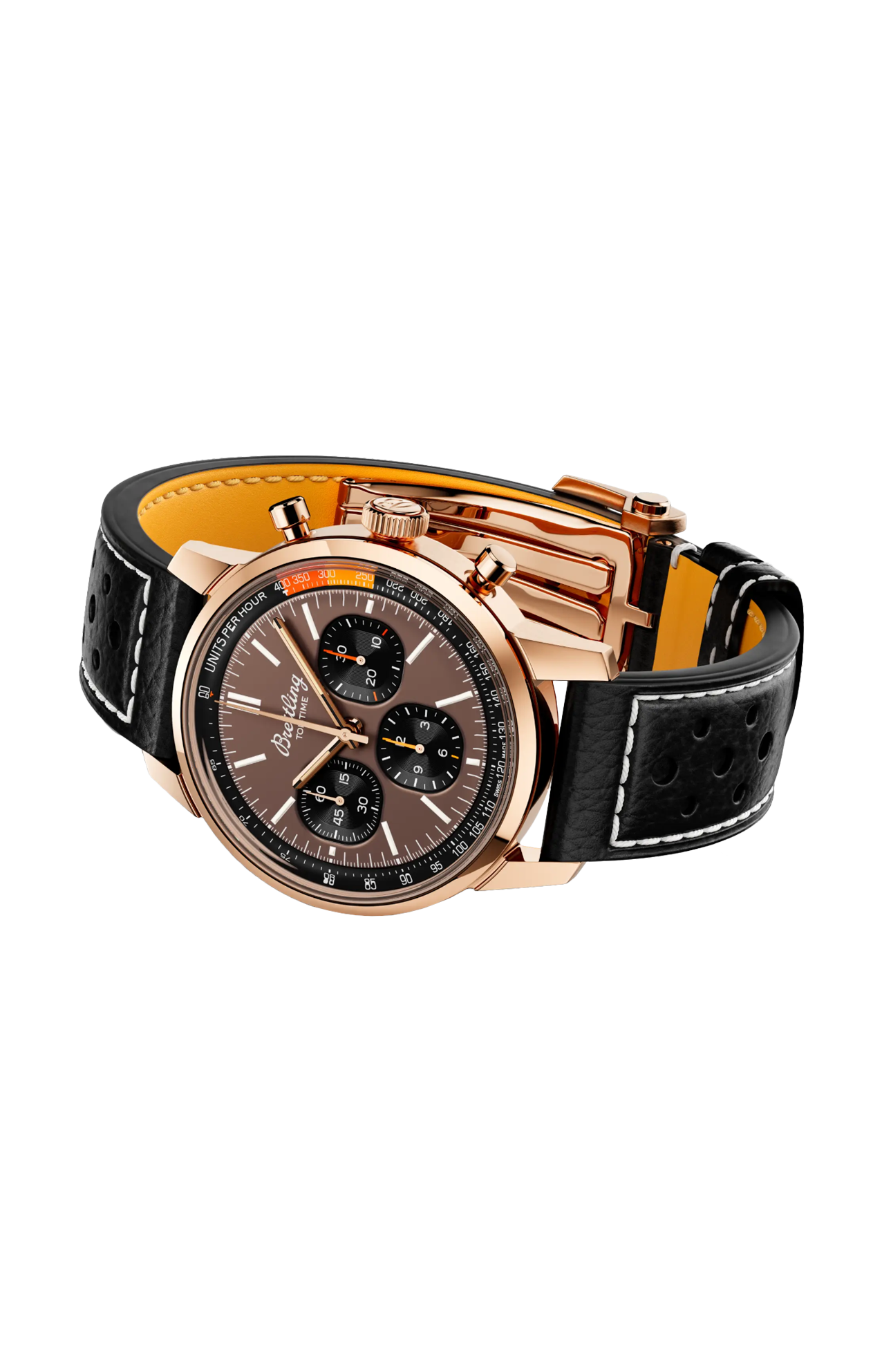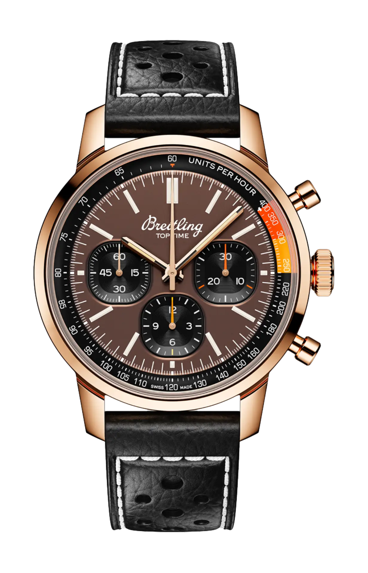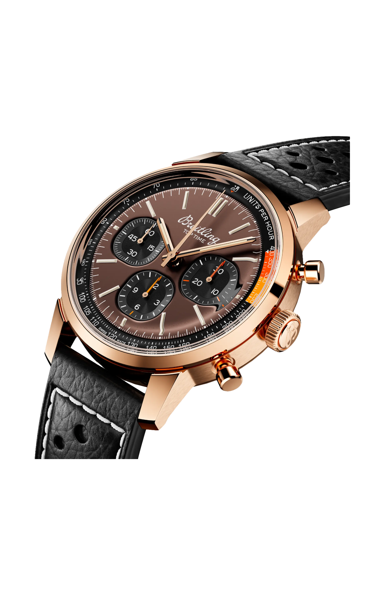 Gli anni ’60 sono stati un decennio di sperimentazione, divertimento, libertà ed energia. La parola d’ordine per quei giorni era vivere la vita alla massima velocità: in sella a una moto per lunghi viaggi, o a bordo di un’auto sportiva. Willy Breitling percepì questo cambio di passo e decise di progettare un cronografo non convenzionale che avrebbe catturato la verve del periodo. E lo chiamò Top Time. Questa grande tradizione continua oggi con il Top Time B01 che sfoggia un cinturino in stile racing in pelle traforata, la scala tachimetrica per la misurazione della velocità e i contatori a contrasto «Squircle» (non proprio quadrati, non proprio tondi) che ricordano il contagiri vintage dei cruscotti. Sotto il cofano, ha anche un nuovo motore di cui vantarsi: lo straordinario calibro di manifattura Breitling 01.
