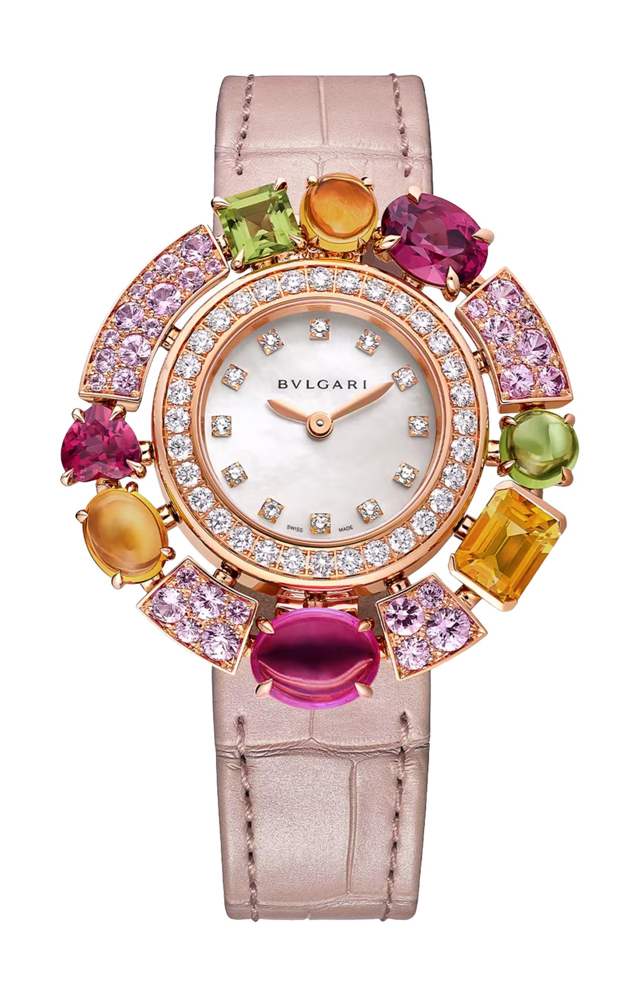 Catturando la gioia e l’esuberanza della dolce vita, l'orologio Cocktail Allegra in oro rosa 18 kt unisce stile e maestria artigianale in una creazione dalla sfavillante eleganza, perfetta per ogni occasione. Con la sua incantevole combinazione di pietre sfaccettate e taglio cabochon – tra cui diamanti, zaffiri, tormalina rosa, citrini, rodoliti rosa scuro e peridoti – l'orologio è un trionfo di colori, che si abbinano perfettamente a un raffinato quadrante in madreperla e a un cinturino in alligatore iridescente rosa chiaro, per un effetto sofisticato e accattivante. Orologio Allegra con movimento al quarzo, cassa di 36 mm in oro rosa 18 kt, lunetta in oro rosa 18 kt con 52 diamanti taglio brillante (1,12 ct), 32 zaffiri rosa, 1 tormalina rosa, 3 citrini, 2 rodoliti rosa scuro e 2 peridoti, quadrante in madreperla bianca, indici con 12 diamanti taglio brillante, cinturino in alligatore iridescente rosa chiaro con fibbia ad ardiglione in oro rosa 18 kt. Impermeabile fino a 30 metri.