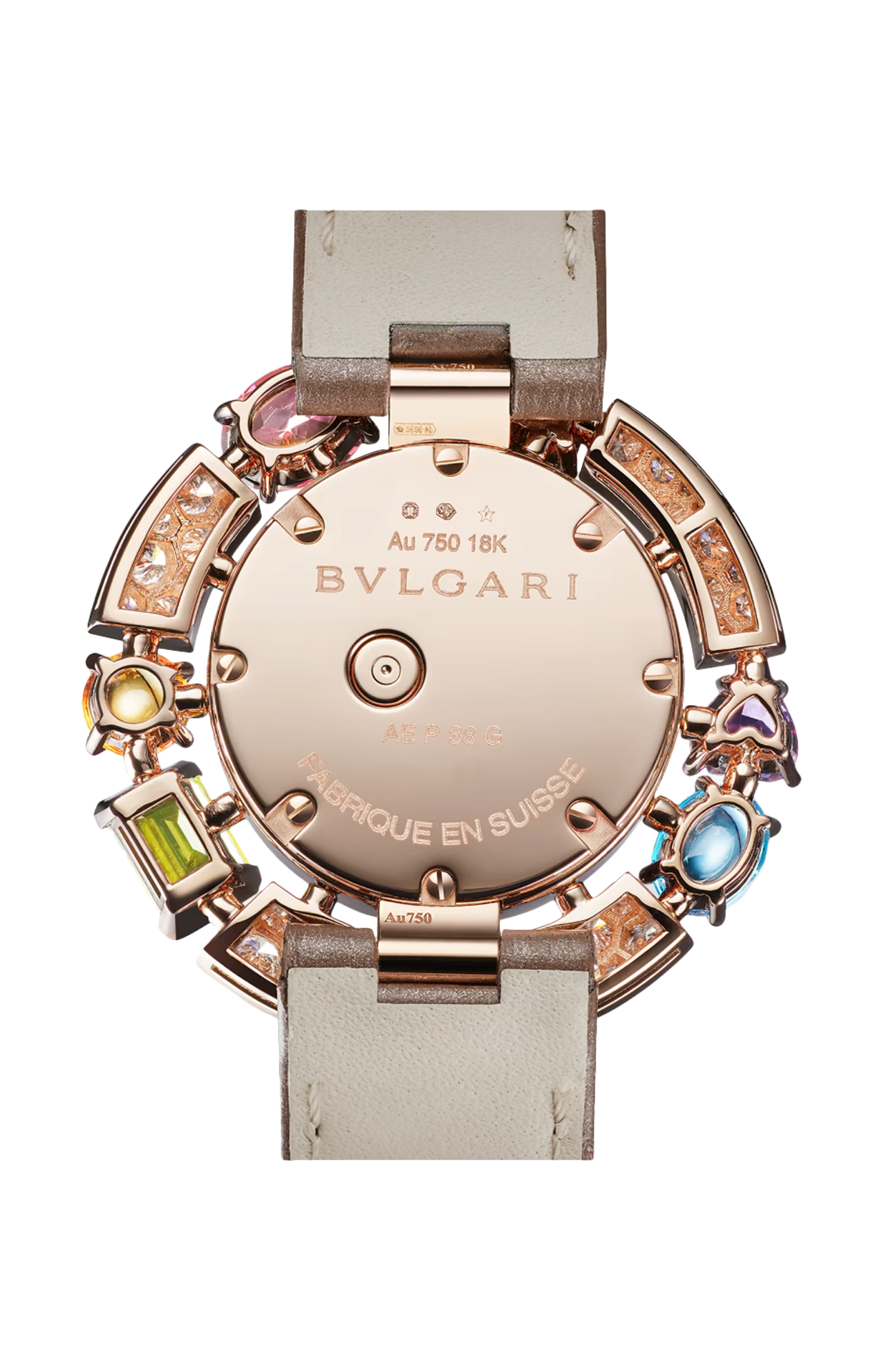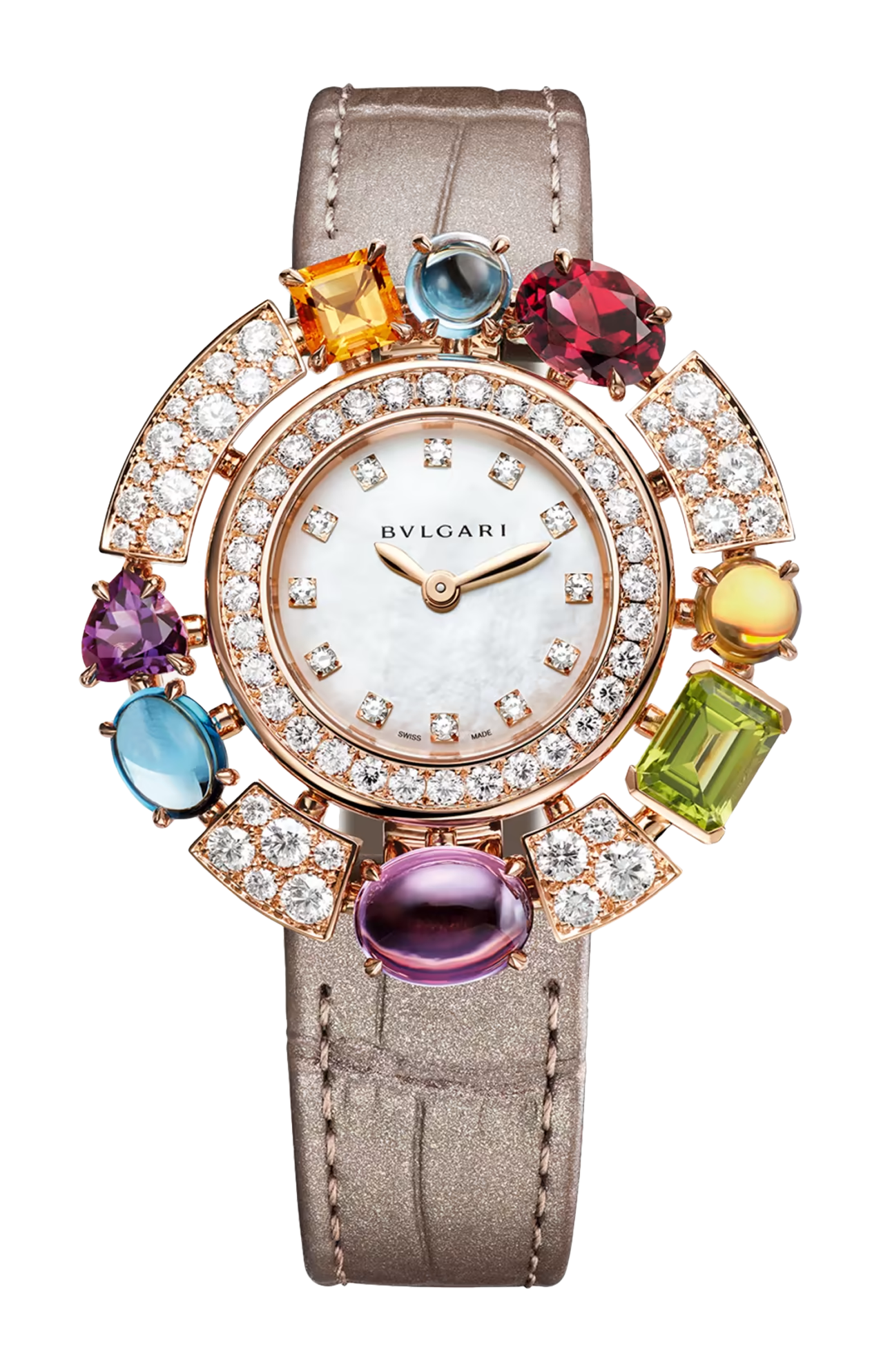 Catturando la gioia e l’esuberanza della dolce vita, l’orologio cocktail allegra unisce stile e maestria artigianale in una creazione dalla sfavillante eleganza. Con la sua incantevole combinazione di pietre sfaccettate e taglio cabochon, l’orologio esalta il vibrante splendore di ogni gemma, dando vita ad accostamenti audaci e stravaganti. Un orologio perfetto per ogni occasione, che rinnova il fascino di un classico del design BVLGARI grazie allo straordinario effetto luminoso delle sue preziose gemme. Orologio di alta gioielleria allegra con movimento al quarzo, cassa di 36 mm in oro rosa 18 kt con 82 diamanti tondi taglio brillante (circa 2,27 ct), due citrini taglio misto (circa 1,45 ct) due ametiste taglio misto (circa 3,06 ct), un peridoto taglio fancy (circa 1,29 ct), due topazi blu taglio cabochon (circa 3,06 ct) e una rodolite taglio fancy (circa 1,63 ct), quadrante in madreperla, indici con 12 diamanti, cinturino in alligatore grigio talpa lucido con fibbia ad ardiglione in oro rosa 18 kt. Impermeabile fino a 30 metri.