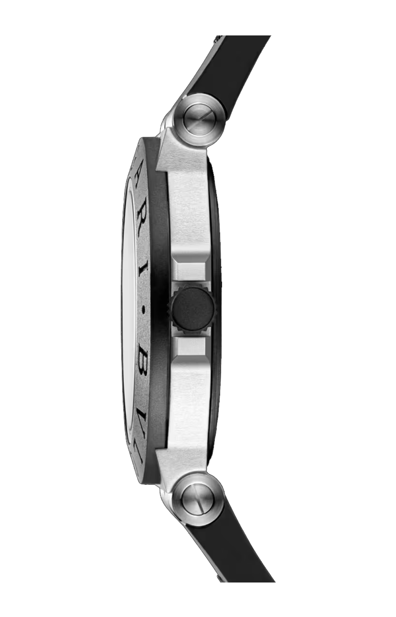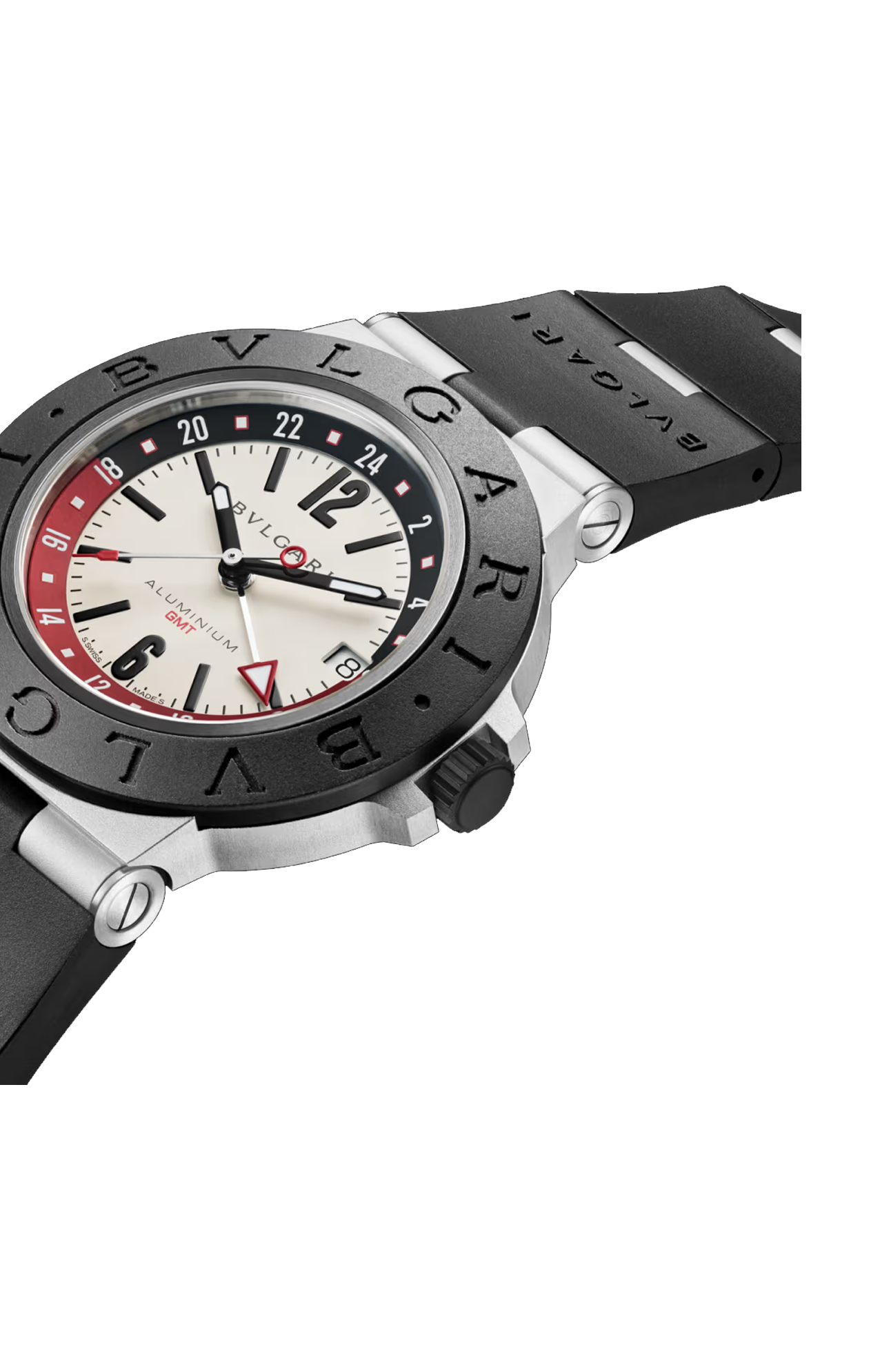 Orologio BVLGARI ALUMINIUM GMT con movimento meccanico a carica automatica, funzioni ore, minuti, secondi, data e GMT 24H, riserva di carica di 42 ore. Calibro B192, cassa di 40 mm in alluminio con trattamento DLC, lunetta in caucciù nero con doppio logo, quadrante bianco con scala 24 ore nera e rossa, lancette e indici neri con SLN™, lancetta 24 ore con punta bianca e rossa, finestrella della data a ore 3, fondello in titanio, anse in alluminio e cinturino in caucciù nero con fibbia ad ardiglione in alluminio. Impermeabile fino a 100 metri.