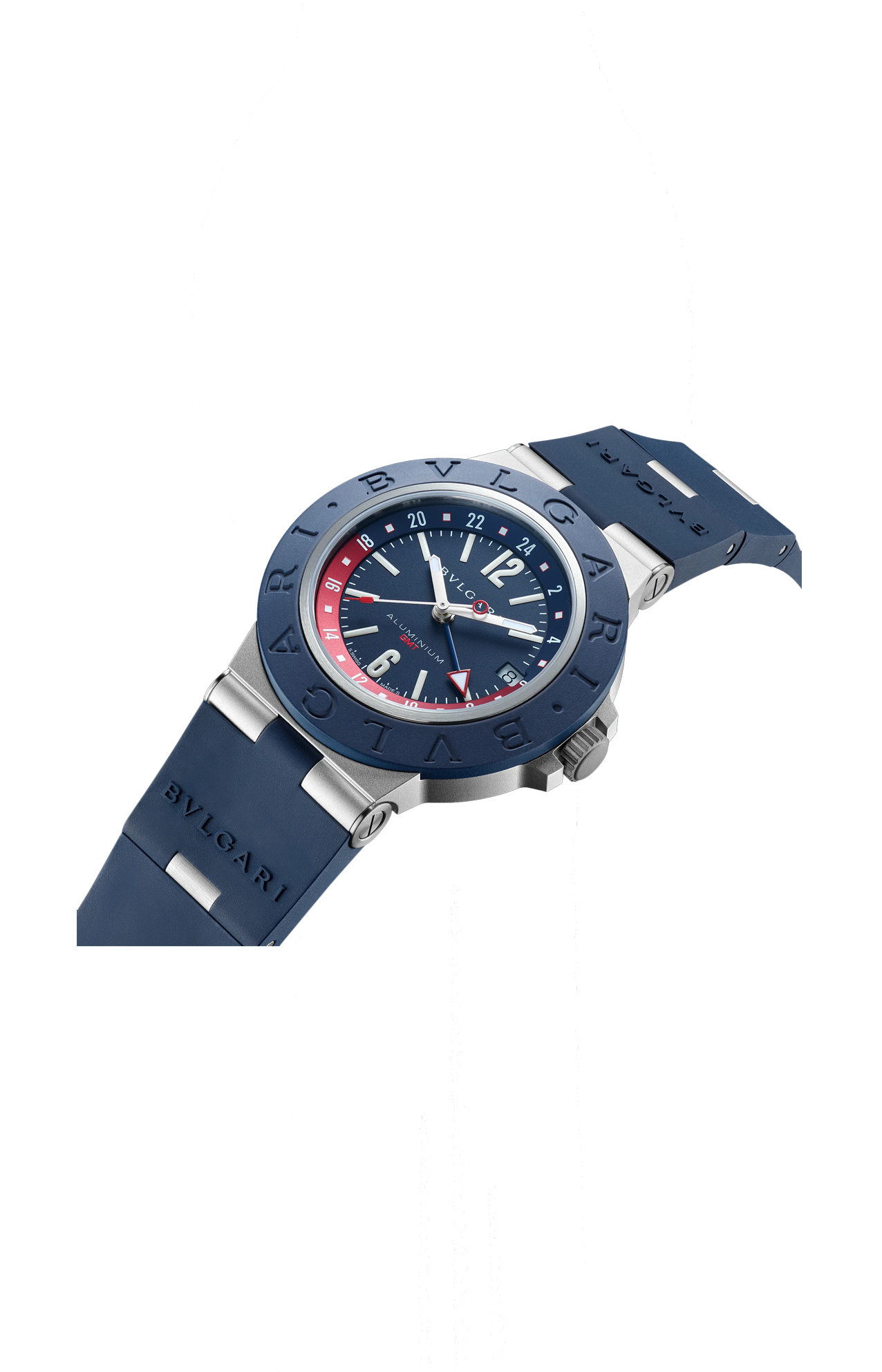 Orologio BVLGARI ALUMINIUM GMT con movimento meccanico a carica automatica, ore, minuti, secondi, data e funzione GMT 24H, calibro B192, cassa di 40 mm in alluminio, lunetta in caucciù blu con doppio logo, quadrante blu con indici e lancette SLN, finestrella della data, fondello in titanio, anse in alluminio e cinturino in caucciù blu con fibbia ad ardiglione in alluminio. Impermeabile fino a 100 metri.