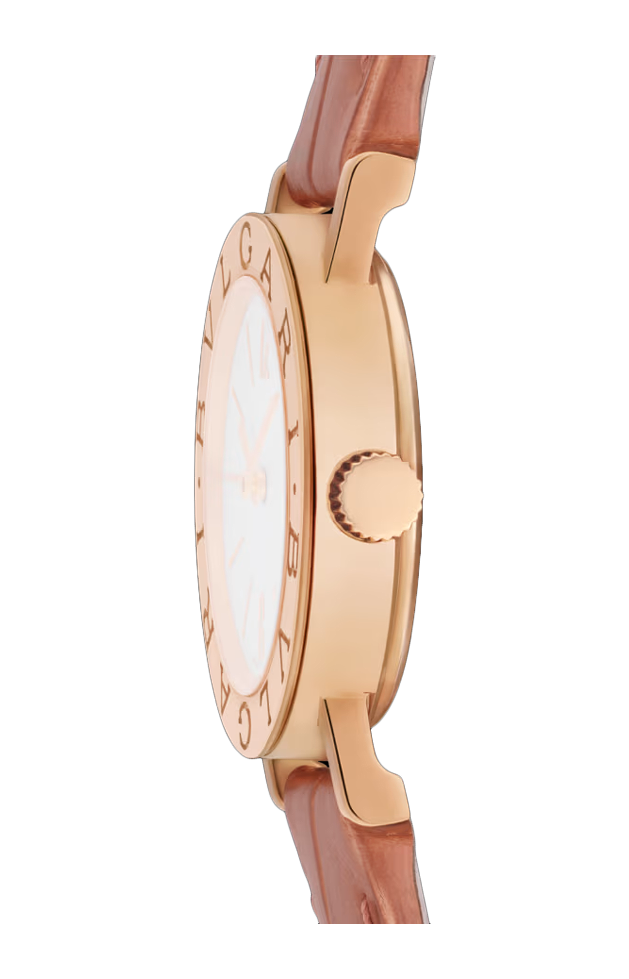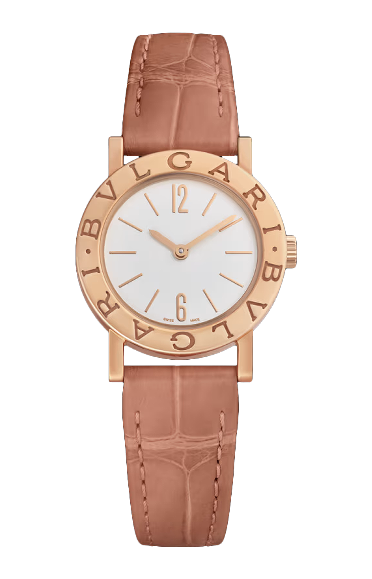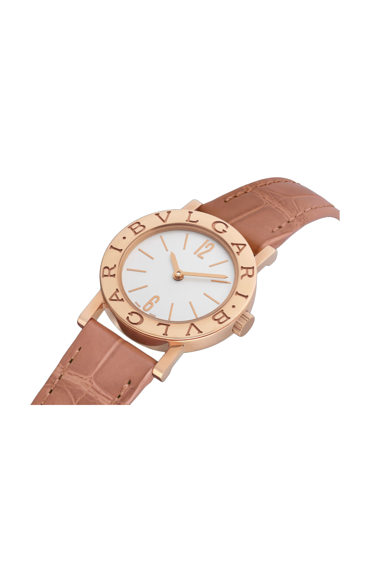 Orologio BVLGARI BVLGARI con movimento al quarzo, funzioni ore e minuti, cassa di 26 mm in oro rosa 18 kt, lunetta in oro rosa 18 kt con doppio logo, quadrante opalino bianco, lancette e indici color oro, corona in oro rosa 18 kt, cinturino in alligatore beige con cuciture e fibbia ad ardiglione in oro rosa 18 kt. Impermeabile fino a 30 metri.
