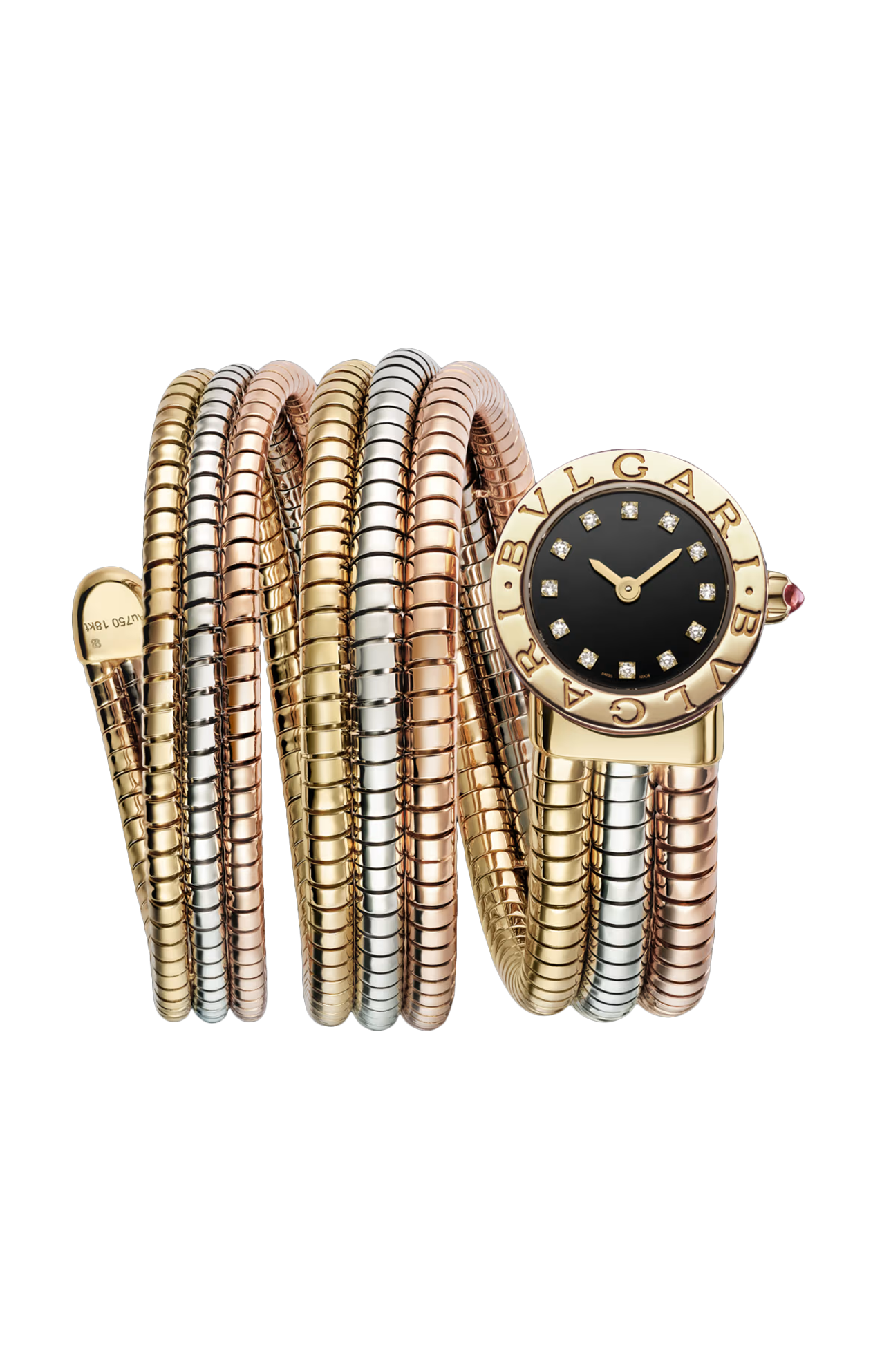 Orologio BVLGARI BVLGARI TUBOGAS con movimento al quarzo, funzioni ore e minuti, cassa di 21 mm in oro giallo 18 kt, lunetta in oro giallo 18 kt con doppio logo, quadrante laccato nero, indici con 12 diamanti tondi taglio brillante, corona in oro giallo 18 kt con rubellite rosa taglio cabochon, mini bracciale Tubogas a due giri in oro giallo, oro bianco e oro rosa 18 kt. Impermeabile fino a 50 metri.
