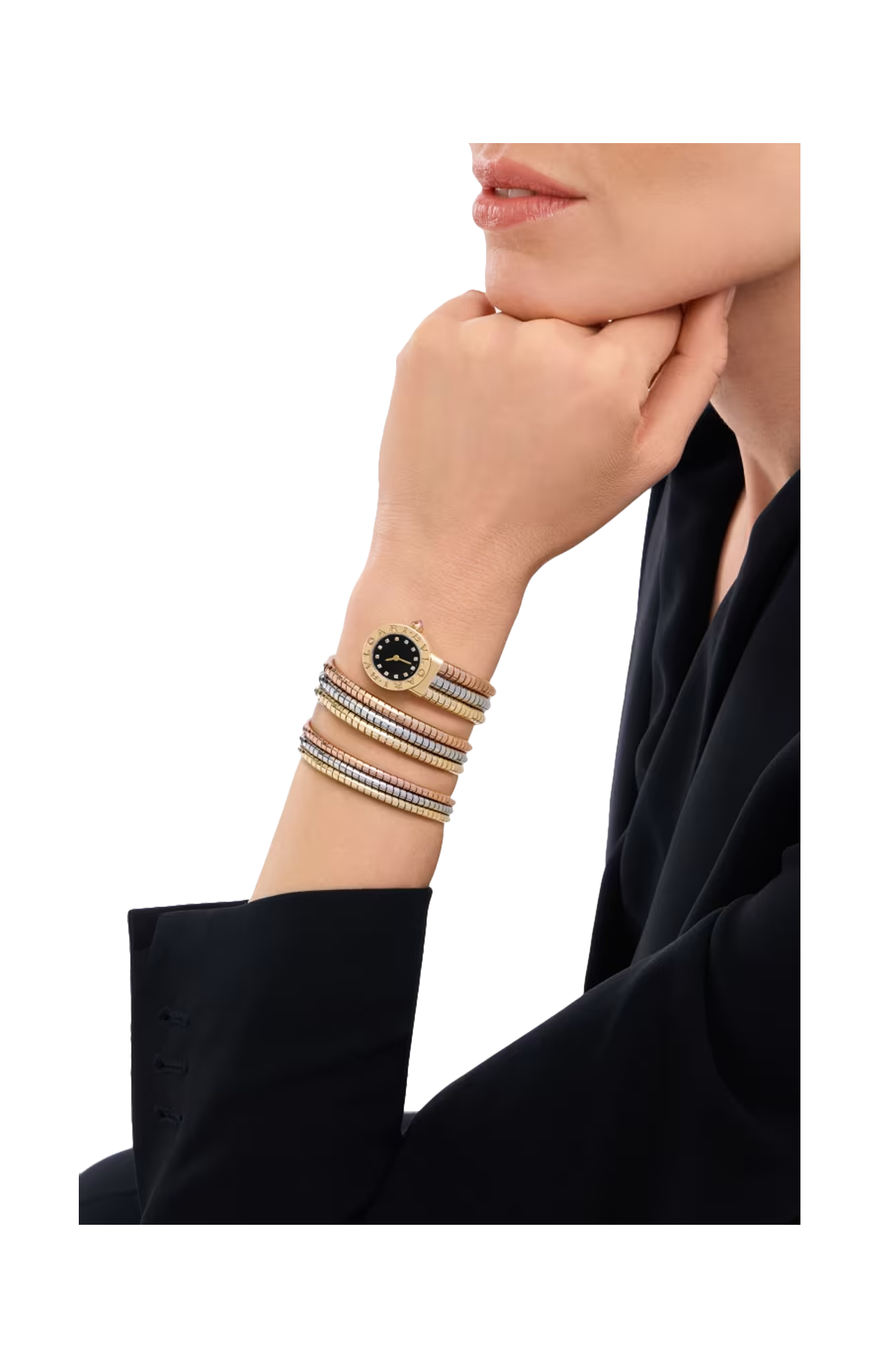 Combinando due emblemi dello spirito pionieristico e dell'innovativo design di BVLGARI, l’orologio BVLGARI BVLGARI TUBOGAS unisce alla leggerezza tubolare della celebre tecnica Tubogas un elemento distintivo dello stile della Maison. Ispirato alle iscrizioni riportate lungo il bordo delle antiche monete romane, l'iconico doppio logo inciso sulla lunetta in oro giallo 18 kt fa da contorno a un quadrante laccato nero. Un simbolo dell’impareggiabile maestria di BVLGARI nell’unire tradizione e modernità in creazioni dal fascino senza tempo, capaci di andare oltre ogni epoca e tendenza. Realizzato in tre diverse tonalità di oro, il flessuoso bracciale a doppio giro è un'interpretazione contemporanea di una storica creazione della Maison. Gli indici con diamanti taglio brillante danno al modello un tocco di preziosa eleganza.
