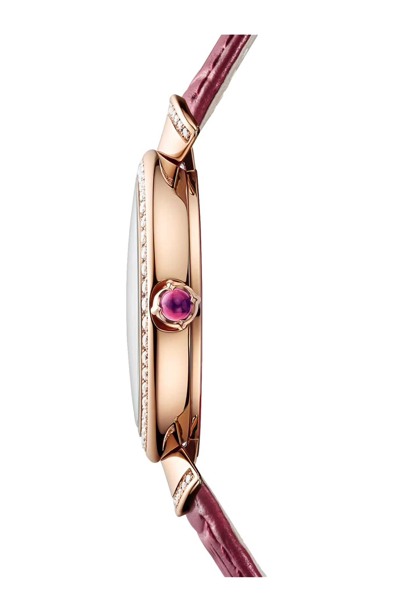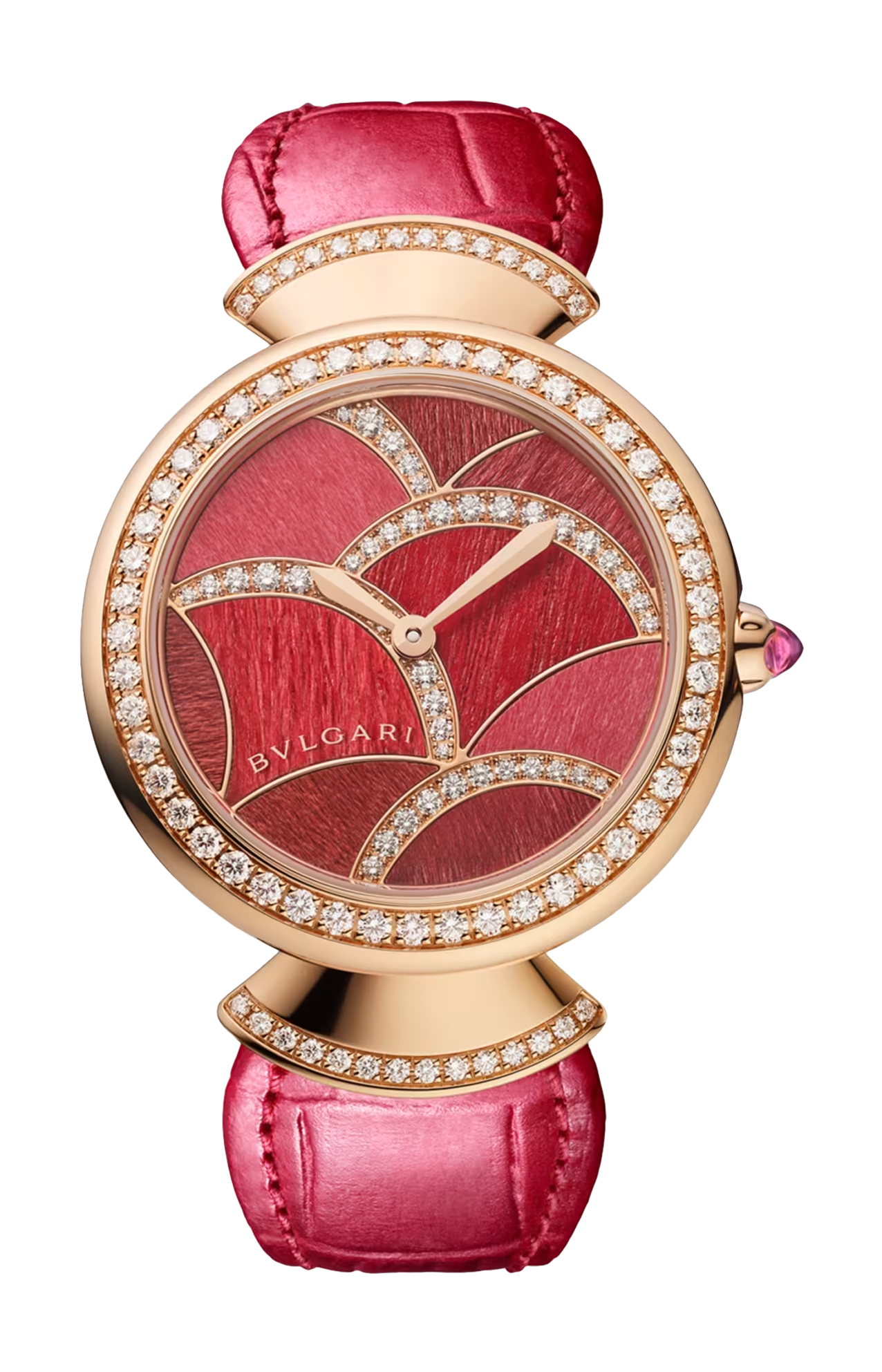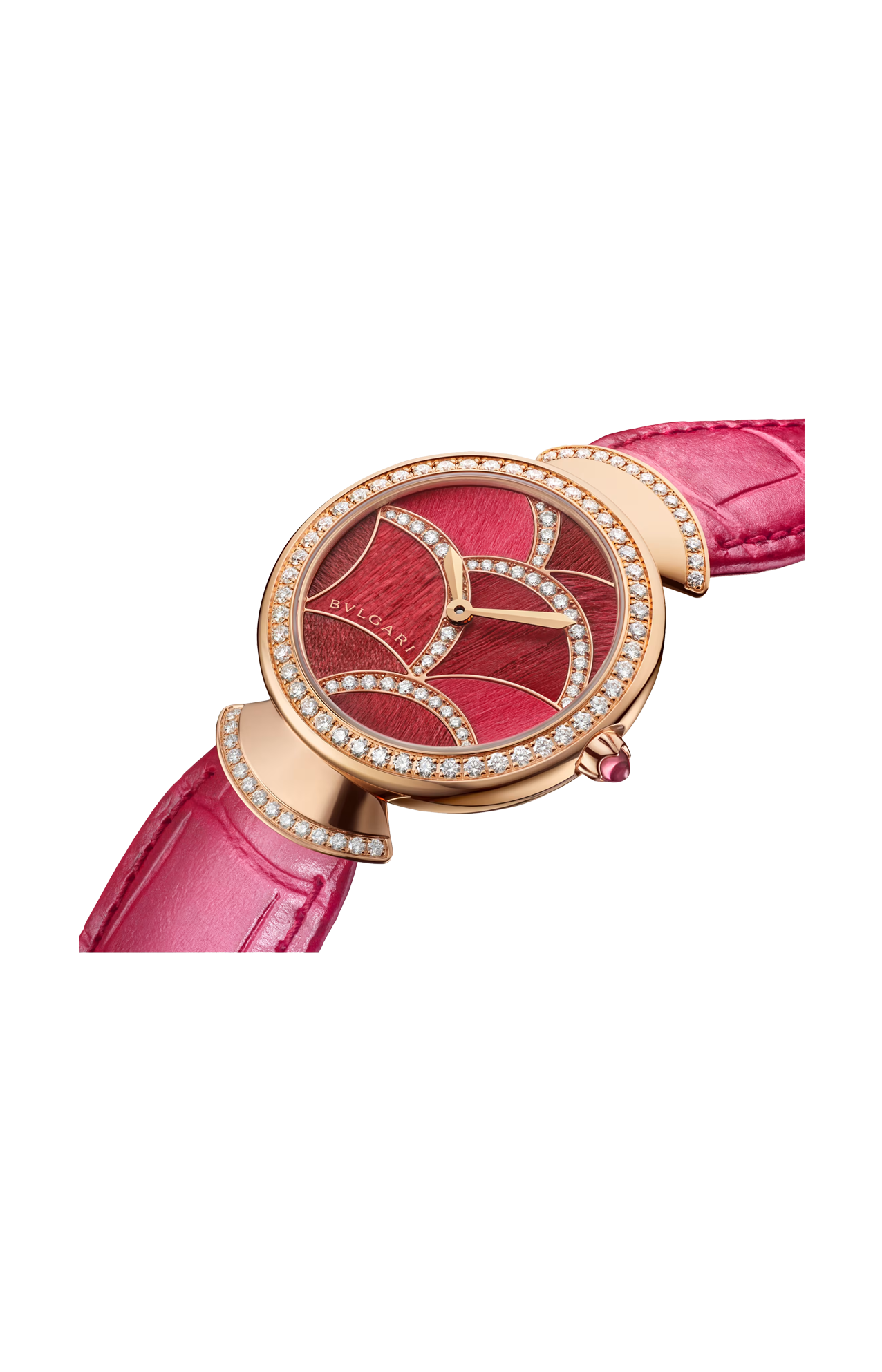 Emblema della gioiosa creatività della maison e del suo eccezionale savoir-faire nell'arte della gioielleria, l'orologio Divas' Dream in oro rosa 18 kt è una sublime attestazione della maestria di BVLGARI nell'uso del colore, di materiali inediti e tecniche artigianali tradizionali. Affondando le radici nel patrimonio culturale romano, l’iconico motivo a ventaglio del quadrante è composto da inserti in legno rosso con pavé di diamanti, applicati a mano in un raffinato intarsio. A completare il modello, un cinturino in alligatore rosso.