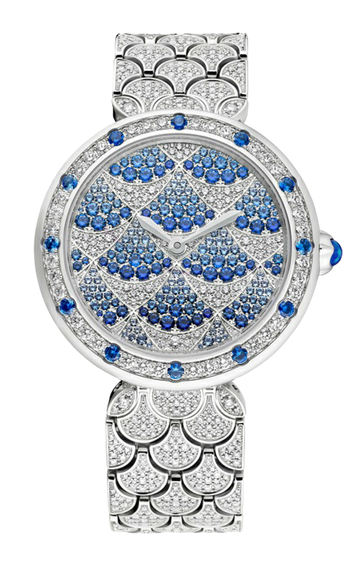 Orologio di alta gioielleria Divas' Dream Mosaica con movimento meccanico di manifattura a carica automatica, calibro BVL191 (spessore 3,8 mm), riserva di carica di 42 ore, frequenza 28.800 vph (4 hz), cassa di 37 mm e lunetta in oro bianco 18 kt con diamanti taglio brillante (~2,2 ct) e zaffiri blu (~0,6 ct), quadrante con motivo a ventaglio con diamanti incastonati a neve (~0,4 ct) e zaffiri blu (~2,10 ct), lancette in oro bianco, corona in oro bianco 18 kt con zaffiro blu taglio cabochon (~0,3 ct) e bracciale con maglie a ventaglio in oro bianco 18 kt con diamanti (~5,1 ct). Impermeabile fino a 30 metri.