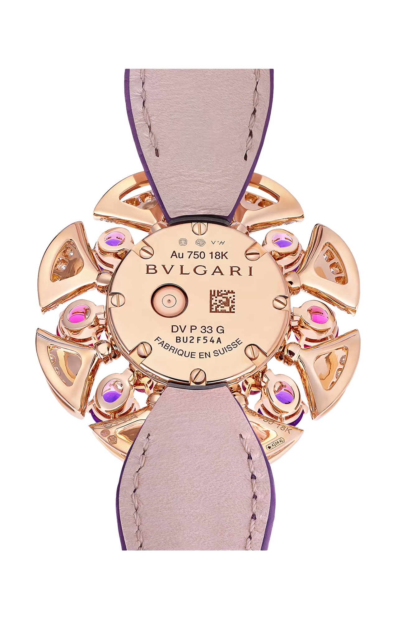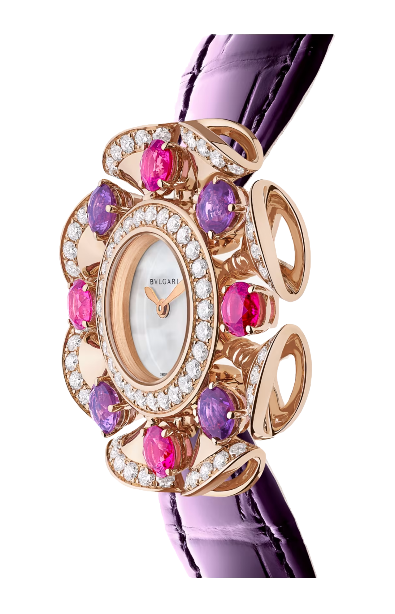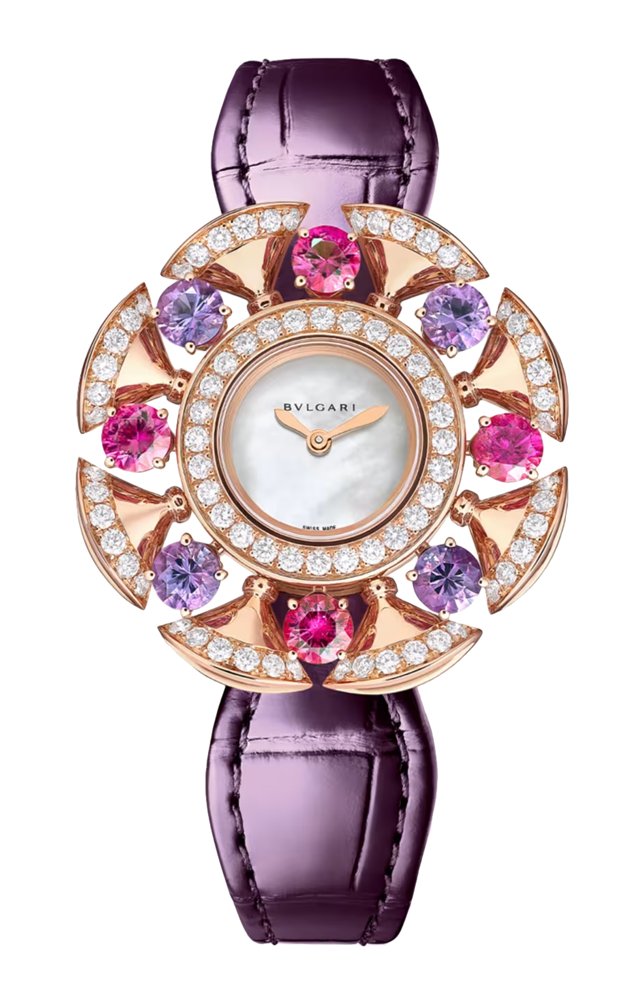 Orologio Divas' Dream con movimento al quarzo, cassa di 33 mm in oro rosa 18 kt, petali in oro rosa 18 kt con diamanti tondi taglio brillante, affiancati da quattro ametiste e quattro tormaline, quadrante in madreperla, cinturino in alligatore viola e fibbia déployante in oro rosa 18 kt con diamanti. Impermeabile fino a 30 metri.