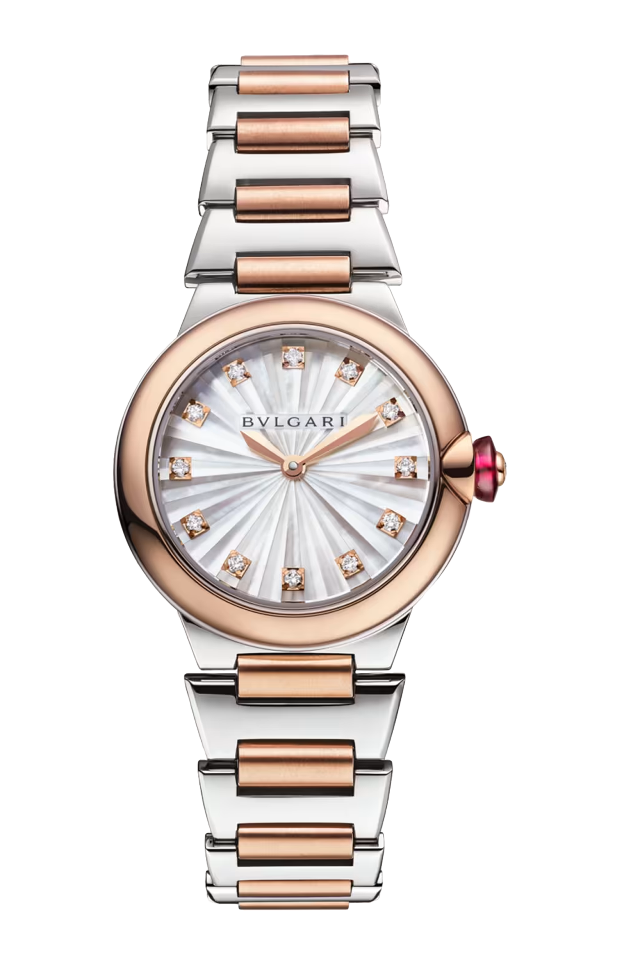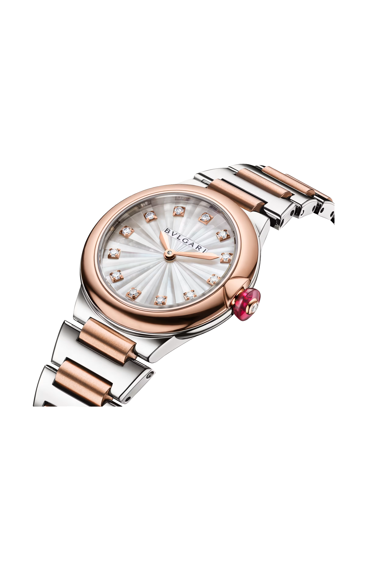Simbolo di una femminilità moderna e radiosa, l’orologio Lvcea dona un tocco di glamour allo stile di ogni giorno. Infuso di eccezionale maestria artigianale, quest'orologio in oro rosa 18 kt e acciaio inossidabile lucido e satinato-spazzolato è un emblema dell’eccellenza di Bvlgari nell’arte della gioielleria e dell'orologeria. Adornato da indici con diamanti, il quadrante tridimensionale si compone di elementi in madreperla bianca, singolarmente sfaccettati ed assemblati per evocare i raggi del sole. Una classica tecnica Métiers d’Art ispirata all’antica lavorazione ad intarsio.