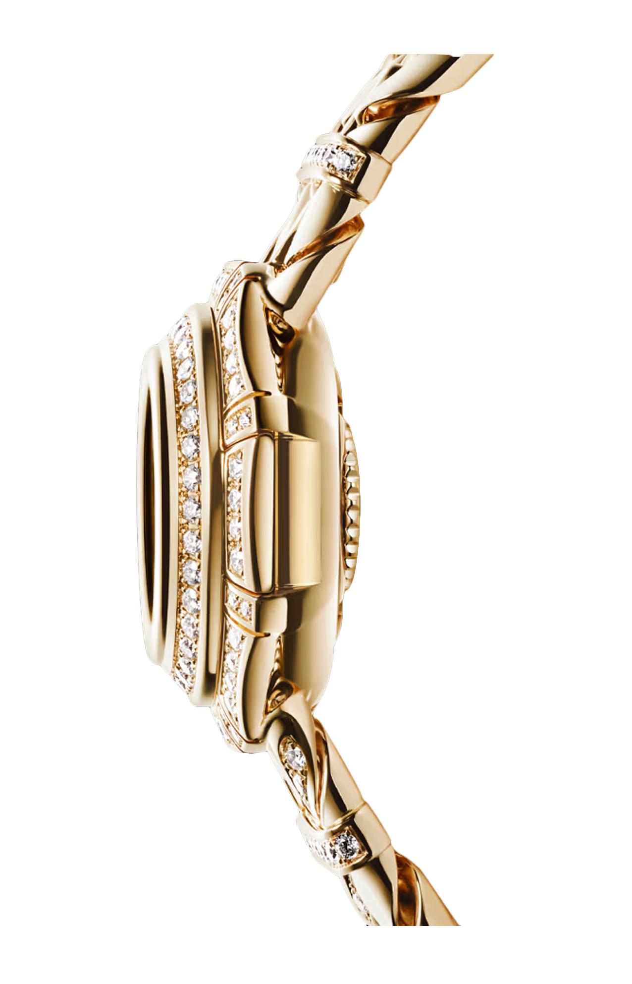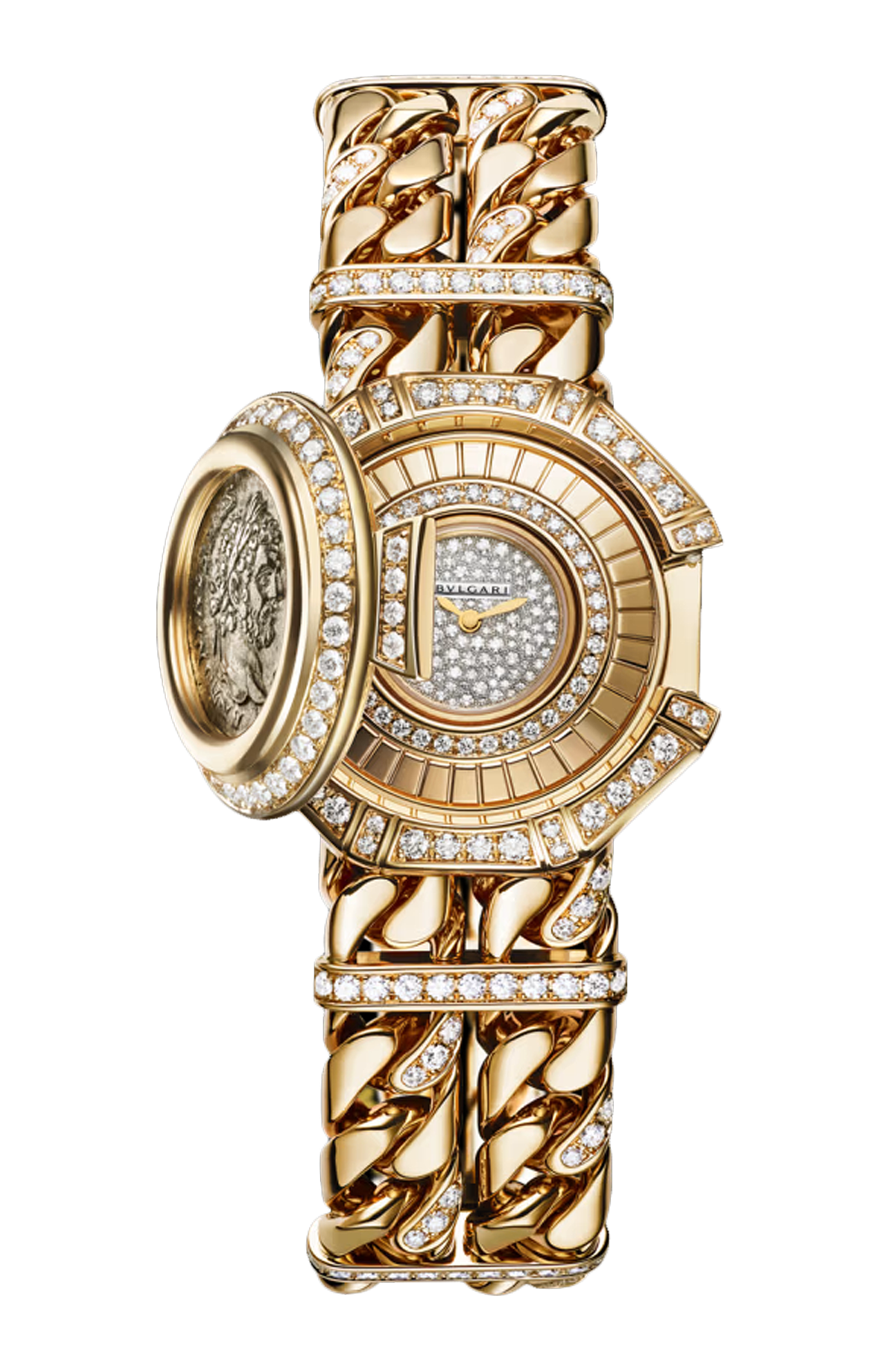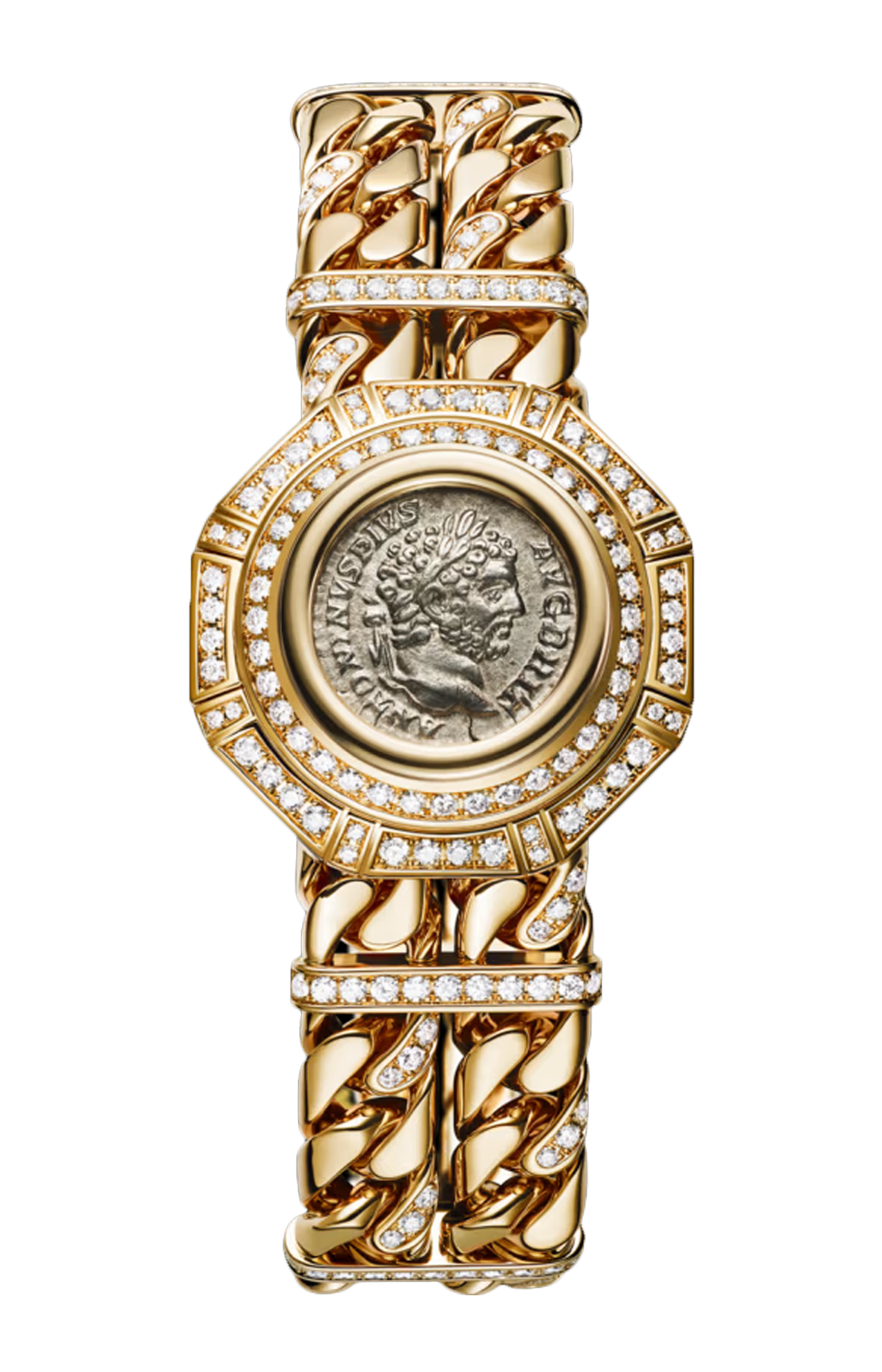 Appassionata nell’unire le caratteristiche della gloria imperiale di Roma con la sua estetica contemporanea, BVLGARI ha iniziato a incorporare monete millenarie nelle sue creazioni già negli anni ’60, portando il suo patrimonio unico in una modernità senza tempo. In linea con questa tradizione, l'orologio segreto monete catene high jewellery in oro giallo 18 kt presenta una moneta d'argento con l’effigie dell’imperatore Caracalla, che regnò dal 198 al 217 d.C. Alimentato dal micro-movimento piccolissimo di manifattura, il segnatempo combina una cassa ottagonale incastonata con diamanti a un bracciale morbido composto da due catene d'oro che abbracciano il polso, mentre un quadrante interamente pavé di diamanti è nascosto sotto la copertura.