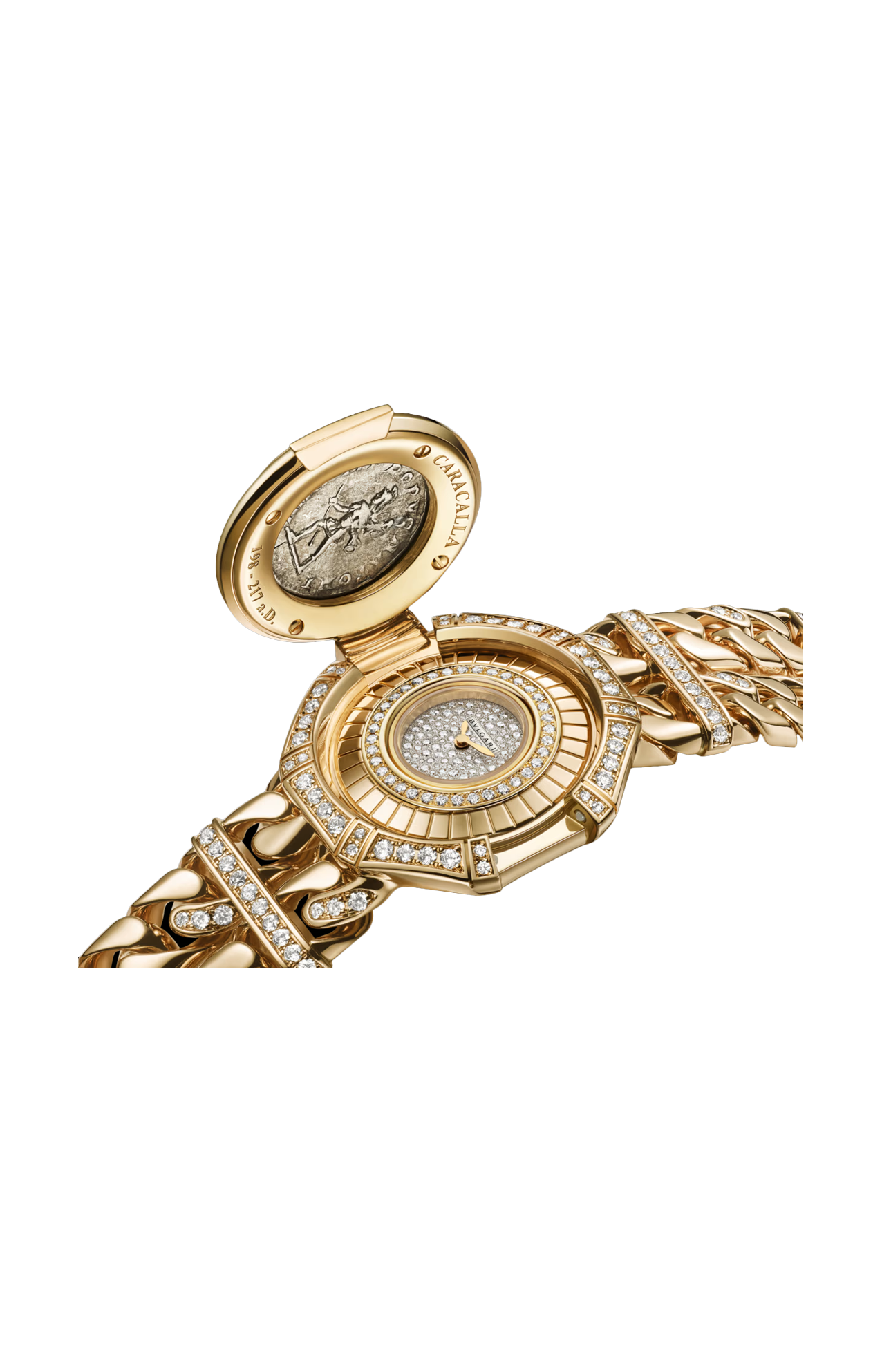 Orologio segreto monete catene high jewellery con micro-movimento meccanico piccolissimo a carica manuale (spessore 2,5 mm), riserva di carica di 30 ore, frequenza 21'600 vph (3hz), cassa in oro giallo 18 kt incastonata con diamanti taglio brillante, copertura in oro giallo 18 kt con moneta d'argento raffigurante l'imperatore Caracalla (198-217 d.C.), quadrante interamente pavé di diamanti, lancette placcate in oro giallo e bracciale a catena in oro giallo 18 kt incastonata con diamanti.