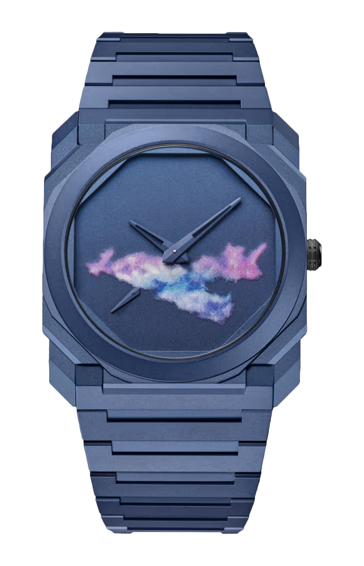 Vera opera d’arte, l’orologio Octo Finissimo Laurent Grasso Special Edition unisce all’iconico design, alle linee ultra-sottili e allo spirito innovativo dell’universo finissimo la visione creativa degli artisti concettuali francesi. Contraddistinto da un accattivante look in titanio con trattamento PVD blu, l’orologio presenta un quadrante in ottone con serigrafia a sette passaggi di colore, realizzata con pigmenti metallici, che richiama splendidamente le tonalità e l’eccezionale luminosità della cassa e del bracciale.