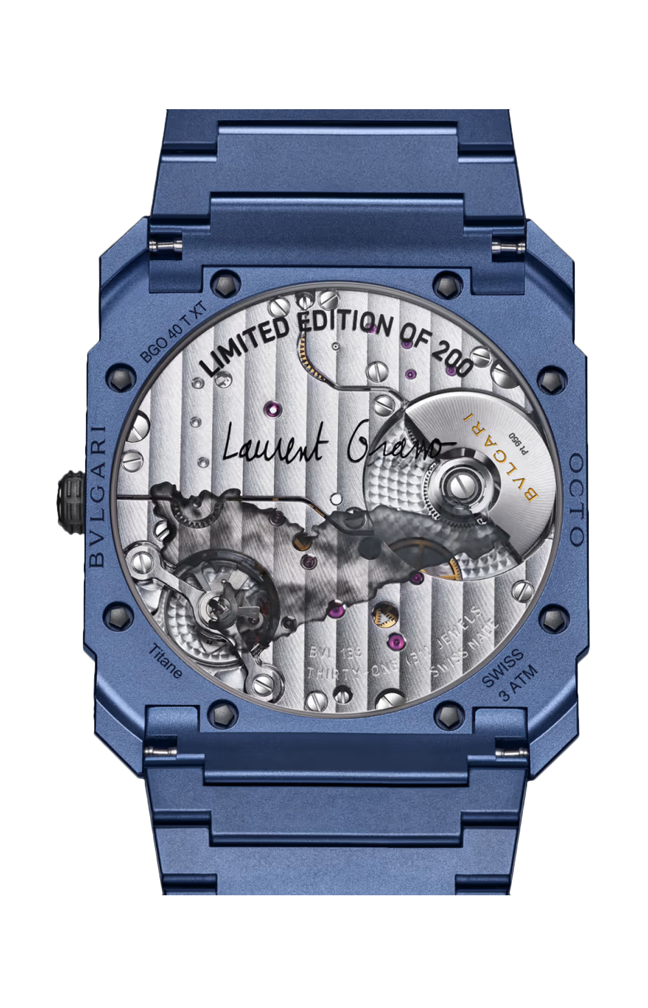 Orologio Octo Finissimo Laurent Grasso Special Edition con movimento meccanico di manifattura ultrasottile a carica automatica, microrotore in platino, calibro BVL 138 (spessore 2,23 mm) decorato a mano con finiture Côtes de Genève, anglage e perlage, frequenza 21.600 VPH (3 Hz), riserva di carica di 60 ore. Cassa di 40 mm (spessore 5 mm) e bracciale in titanio con trattamento PVD blu, quadrante personalizzato in ottone con serigrafia a sette passaggi di colore realizzata da Laurent Grasso con pigmenti metallici, lancette in ottone con trattamento PVD blu, corona a vite in titanio DLC con inserto in ceramica nera e fondello a vista personalizzato. Impermeabile fino a 30 metri. Edizione limitata da 200 pezzi.