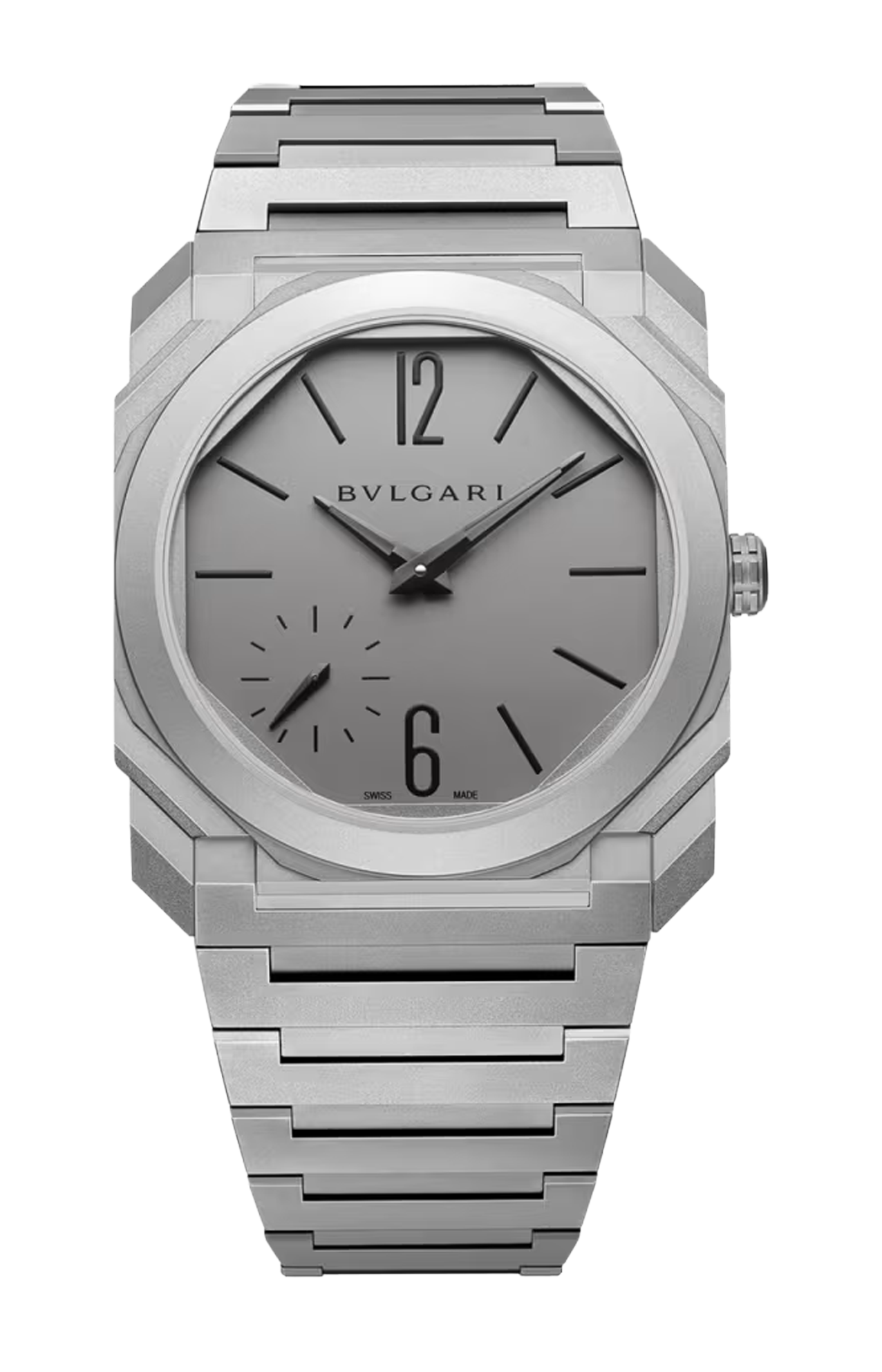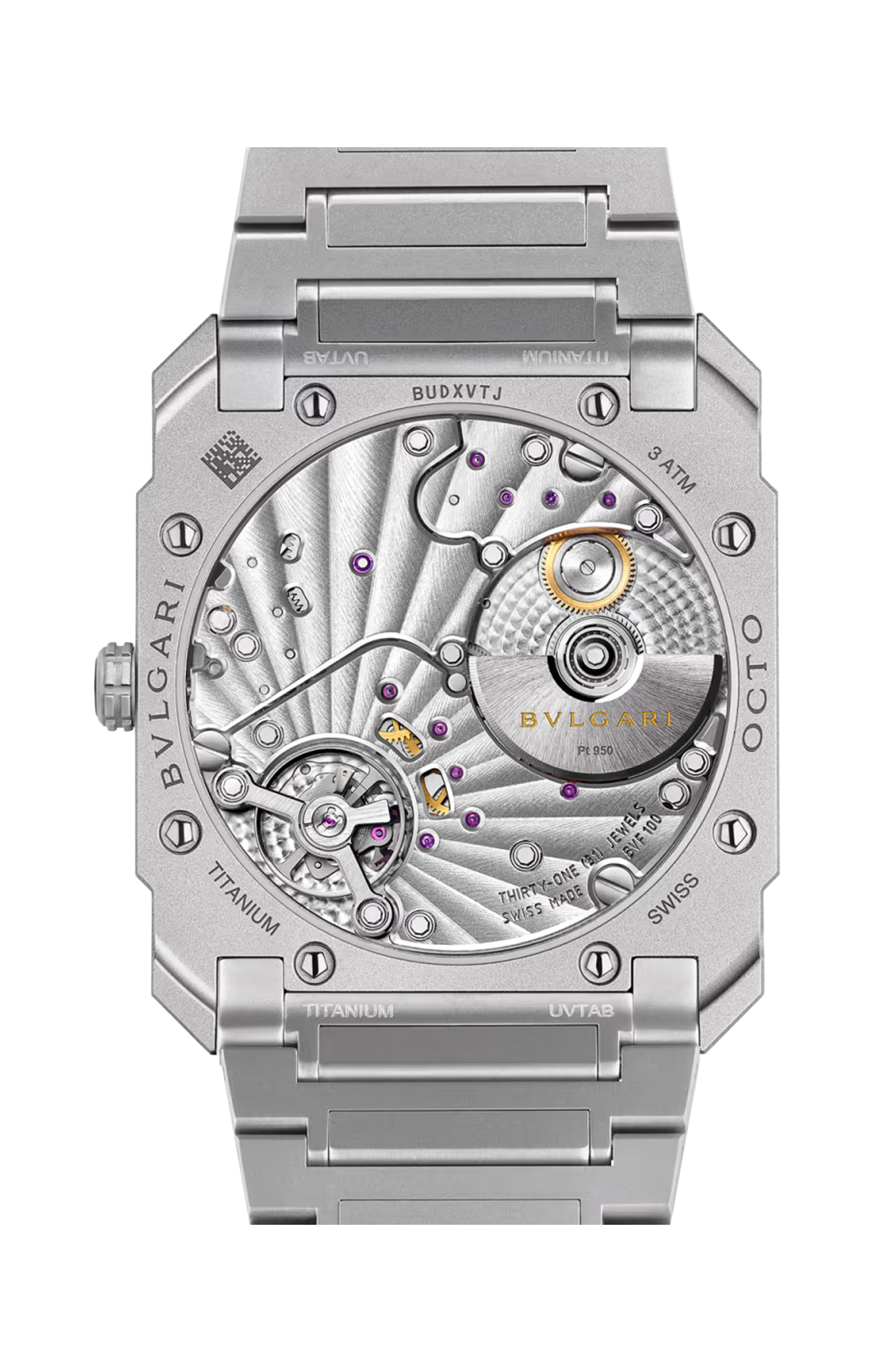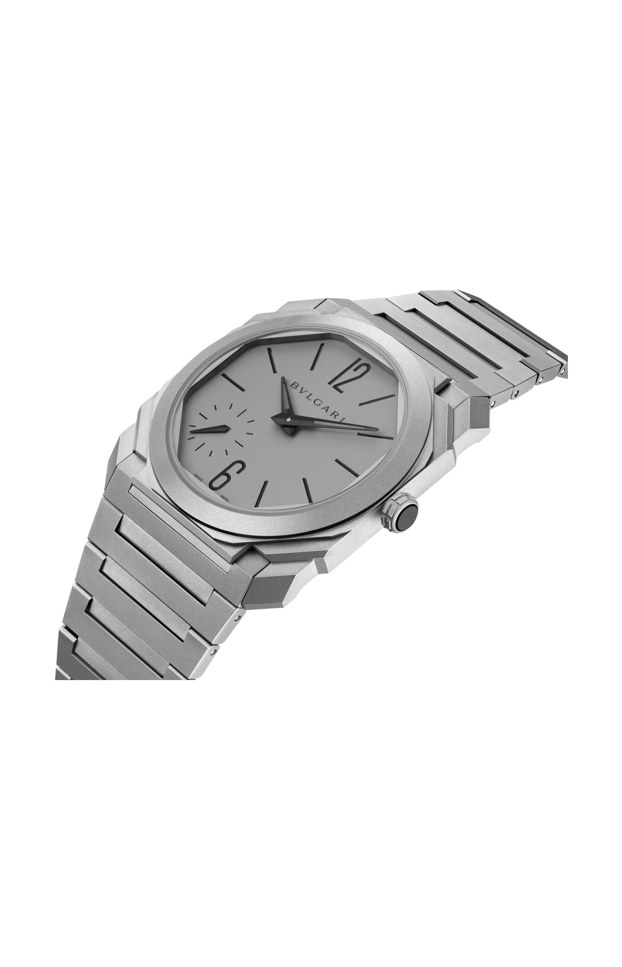 Vera icona del XXI secolo, l'orologio Octo Finissimo Automatic rappresenta un originale connubio tra l'audacia del design italiano e l'eccellenza dell'ingegneria svizzera. Dotato di una cassa del diametro di 37 mm e di un movimento ultrasottile a carica automatica con riserva di carica di 72 ore, l'orologio in titanio sabbiato unisce a un design dall’eleganza contemporanea una perfetta architettura interna. Emblema della maestria di Bvlgari nell’arte della gioielleria e dell’orologeria, la creazione riflette l’approccio distintivo della Maison alla lavorazione di materiali moderni e non convenzionali, nonché la sua abilità nel tracciare nuove tendenze del design nel panorama dell'orologeria svizzera. Orologio Octo Finissimo Automatic con movimento meccanico di manifattura ultrasottile (spessore 2,35 mm) a carica automatica, microrotore in platino, funzioni ore, minuti e piccoli secondi, calibro BVF 100 - Finissimo decorato a mano con finiture côtes de Genève, anglage e perlage, riserva di carica di 72 ore e frequenza 21.600 VpH (3 Hz). Cassa di 37 mm in titanio sabbiato (spessore 6,45 mm), corona a vite in titanio con inserto in ceramica, quadrante opalino in titanio, lancette e indici neri, fondello a vista, bracciale in titanio sabbiato con fibbia déployante integrata e pulsanti a pressione. Impermeabile fino a 30 metri.