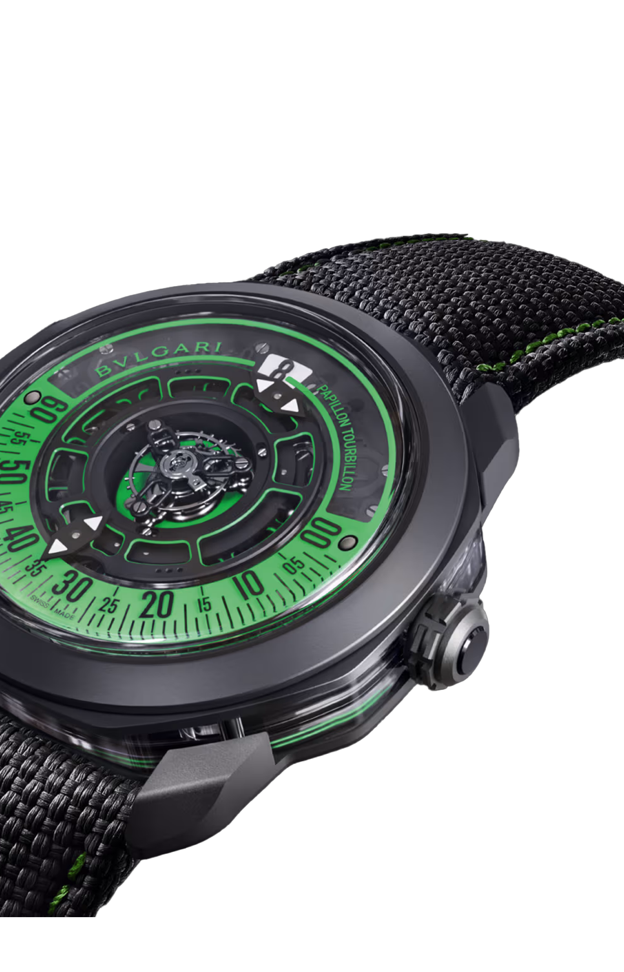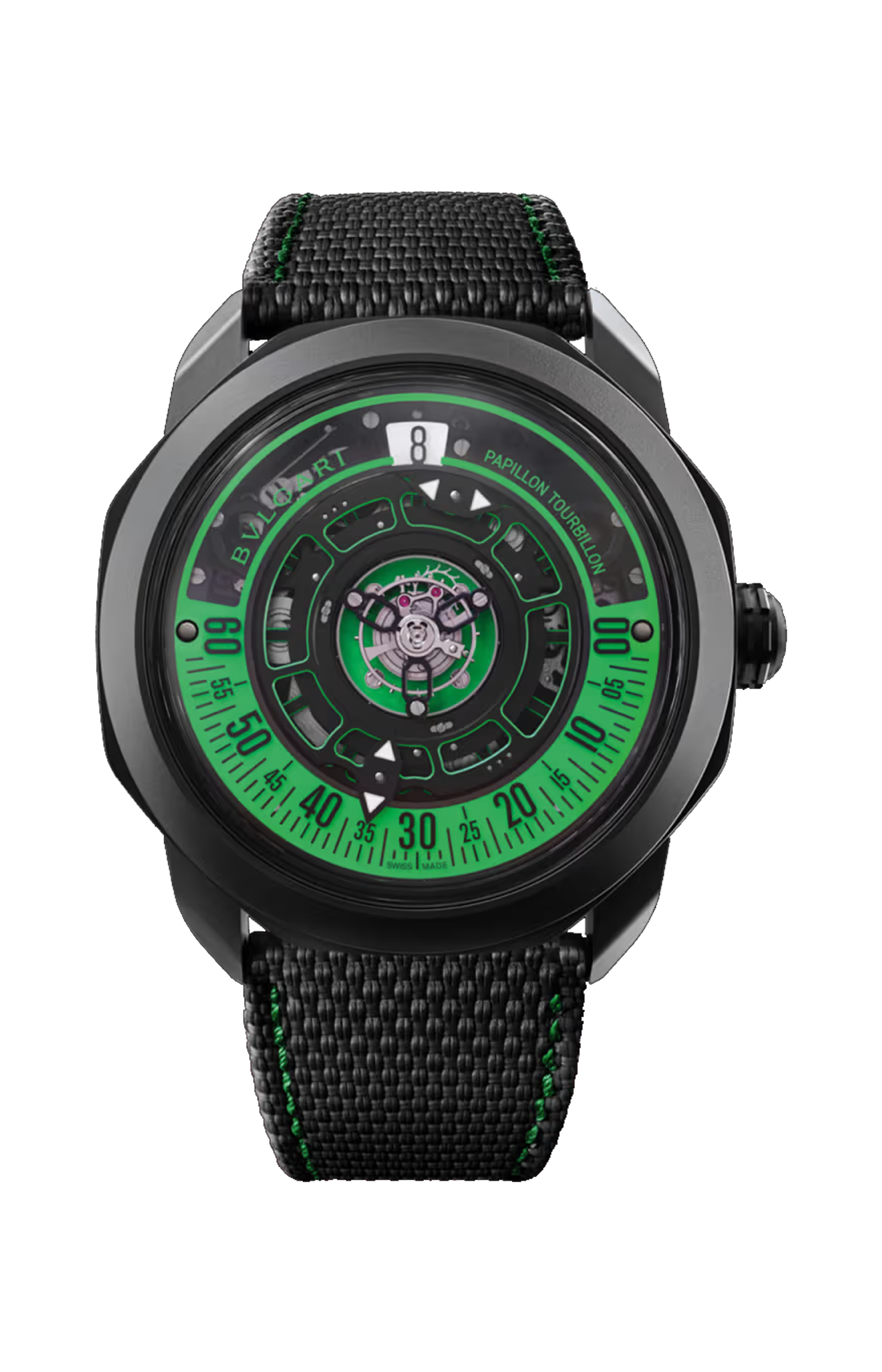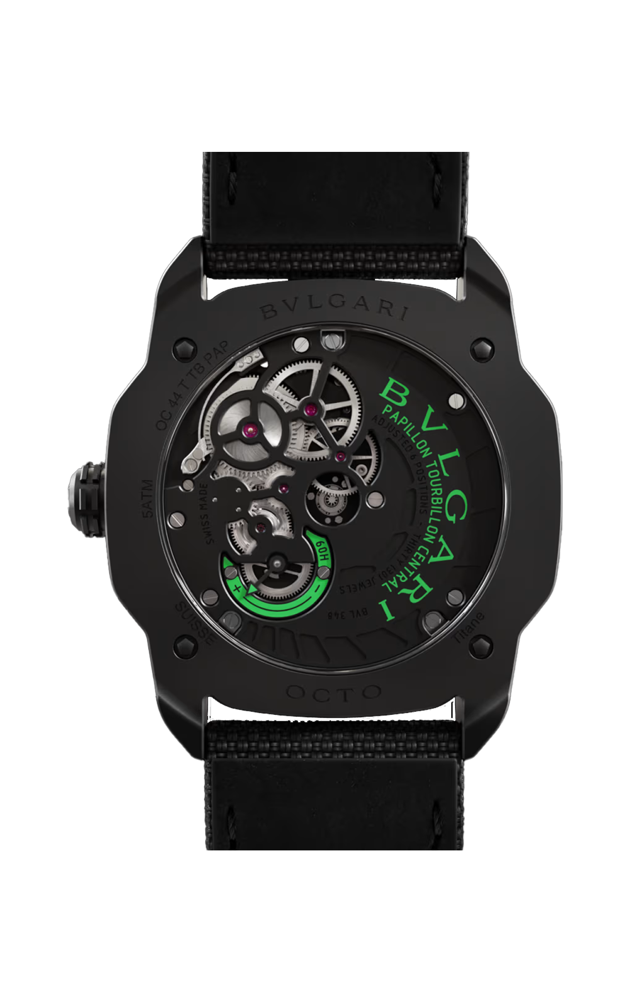 Orologio Octo Roma Papillon Tourbillon con movimento meccanico di manifattura (spessore 8,75 mm) a carica manuale, tourbillon volante centrale e indicazione dei minuti Papillon, ora saltante, calibro BVL348, riserva di carica di 60 ore e frequenza 21.600 VPH (3 Hz). Cassa di 44 mm in titanio con trattamento DLC nero (spessore 11,90 mm), carrure in vetro zaffiro, fondello a vista, corona in titanio con trattamento DLC nero e inserto in ceramica nera, movimento e quadrante con trattamento Super-Luminova®, cinturino in alligatore gommato nero con cuciture verdi e fibbia déployante in titanio con trattamento DLC nero. Impermeabile fino a 50 metri.