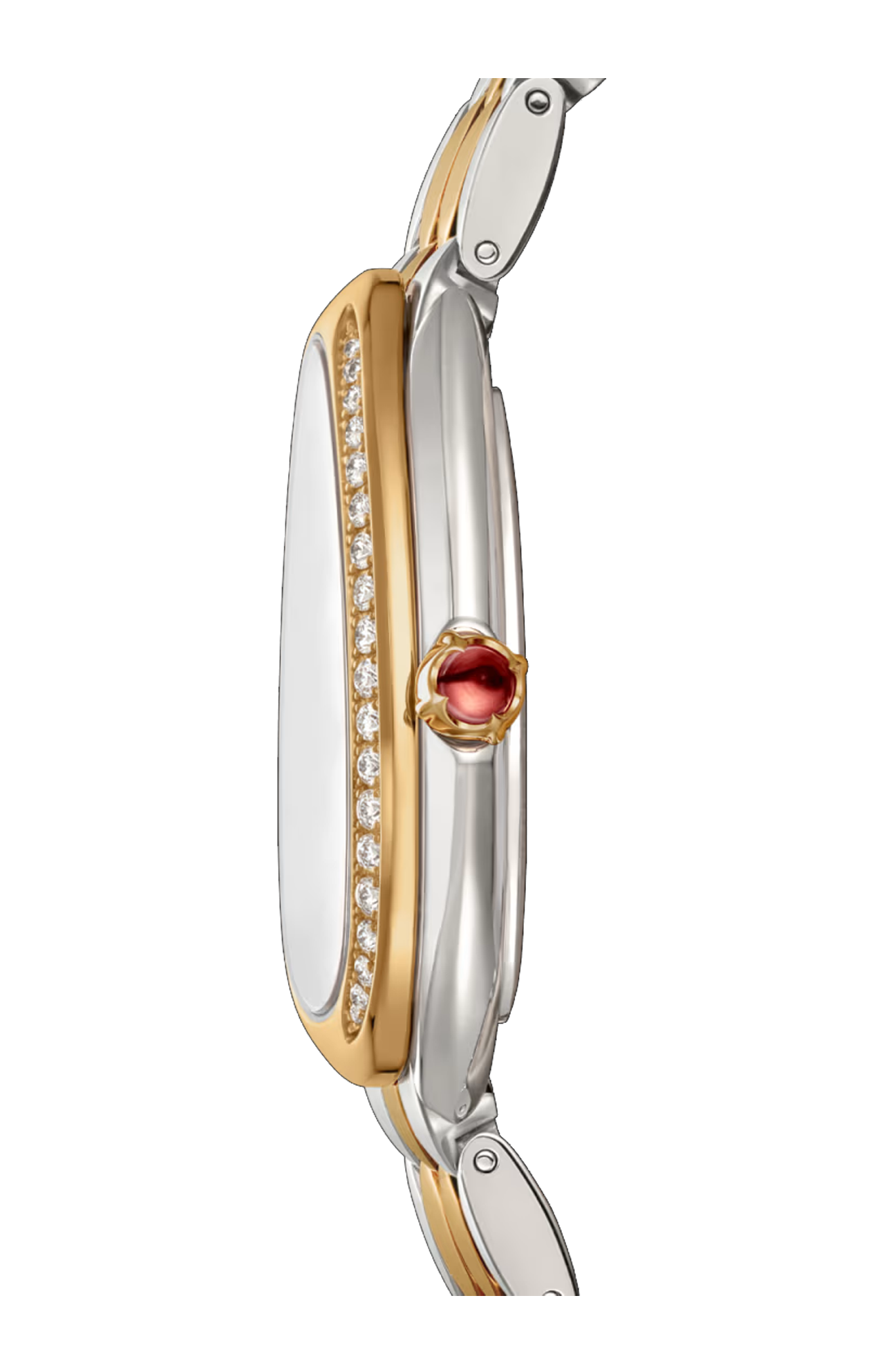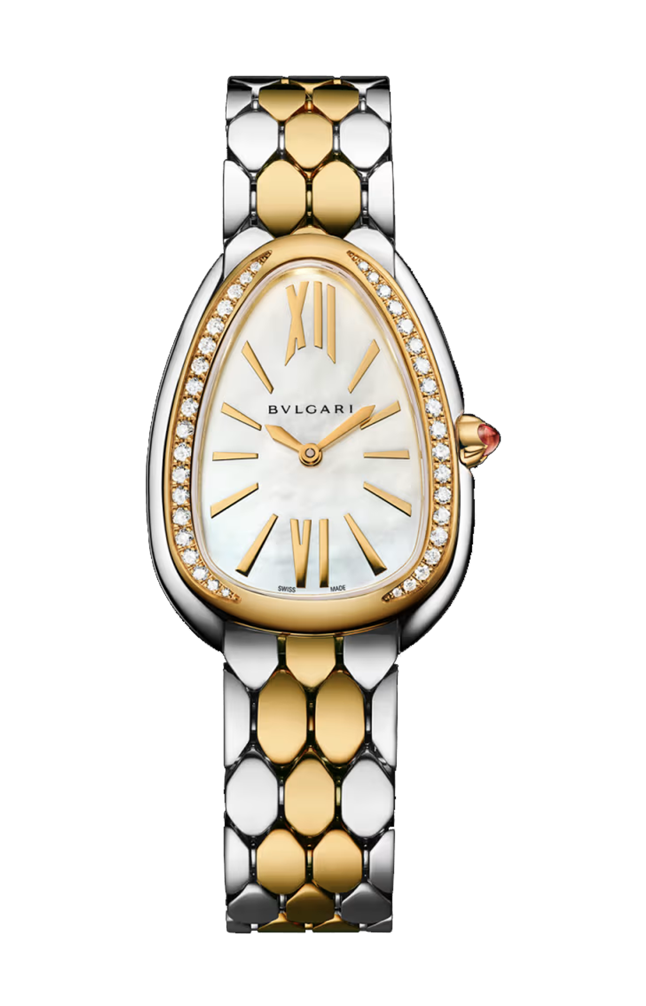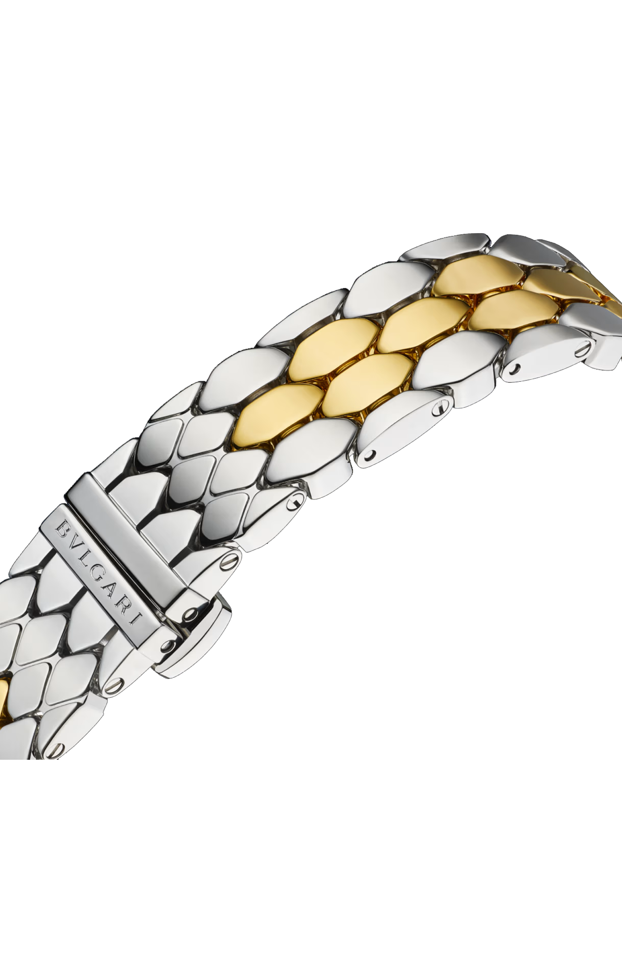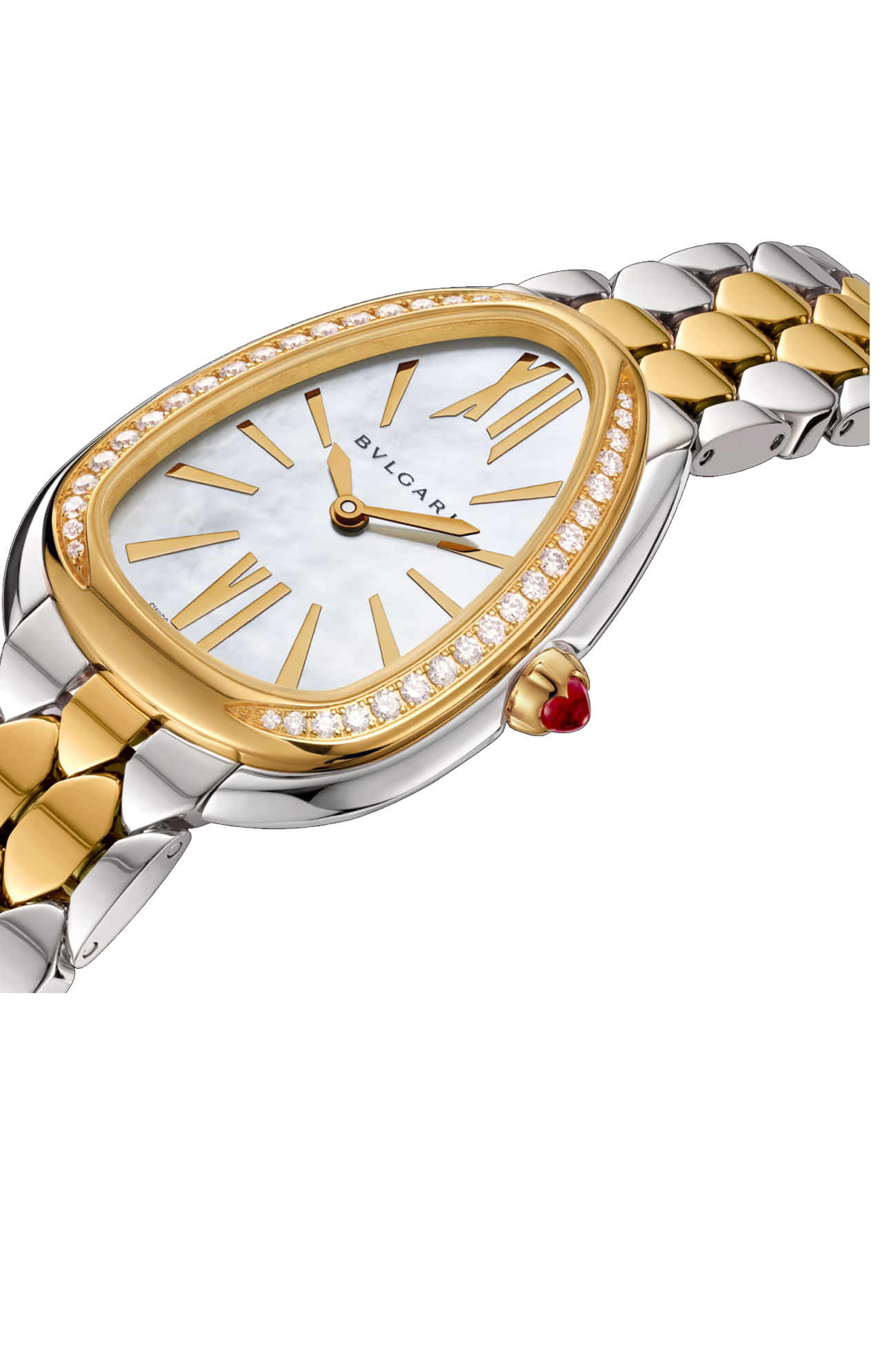 Con il raffinato splendore dei suoi preziosi materiali, l'orologio serpenti seduttori in oro giallo 18 kt e acciaio inossidabile è un irresistibile mix di sensualità, fascino misterioso e glamour contemporaneo. Contornato dall'iconico design a goccia della cassa, l'incantevole quadrante in madreperla è illuminato da una lunetta con diamanti, per un effetto sofisticato e scintillante. Un perfetto connubio tra gioielleria e orologeria, suggellato da un seducente e flessuoso bracciale a squame esagonali ispirato al serpente. Orologio serpenti seduttori con movimento al quarzo, funzioni ore e minuti, cassa di 33 mm in acciaio inossidabile, lunetta in oro giallo 18 kt con diamanti taglio brillante, corona in oro giallo 18 kt con rubellite rosa taglio cabochon, quadrante in madreperla e bracciale in acciaio inossidabile e oro giallo 18 kt con fibbia déployante. Impermeabile fino a 30 metri.