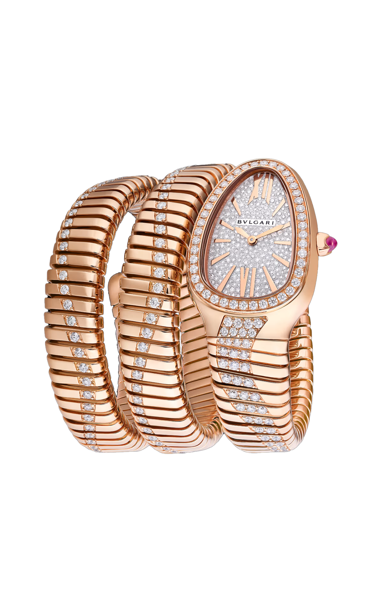 Orologio Serpenti Tubogas Infiniti con movimento al quarzo, funzioni ore e minuti, cassa di 35 mm e lunetta in oro rosa 18 kt con diamanti, corona in oro rosa 18 kt con tormalina rosa taglio cabochon, quadrante con pavé di diamanti, lancette placcate oro rosa e bracciale a spirale in oro rosa 18 kt con diamanti taglio brillante. Impermeabile fino a 30 metri.