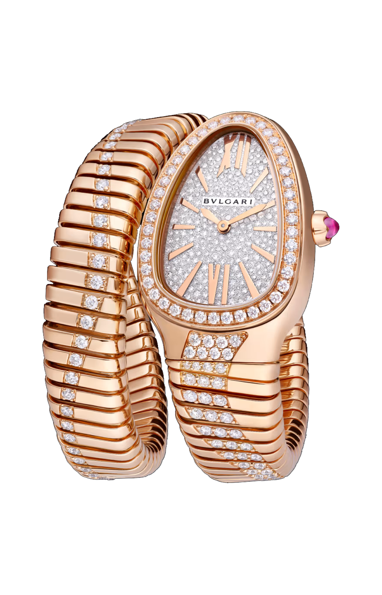 Orologio Serpenti Tubogas Infiniti con movimento al quarzo, funzioni ore e minuti, cassa di 35 mm e lunetta in oro rosa 18 kt con diamanti, corona in oro rosa 18 kt con tormalina rosa taglio cabochon, quadrante con pavé di diamanti, lancette placcate oro rosa e bracciale a spirale in oro rosa 18 kt con diamanti taglio brillante. Impermeabile fino a 30 metri.