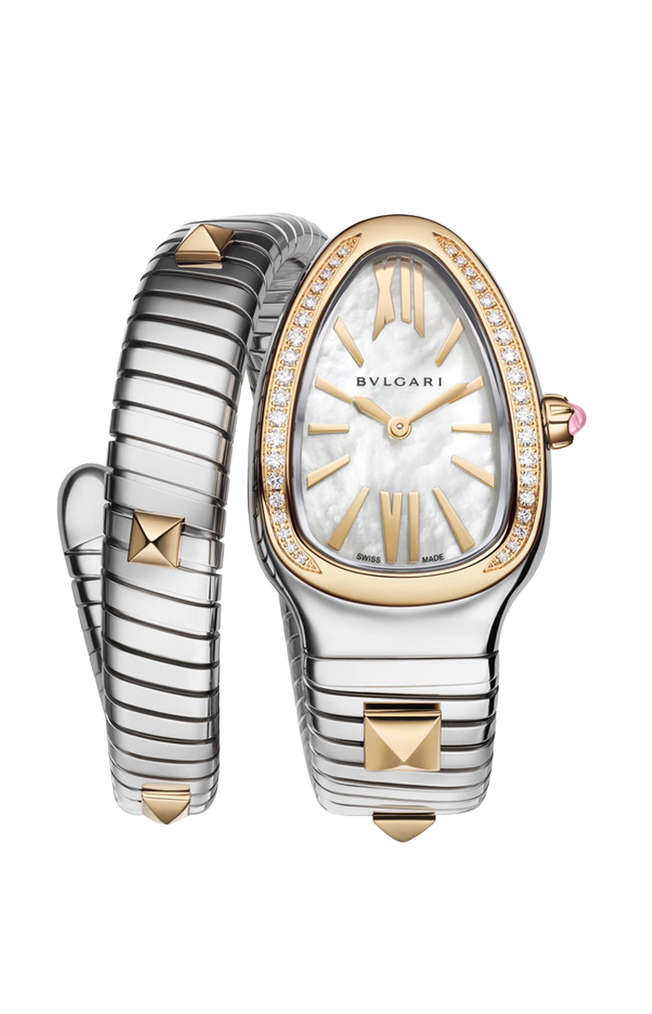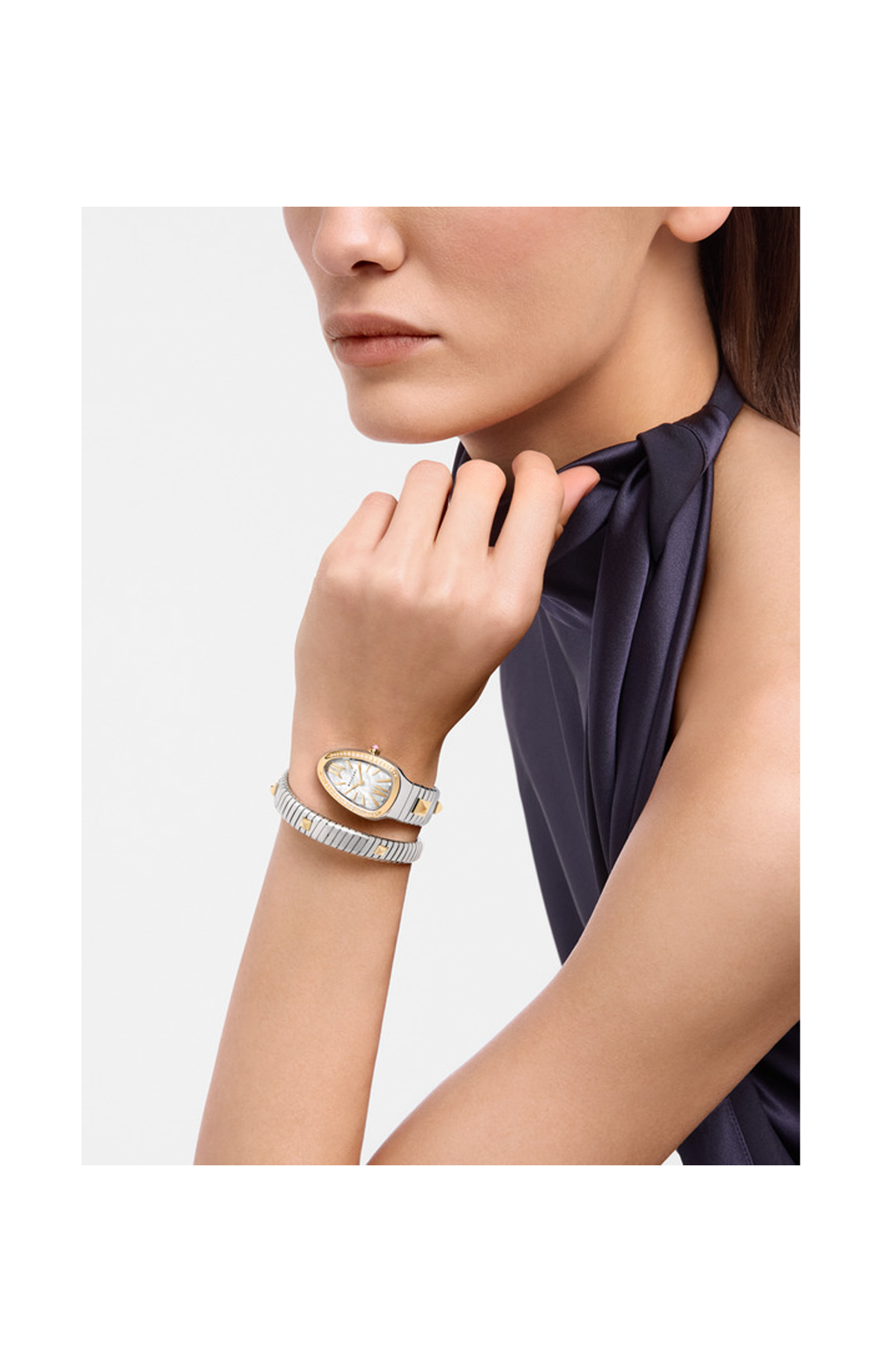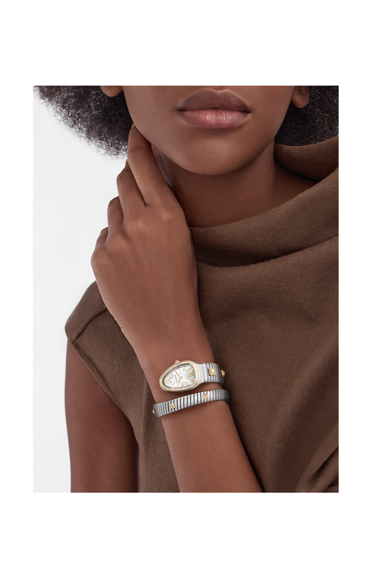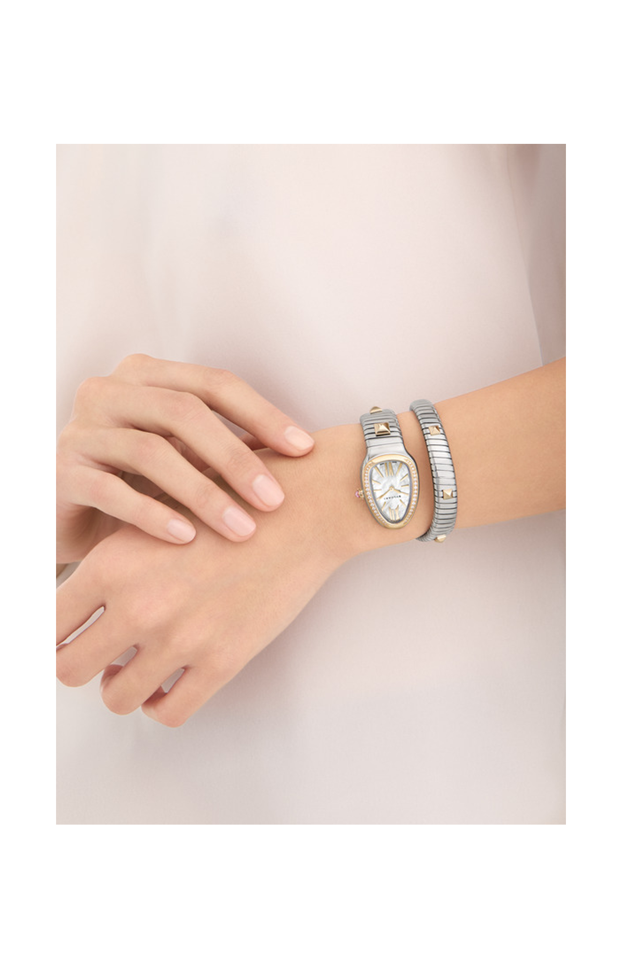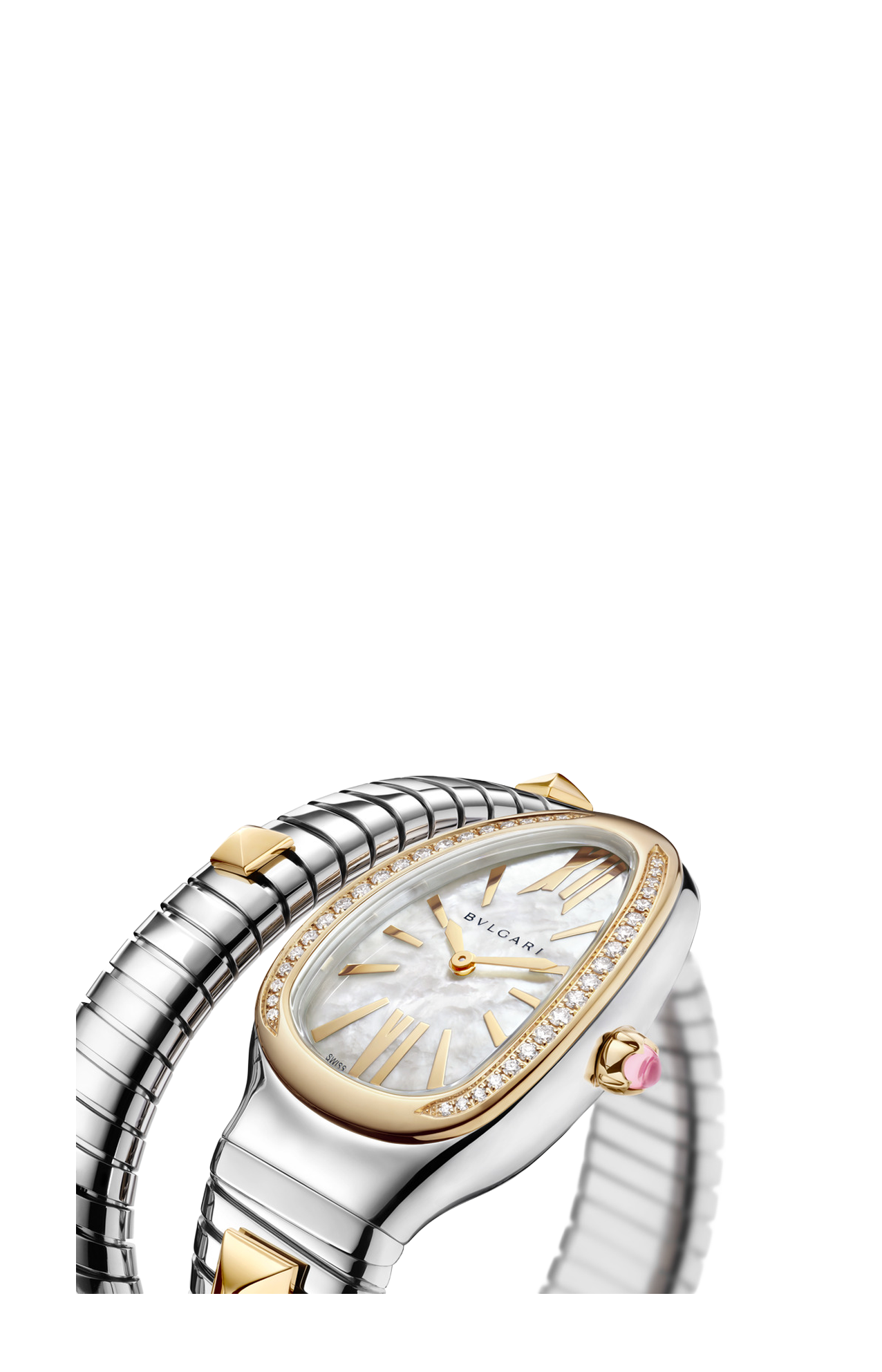 Misura 135 mm. Movimento al quarzo. Cassa acciaio e oro giallo 18 carati 35 mm, lunetta tempestata di diamanti, quadrante madreperla bianca (origine Indonesia), bracciale acciaio e oro giallo 18 carati. Funzioni ore, minuti. Impermeabilità 30 metri.