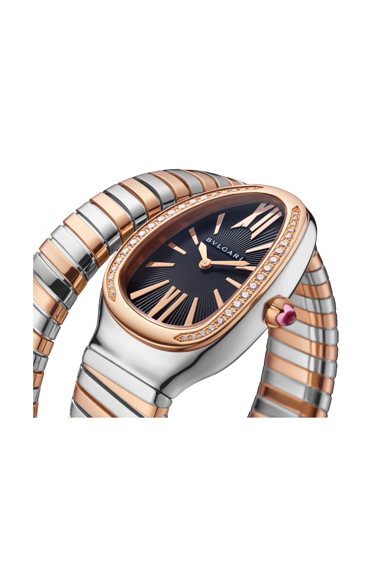 Orologio Serpenti Tubogas con movimento al quarzo, cassa curva di 35 mm in acciaio inossidabile, lunetta in oro rosa 18 kt con diamanti taglio brillante, corona in oro rosa 18 kt con rubellite rosa taglio cabochon, quadrante opalino nero con finiture guilloché soleil e indici applicati a mano, bracciale a spirale in oro rosa 18 kt e acciaio inossidabile.