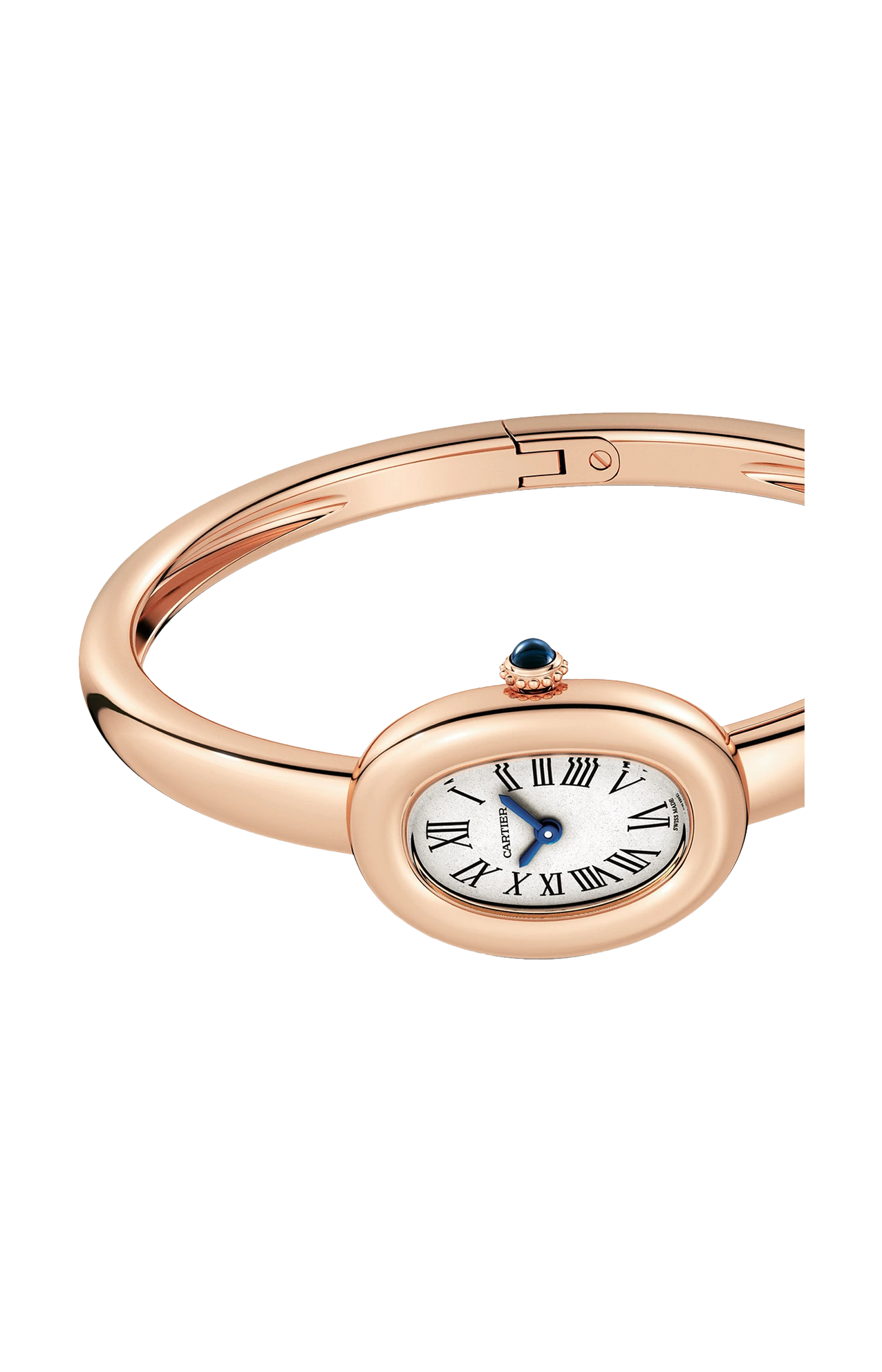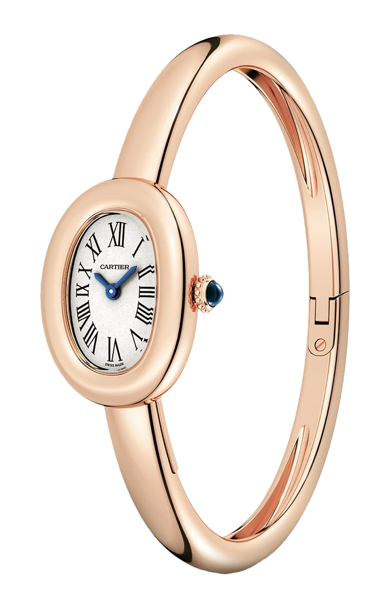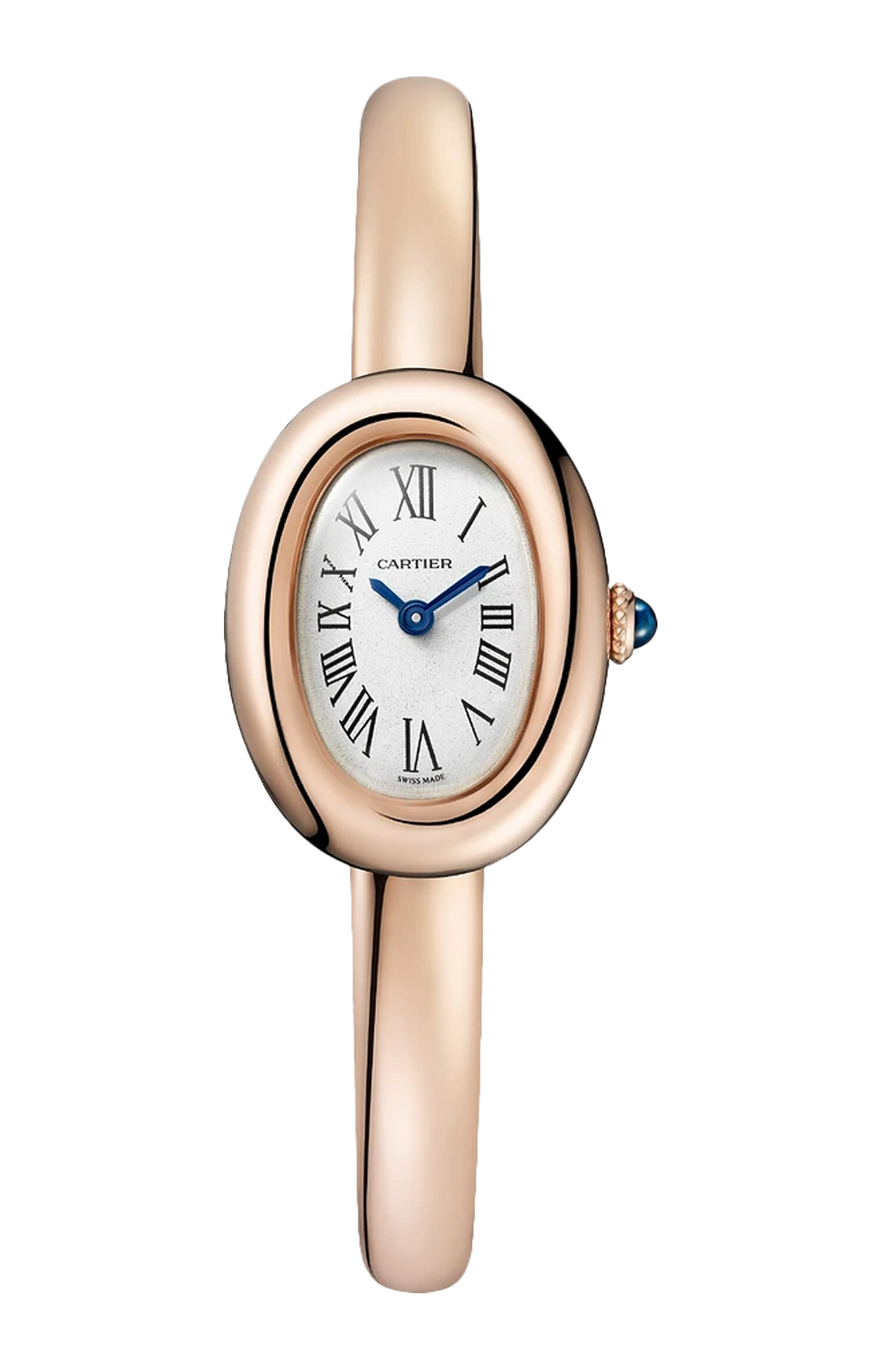 Orologio Baignoire de Cartier, modello mini, misura 17, movimento al quarzo. Cassa in oro rosa 750/1000. Corona perlata in oro rosa 750/1000 ornata di uno zaffiro cabochon. Bracciale rigido in oro rosa 750/1000. Quadrante argentato, lancette a forma di gladio d’acciaio azzurrato, vetro zaffiro. Dimensioni della cassa 24,6 x 18,7 mm, spessore 7,2 mm. Impermeabile fino a 30 metri.