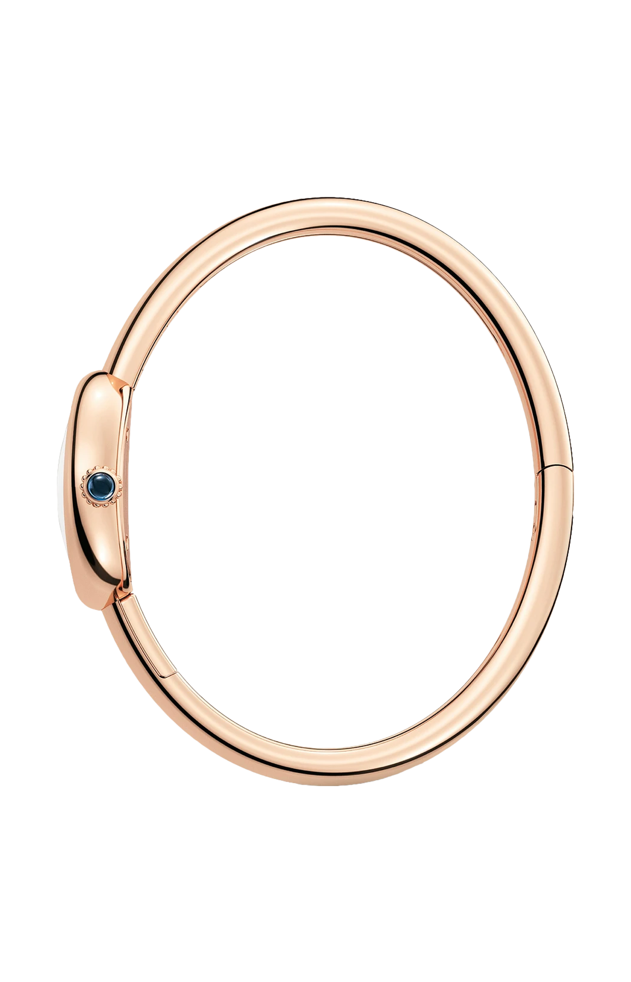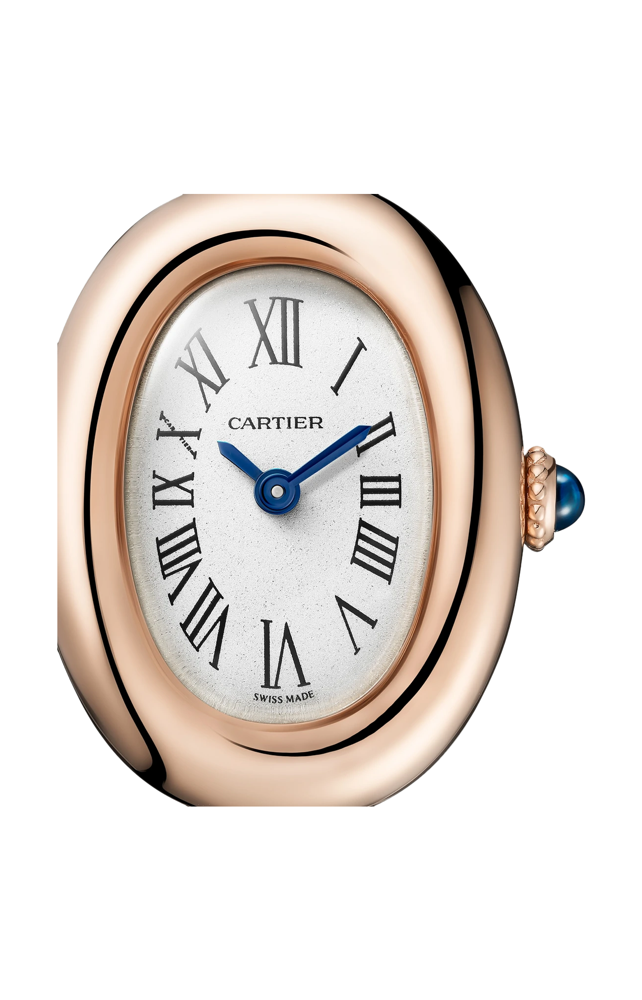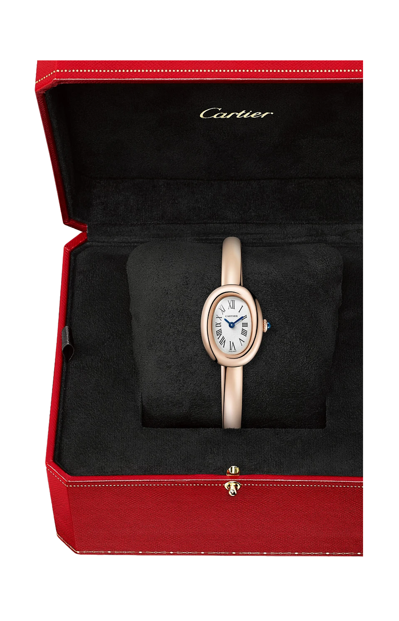 Orologio Baignoire de Cartier, modello mini, misura 17, movimento al quarzo. Cassa in oro rosa 750/1000. Corona perlata in oro rosa 750/1000 ornata di uno zaffiro cabochon. Bracciale rigido in oro rosa 750/1000. Quadrante argentato, lancette a forma di gladio d’acciaio azzurrato, vetro zaffiro. Dimensioni della cassa 24,6 x 18,7 mm, spessore 7,2 mm. Impermeabile fino a 30 metri.
