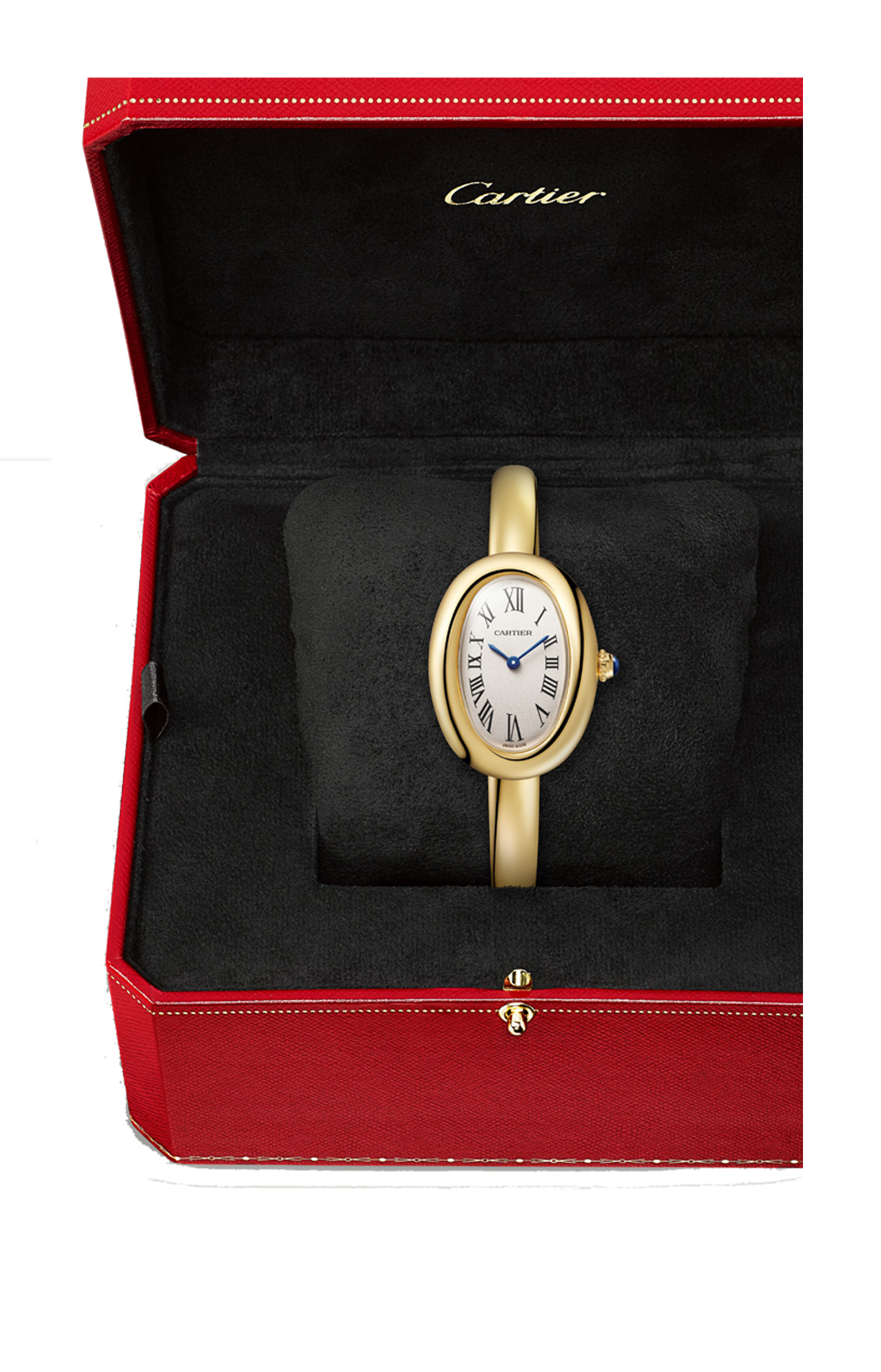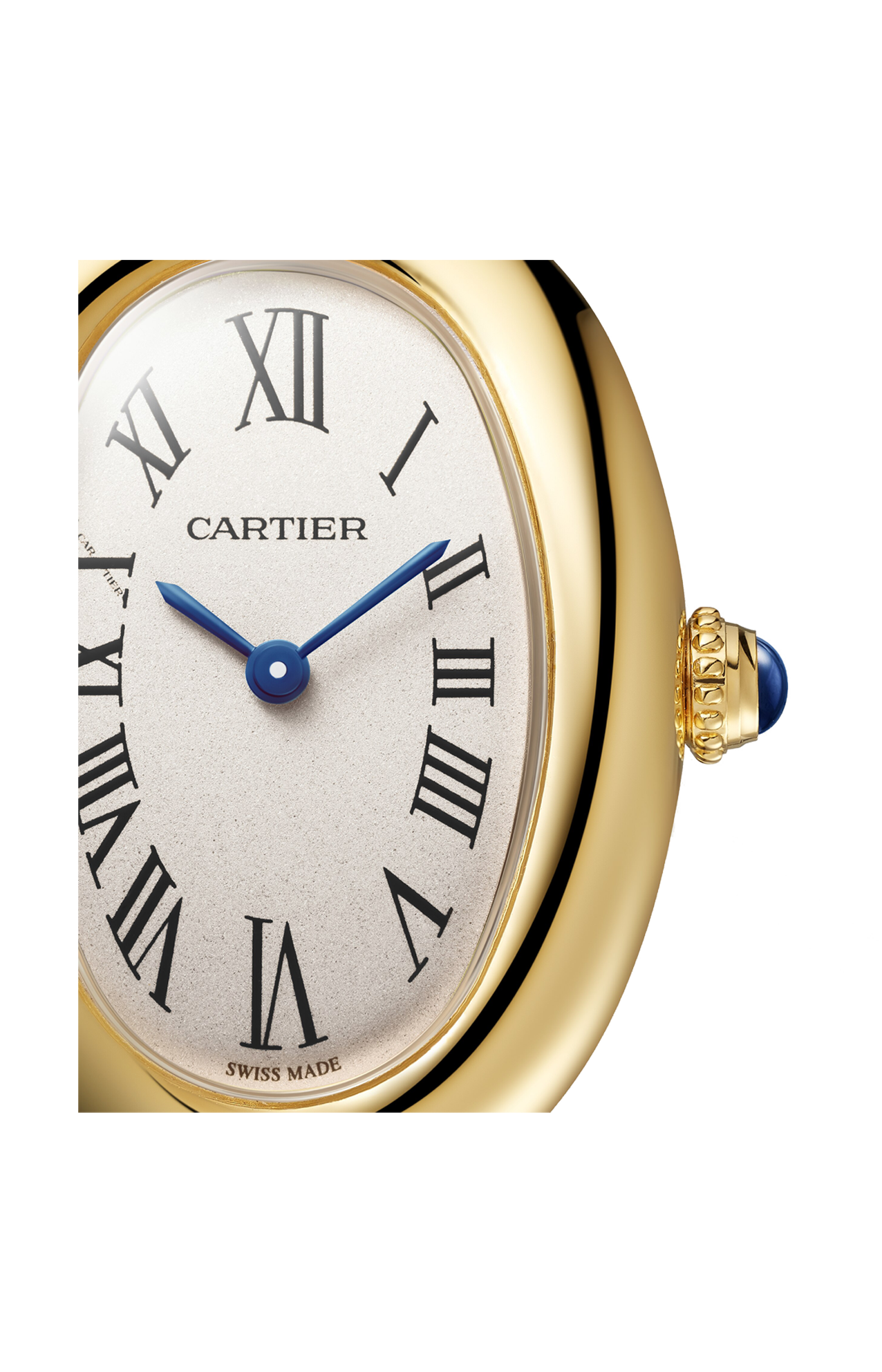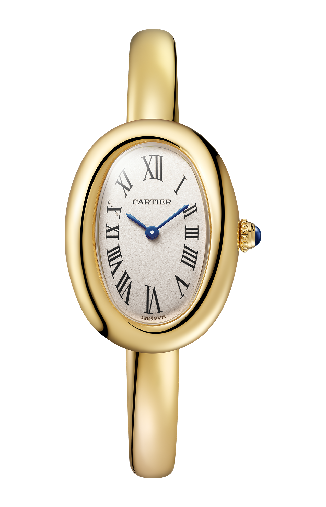 Orologio Baignoire de Cartier, modello piccolo, misura 17, movimento al quarzo. Cassa in oro giallo 750/1000. Corona perlata in oro giallo 750/1000 ornata di uno zaffiro cabochon. Bracciale rigido in oro giallo 750/1000. Quadrante argentato, lancette a forma di gladio d’acciaio azzurrato, vetro zaffiro. Dimensioni della cassa 31,4 x 23,1 mm, spessore 6,9 mm. Impermeabile fino a 30 metri.