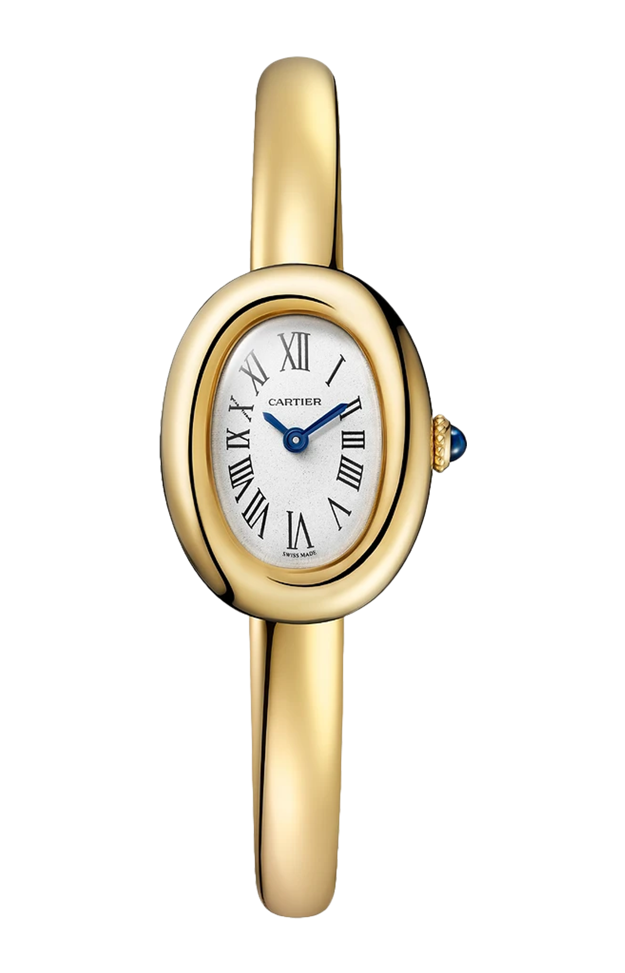 Orologio Baignoire de Cartier, modello mini, misure 16, movimento al quarzo. Cassa in oro giallo 750/1000. Corona perlata in oro giallo 750/1000 ornata di uno zaffiro cabochon. Quadrante argentato, lancette a forma di gladio d’acciaio azzurrato, vetro zaffiro. Bracciale rigido in oro giallo 750/1000. Dimensioni della cassa 24,6 x 18,7 mm, spessore 7,2 mm. Impermeabile fino a 30 metri.
