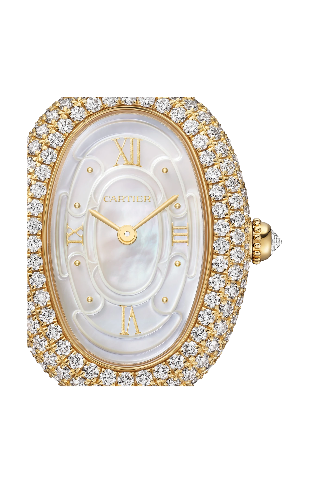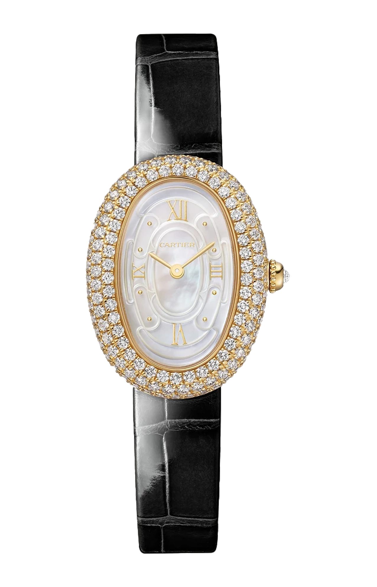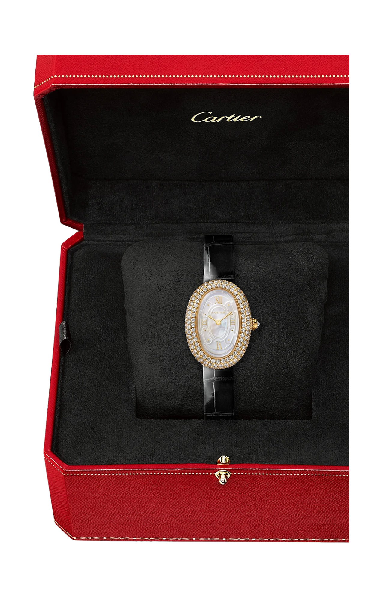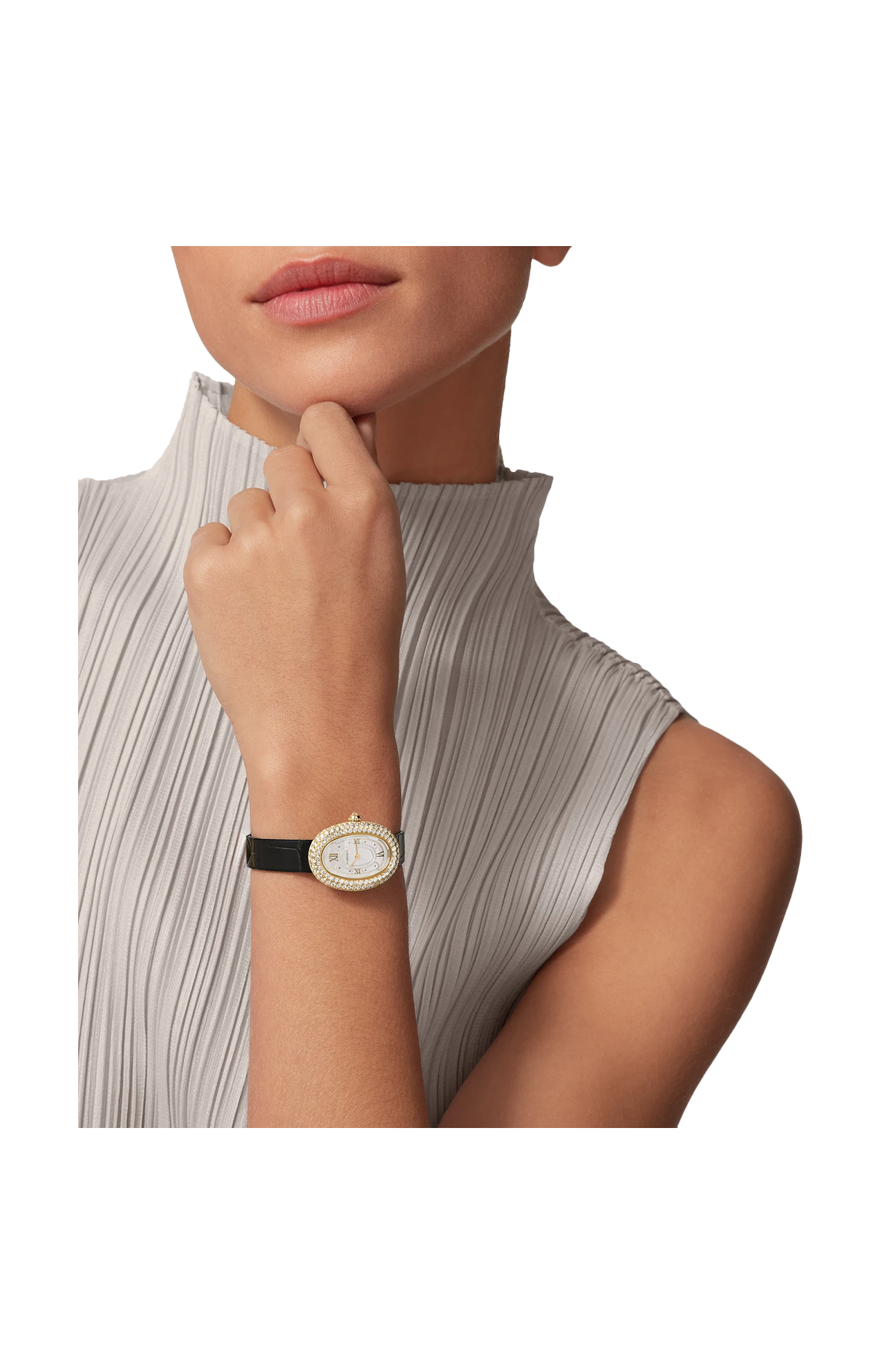 Orologio Baignoire de Cartier, modello piccolo, movimento al quarzo. Cassa in oro giallo 750/1000 ornata di 227 diamanti taglio brillante (2,25 carati). Corona perlata in oro giallo 750/1000 ornata di un diamante (0,08 carati). Quadrante in madreperla, lancette a forma di gladio con finitura oro giallo, vetro zaffiro. Cinturino d’alligatore effetto vernice nera, fibbia ardiglione in oro giallo 750/1000. Dimensioni della cassa 31,4 x 23,1 mm, spessore 6,9 mm. Impermeabile fino a 30 metri.