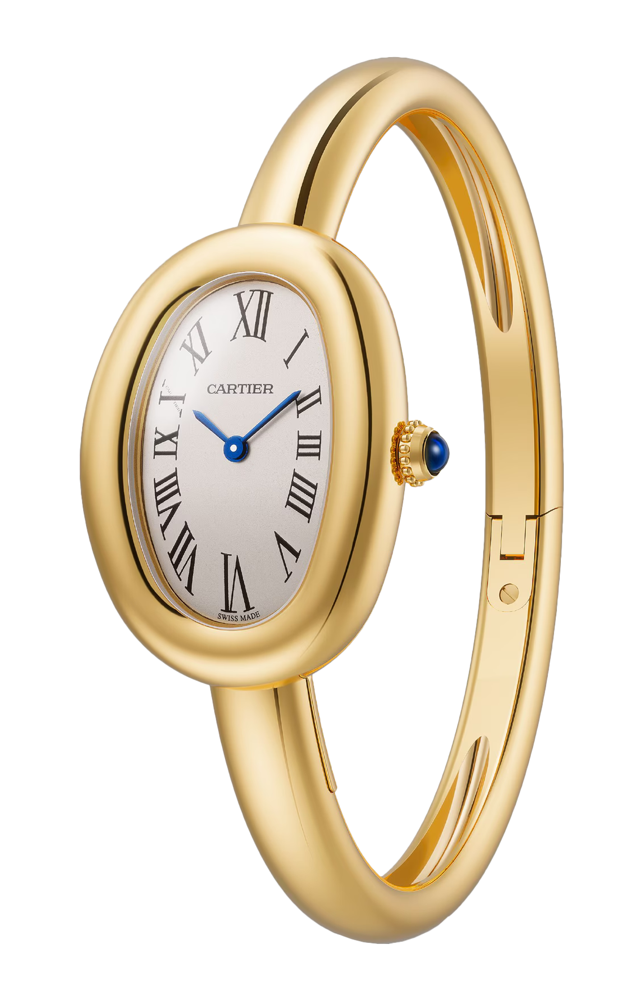 Orologio Baignoire de Cartier, modello piccolo, misura 16, movimento al quarzo. Cassa in oro giallo 18 carati (750/1000). Corona perlata in oro giallo 18 carati (750/1000) incastonata con un cabochon di zaffiro. Bracciale rigido in oro giallo 18 carati (750/1000). Quadrante argentato, lancette a forma di spada in acciaio azzurrato, vetro zaffiro. Lunghezza: 31,4 mm, larghezza: 23,1 mm, spessore: 6,9 mm. Impermeabile fino a 3 bar (circa 30 metri/100 piedi).
